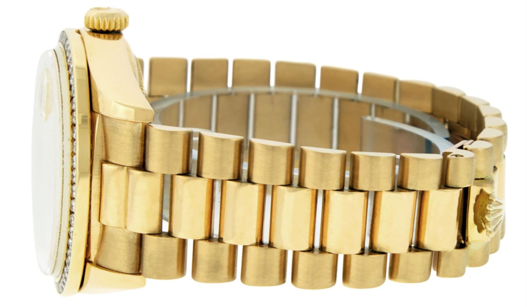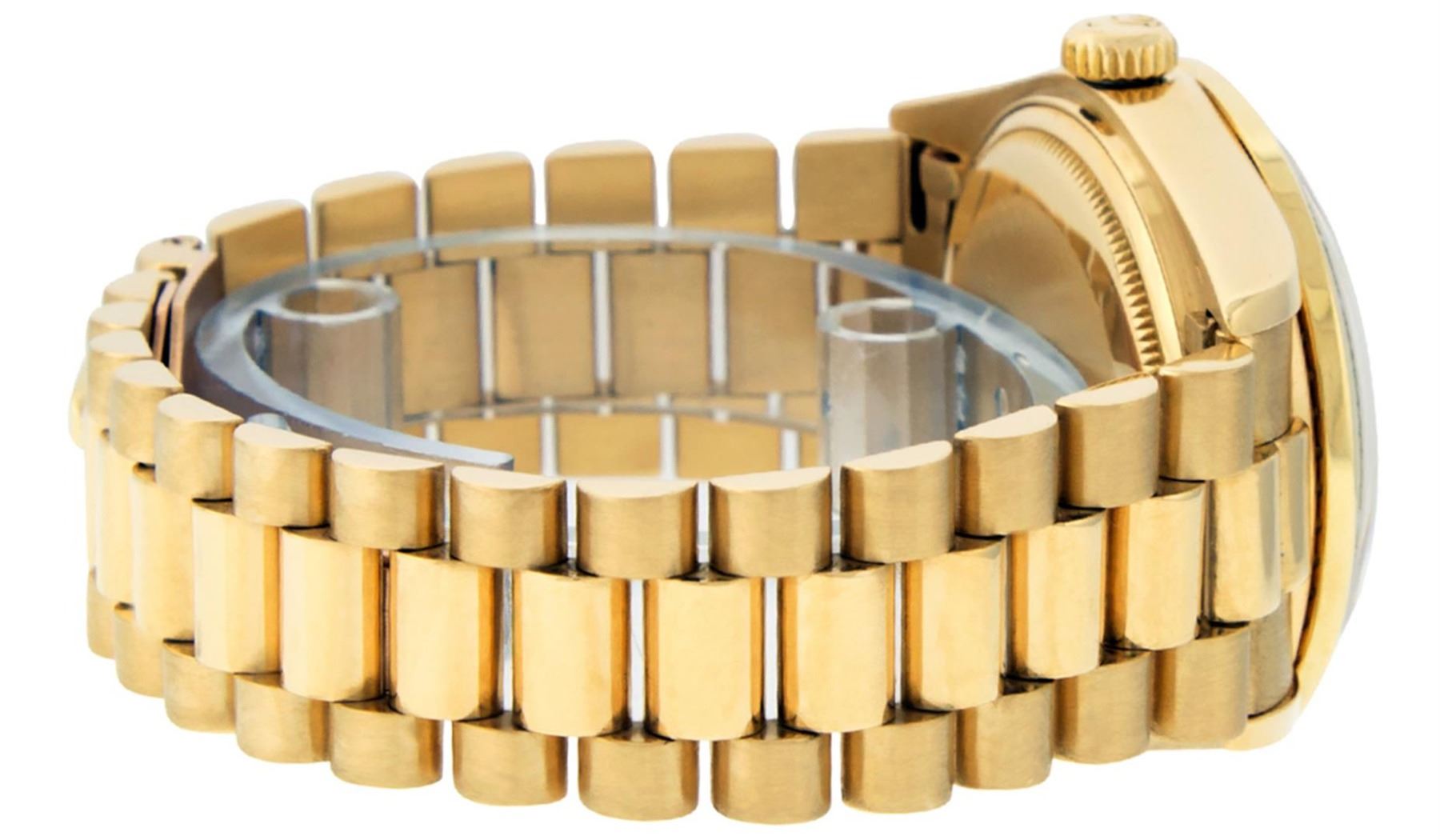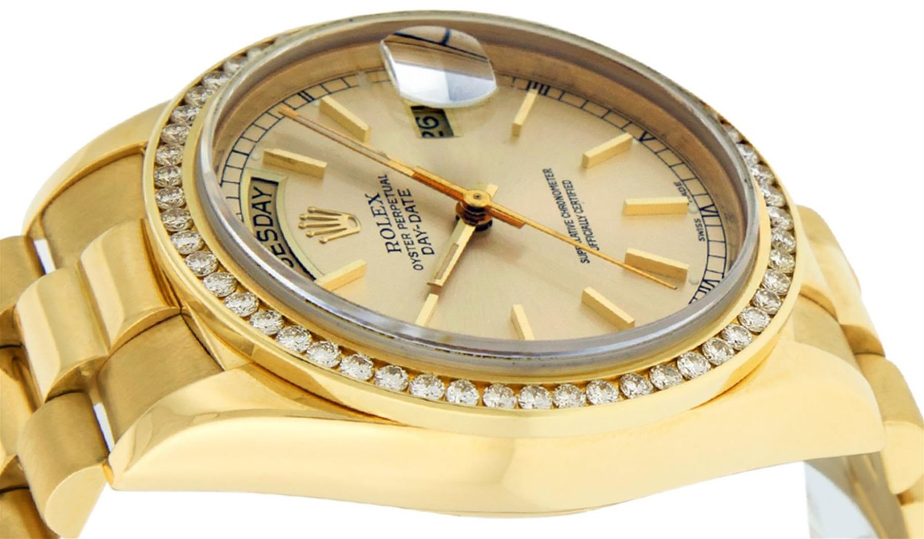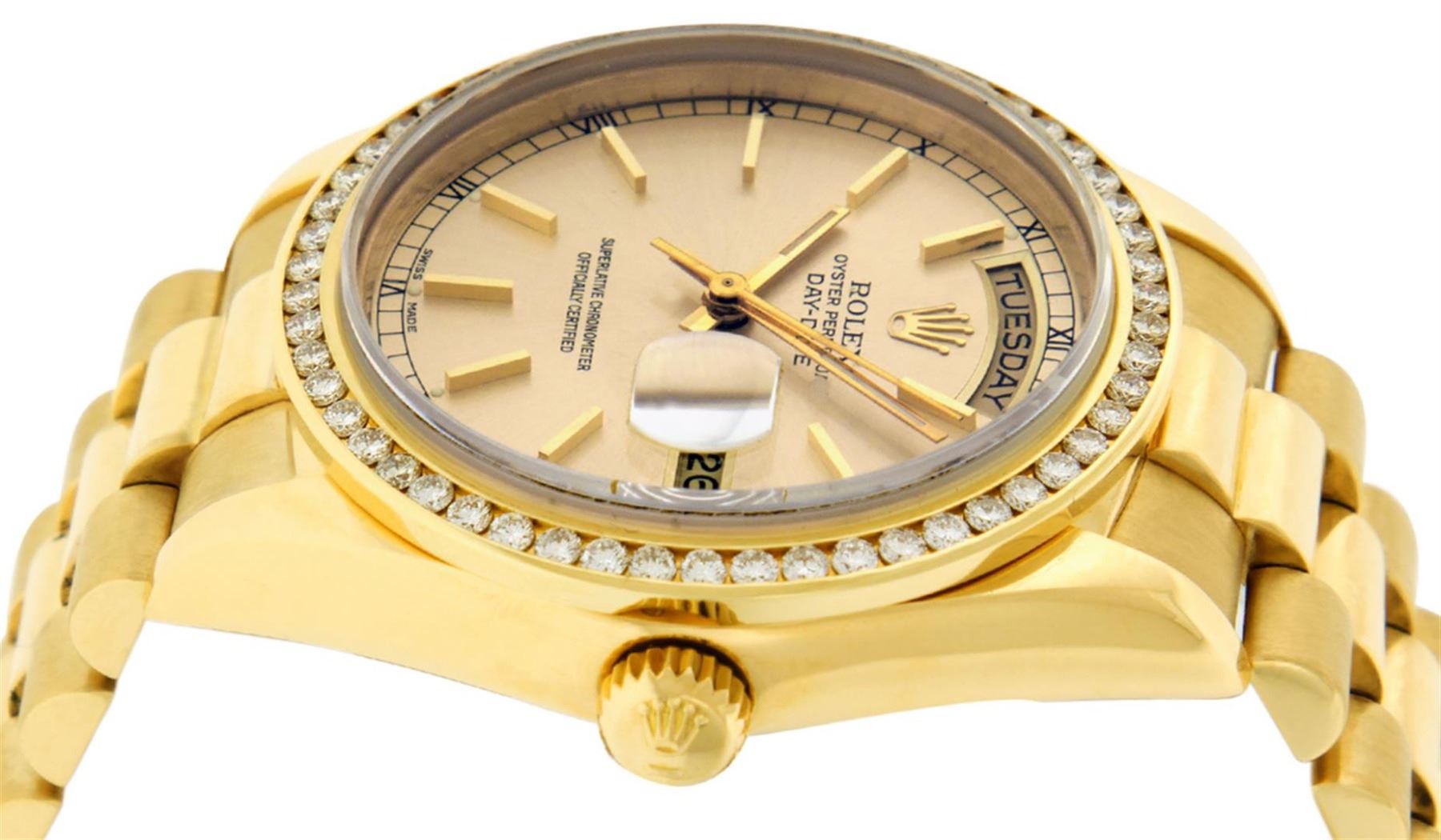 One Mens Rolex Day Date 18K Yellow Gold President Polished, Serviced & Electronically Tested, Rolex 18K Yellow Gold Case: 36mm, Rolex 18K Yellow Gold Crown, Custom Bezel: New 18K Yellow Gold Channel Set Diamond Bezel, Diamond Count: 54 Diamonds On Bezel. Total Bezel Weight 1.3 Carat, Clarity: SI-VS, Color: G to H. Custom Crystal: New Sapphire With Magnified Date Window. Hands: Luminescent Hands. Rolex Movement: Automatic Winding Movement Caliber 3055. Rolex Dial: Champagne Index With Square Roman Track And Lumi Dot. Date Window: 3 O'Clock Position Date Display, Day Window: 12 O'Clock Position Date Display. Quickset, Model: Day Date Quickset President. Condition: G-6 Extra Fine. Rolex Bracelet: 18K Yellow Gold President Band. Bright Polish. 7.0 Inch Length, Standard Hidden President Clasp, With Rolex Logo. This Pre Owned Watch Has Been Serviced Time Tested And Is In Excellent Condition It Is Free Of All Scratches And Dents.