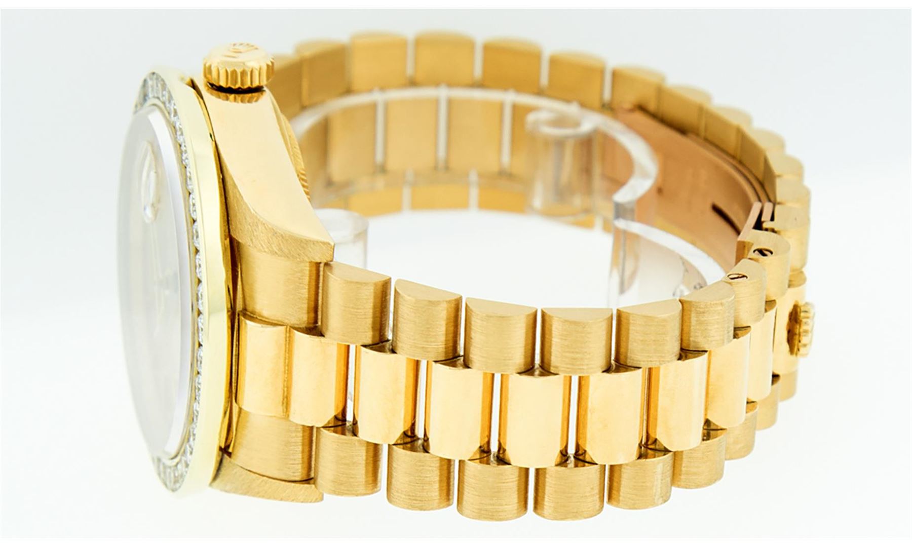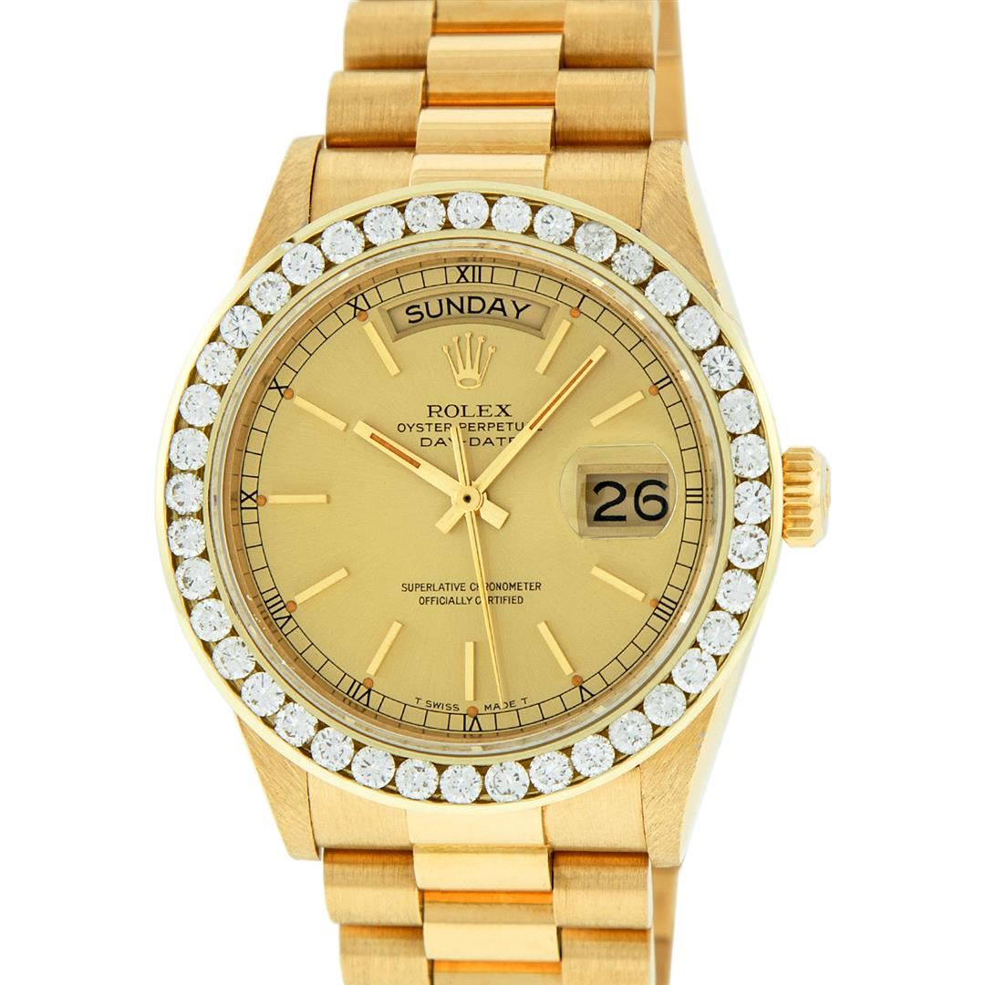 One Mens Rolex Day Date 18K Yellow Gold President Polished, Serviced & Electronically Tested, Rolex 18K Yellow Gold Case: 36mm, Rolex 18K Yellow Gold Crown, Custom Bezel: New 18K Yellow Gold Channel Bezel Set With Genuine Diamonds, Diamond Count: 40 Diamonds On Bezel Bezel. Total Bezel Weight 3.0 Carat, Clarity: SI-VS, Color: G to H. Custom Crystal: New Sapphire With Magnified Date Window. Hands: Luminescent Hands. Rolex Movement: Automatic Winding Movement Caliber 3055. Rolex Dial: Champagne Index With Square Roman Track And Lumi Dots. Date Window: 3 O'Clock Position Date Display, Day Window: 12 O'Clock Position Date Display. Quickset, Model: Day Date Quickset President. Condition: G-6 Extra. Rolex Bracelet: 18K Yellow Gold President. Bright Polish. 7.0 Inch Length, Standard Hidden President Clasp President Band, With Rolex Logo. This Pre Owned Watch Has Been Serviced Time Tested And Is In Excellent Condition It Is Free Of All Scratches And Dents.