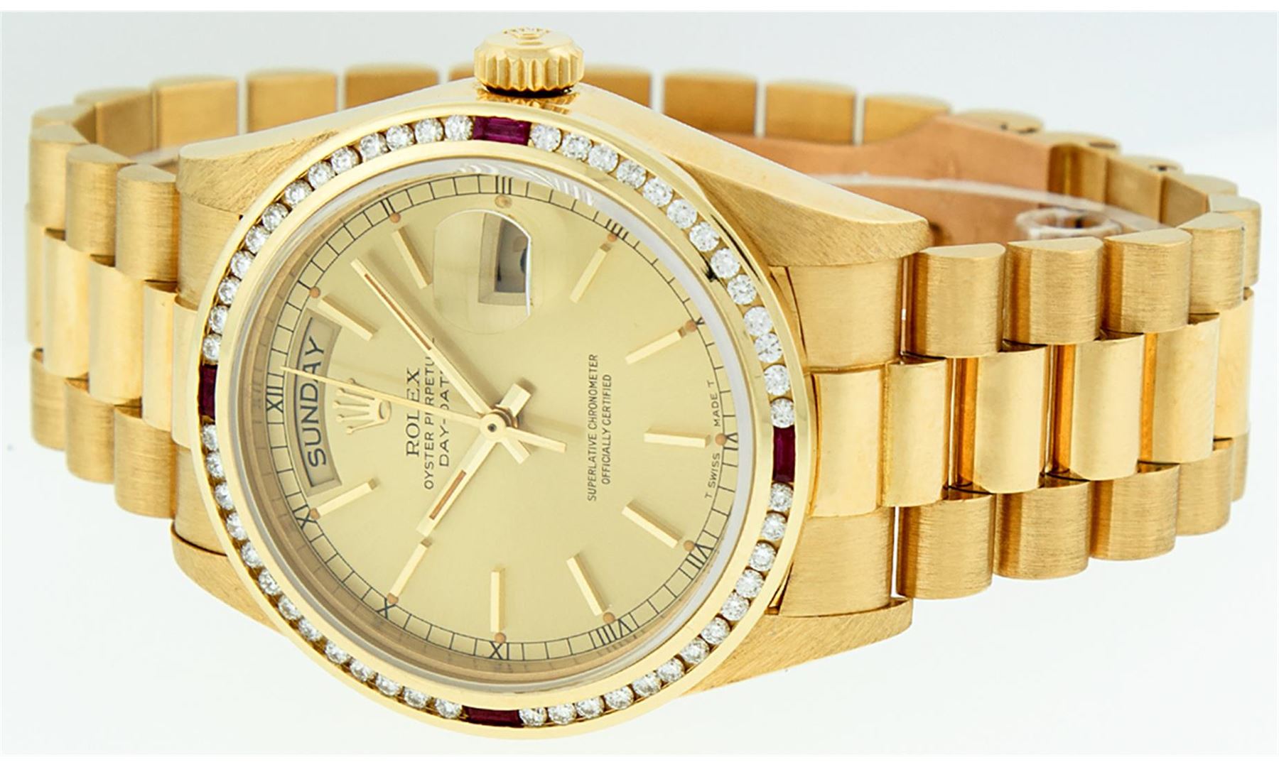 One Mens Rolex Day Date 18K Yellow Gold President Polished, Serviced & Electronically Tested, Rolex 18K Yellow Gold Case: 36mm, Rolex 18K Yellow Gold Crown, Custom Bezel: New 18K Yellow Gold Channel Set With Custom Added Genuine Rubies and Diamonds, Diamond + Stone Count: 52 Diamonds + 4 Rubies On Bezel. Total Weight 1.30 Carat, Clarity: SI-VS, Color: G to H. Custom Crystal: New Sapphire With Magnified Date Window. Hands: Luminescent Hands. Rolex Movement: Automatic Winding Movement Caliber 3055. Rolex Dial: Champagne Index With Roman Track & Lumi Dots. Date Window: 3 O'Clock Position Date Display, Day Window: 12 O'Clock Position Date Display. Quickset, Model: Day Date Quickset President. Condition: G-6 Extra Fine. Rolex Bracelet: 18K Yellow Gold President Band. Bright Polish. 7.0 Inch Length, Standard Hidden President Clasp President Band, With Rolex Logo. This Pre Owned Watch Has Been Serviced Time Tested And Is In Excellent Condition It Is Free Of All Scratches And Dents.