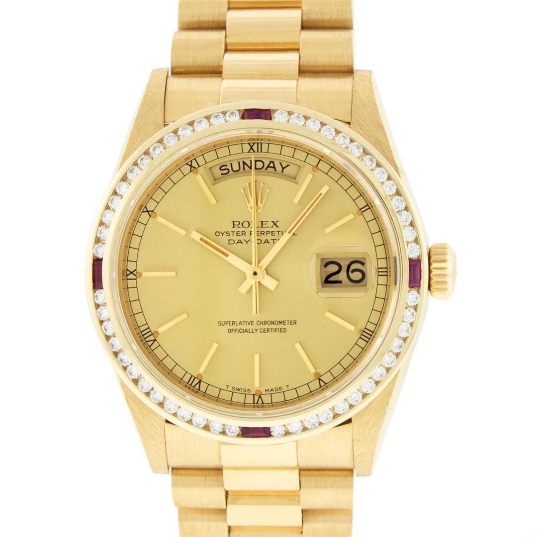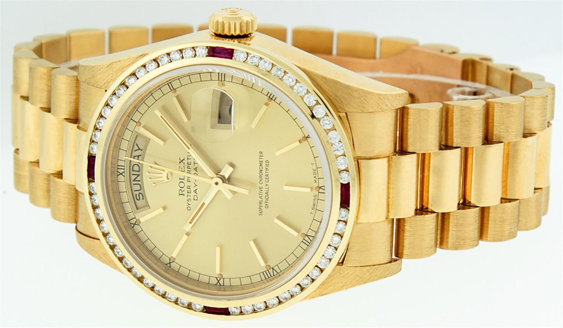 One Mens Rolex Day Date 18K Yellow Gold President Polished, Serviced & Electronically Tested, Rolex 18K Yellow Gold Case: 36mm, Rolex 18K Yellow Gold Crown, Custom Bezel: New 18K Yellow Gold Channel Set With Custom Added Genuine Rubies and Diamonds, Diamond + Stone Count: 52 Diamonds + 4 Rubies On Bezel. Total Weight 1.30 Carat, Clarity: SI-VS, Color: G to H. Custom Crystal: New Sapphire With Magnified Date Window. Hands: Luminescent Hands. Rolex Movement: Automatic Winding Movement Caliber 3055. Rolex Dial: Champagne Index With Roman Track & Lumi Dots. Date Window: 3 O'Clock Position Date Display, Day Window: 12 O'Clock Position Date Display. Quickset, Model: Day Date Quickset President. Condition: G-6 Extra Fine. Rolex Bracelet: 18K Yellow Gold President Band. Bright Polish. 7.0 Inch Length, Standard Hidden President Clasp President Band, With Rolex Logo. This Pre Owned Watch Has Been Serviced Time Tested And Is In Excellent Condition It Is Free Of All Scratches And Dents.