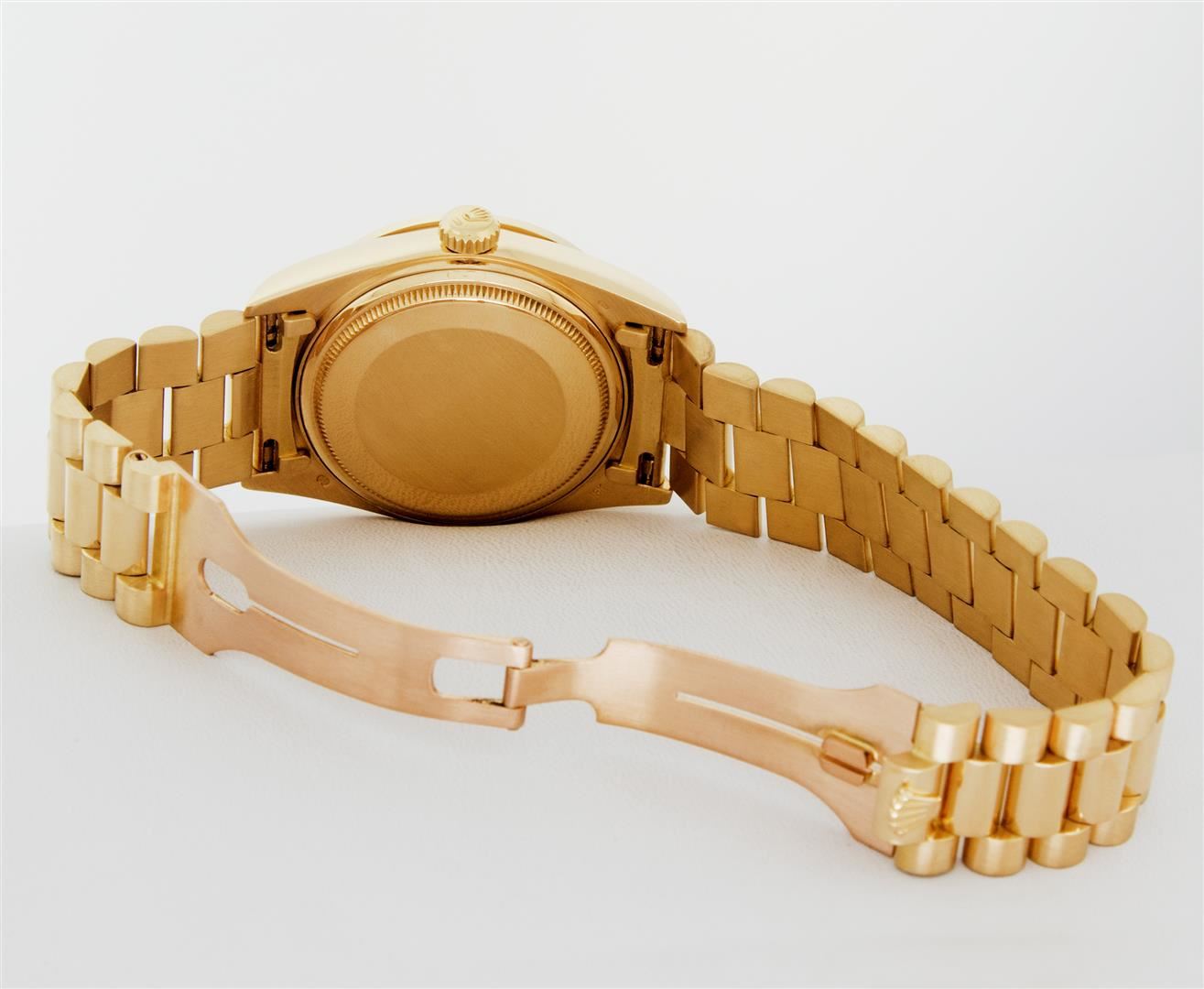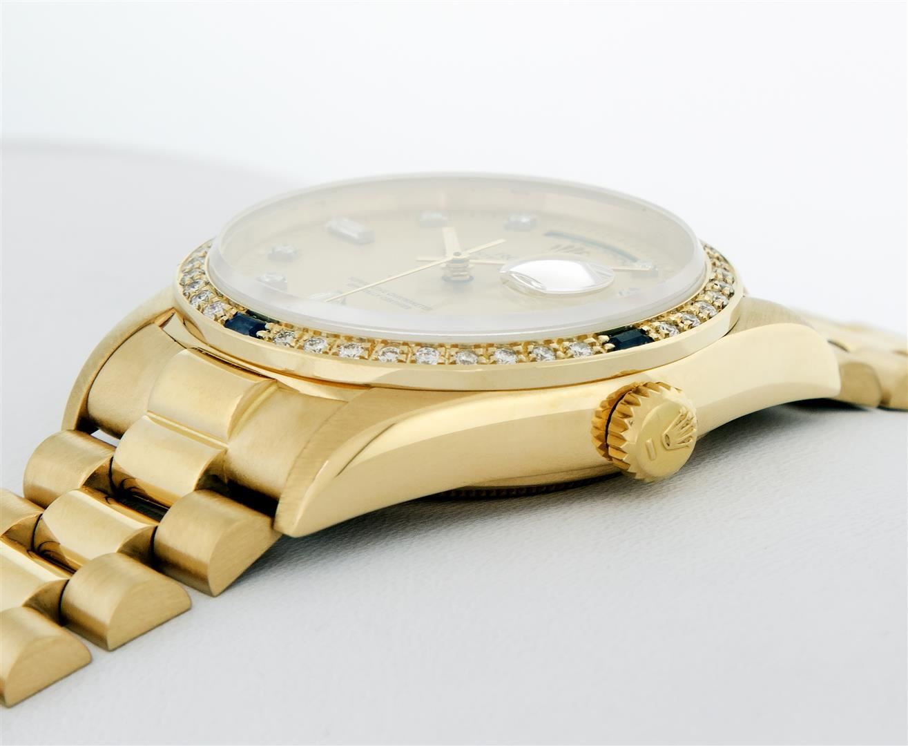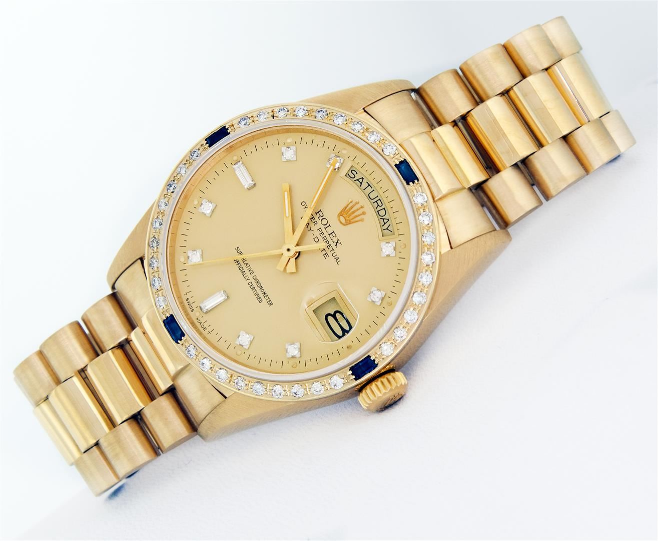 One Mens Quickset Rolex Day Date 18K Yellow Gold President Polished, Serviced & Electronically Tested, Rolex 18K Yellow Gold Case: 36mm, Rolex 18K Yellow Gold Crown, Custom Bezel: New 18K Yellow Diamond + Sapphire Beadset Bezel, Stone Count: 36 Diamonds + 4 Sapphires, Total Weight .75 Carat, Clarity: SI-VS, Color: G to H. Custom Crystal: New Sapphire With Magnified Date Window. Custom Hands: New Luminescent Hands. Rolex Movement: Automatic Quickset Winding Movement Caliber 3055. Rolex Dial: Factory Champagne Diamond Dial With Dash Track And Lumi Dots, Stone Count: 8 Diamonds + 2 Baguette Diamonds, Clarity: VS. Date Window: 3 O'Clock Position, Day Display: 12 O'Clock Position, Single Quickset, Model: Day Date Quickset President. Condition: G-6 Extra Fine. Rolex Bracelet: 18K Yellow Gold President Band With Hidden Clasp, Bright & Satin Polish. 7.0 Inch Length, Standard Hidden President Clasp, With Rolex Logo. This Pre Owned Watch Has Been Serviced Time Tested And Is In Excellent Condition It Is Free Of All Scratches And Dents.