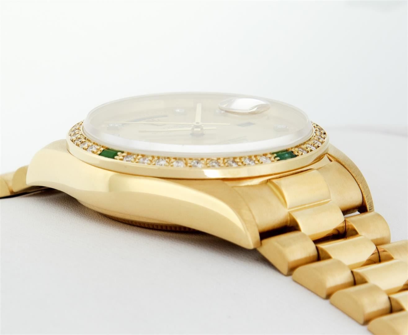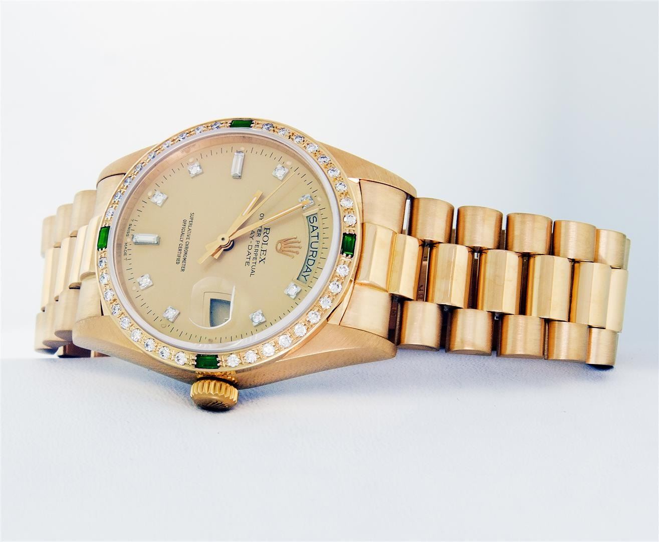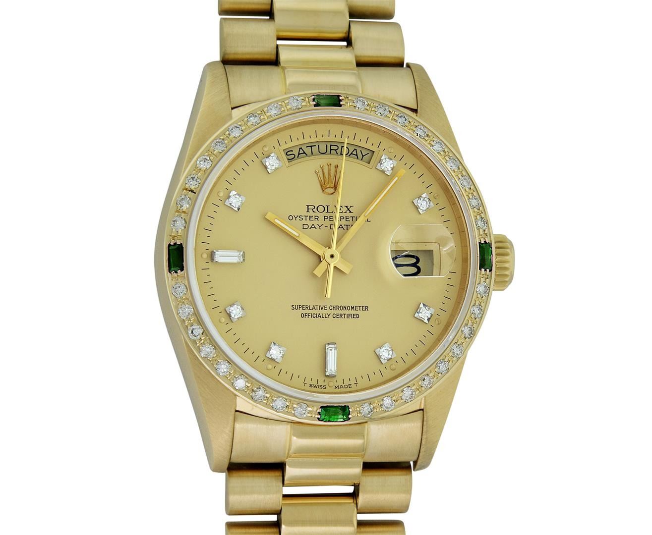 One Mens Quickset Rolex Day Date 18K Yellow Gold President Polished, Serviced & Electronically Tested, Rolex 18K Yellow Gold Case: 36mm, Rolex 18K Yellow Gold Crown, Custom Bezel: New 18K Yellow Diamond + Emerald Beadset Bezel, Stone Count: 36 Diamonds + 4 Emeralds, Total Weight .75 Carat, Clarity: SI-VS, Color: G to H. Custom Crystal: New Sapphire With Magnified Date Window. Custom Hands: New Luminescent Hands. Rolex Movement: Automatic Quickset Winding Movement Caliber 3055. Rolex Dial: Factory Champagne Diamond Dial With Dash Track And Lumi Dots, Stone Count: 8 Diamonds + 2 Baguettes, Clarity: VS. Date Window: 3 O'Clock Position, Day Display: 12 O'Clock Position, Single Quickset, Model: Day Date Quickset President. Condition: G-6 Extra Fine. Rolex Bracelet: 18K Yellow Gold President Band With Hidden Clasp, Bright & Satin Polish. 7.0 Inch Length, Hidden President Clasp, With Rolex Logo. This Pre Owned Watch Has Been Serviced Time Tested And Is In Excellent Condition It Is Free Of All Scratches And Dents.
