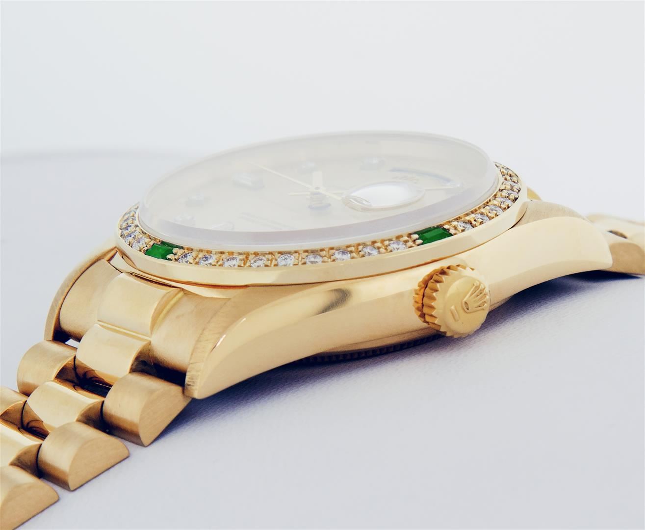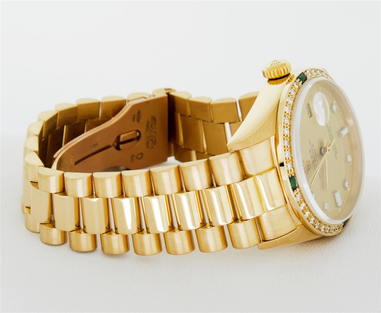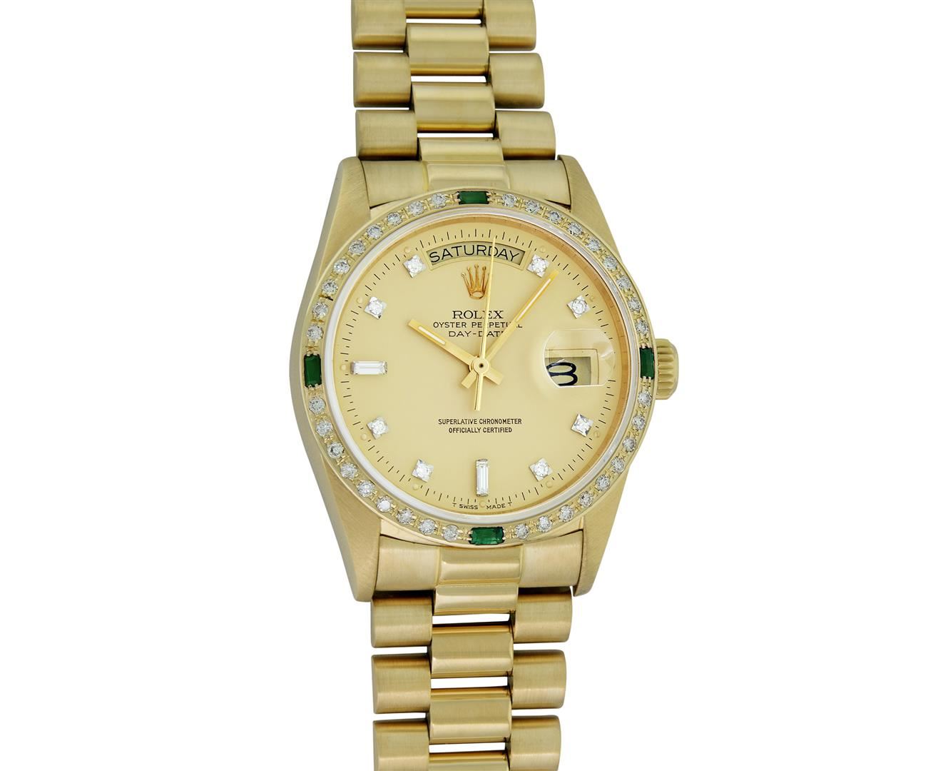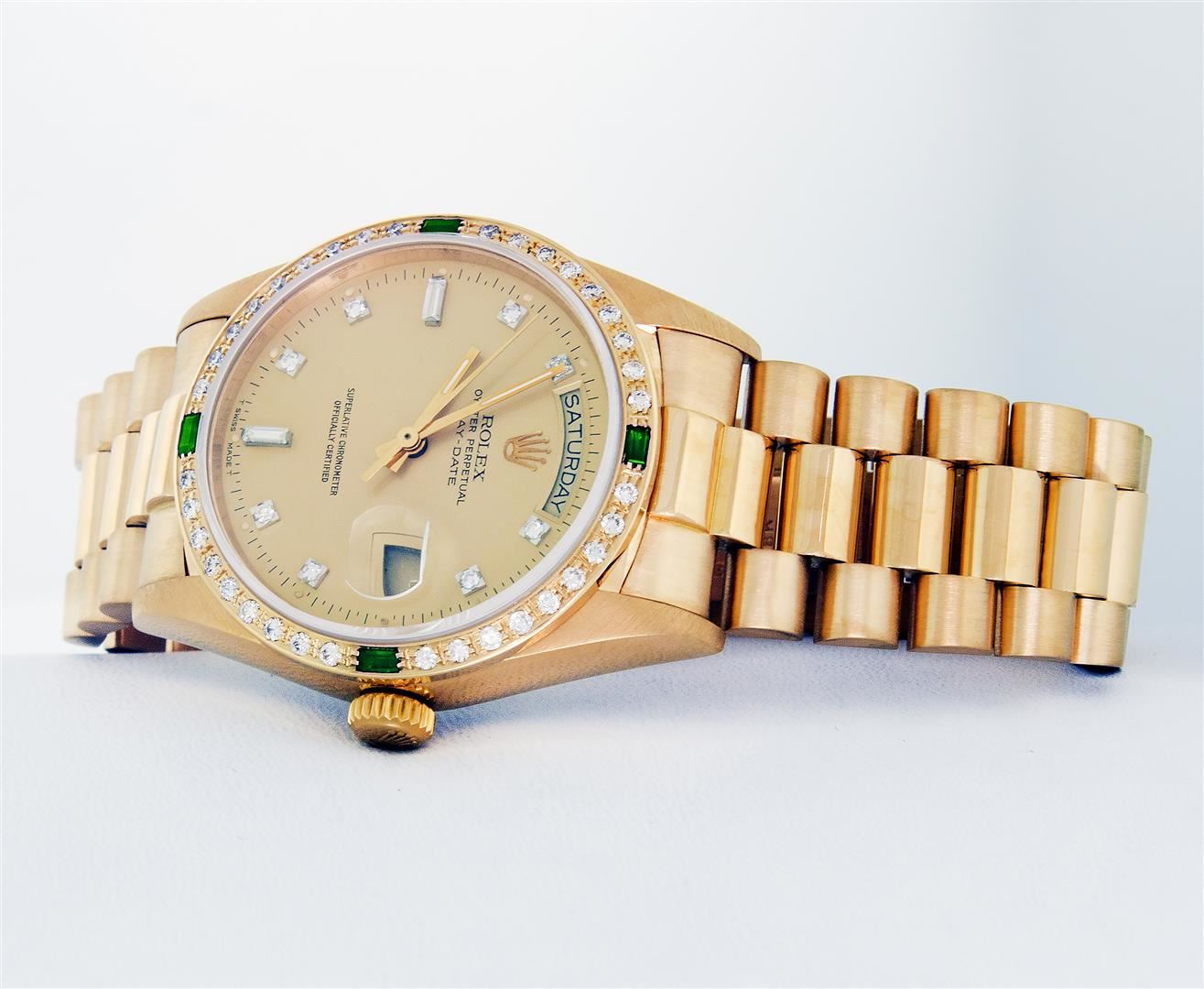 One Mens Quickset Rolex Day Date 18K Yellow Gold President Polished, Serviced & Electronically Tested, Rolex 18K Yellow Gold Case: 36mm, Rolex 18K Yellow Gold Crown, Custom Bezel: New 18K Yellow Diamond + Emerald Beadset Bezel, Stone Count: 36 Diamonds + 4 Emeralds, Total Weight.75 Carat, Clarity: SI-VS, Color: G to H. Custom Crystal: New Sapphire With Magnified Date Window. Custom Hands: New Luminescent Hands. Rolex Movement: Automatic Quickset Winding Movement Caliber 3055. Rolex Dial: Factory Champagne Diamond Dial With Dash Track And Lumi Dots, Stone Count: 8 Diamonds + 2 Baguettes, Clarity: VS. Date Window: 3 O'Clock Position, Day Display: 12 O'Clock Position, Single Quickset, Model: Day Date Quickset President. Condition: G-6 Extra Fine. Rolex Bracelet: 18K Yellow Gold President Band With Hidden Clasp, Bright & Satin Polish. 7.0 Inch Length, Hidden President Clasp, With Rolex Logo. This Pre Owned Watch Has Been Serviced Time Tested And Is In Excellent Condition It Is Free Of All Scratches And Dents.