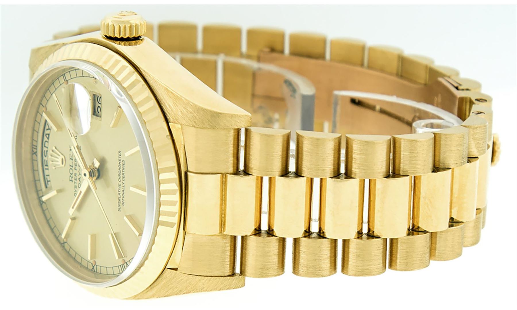 One Mens Quickset Rolex Day Date 18K Yellow Gold President Polished, Serviced & Electronically Tested, Rolex 18K Yellow Gold Case: 36mm, Rolex 18K Yellow Gold Crown, Rolex Bezel: 18K Yellow Gold Fluted Bezel. Crystal: Sapphire With Magnified Date Window. Hands: Luminescent Hands. Rolex Movement: Automatic Quickset Winding Movement Caliber 3055. Rolex Dial: Champagne Index With Roman Track & Lumi Dots. Date Window: 3 O'Clock Position, Day Display: 12 O'Clock Position, Single Quickset, Model: Day Date Quickset President. Condition: G-6 Extra Fine. Rolex Bracelet: 18K Yellow Gold President Band With Hidden Clasp, Bright & Satin Polish. 7.0 Inch Length, Standard Hidden President Clasp, With Rolex Logo. This Pre Owned Watch Has Been Serviced Time Tested And Is In Excellent Condition It Is Free Of All Scratches And Dents.