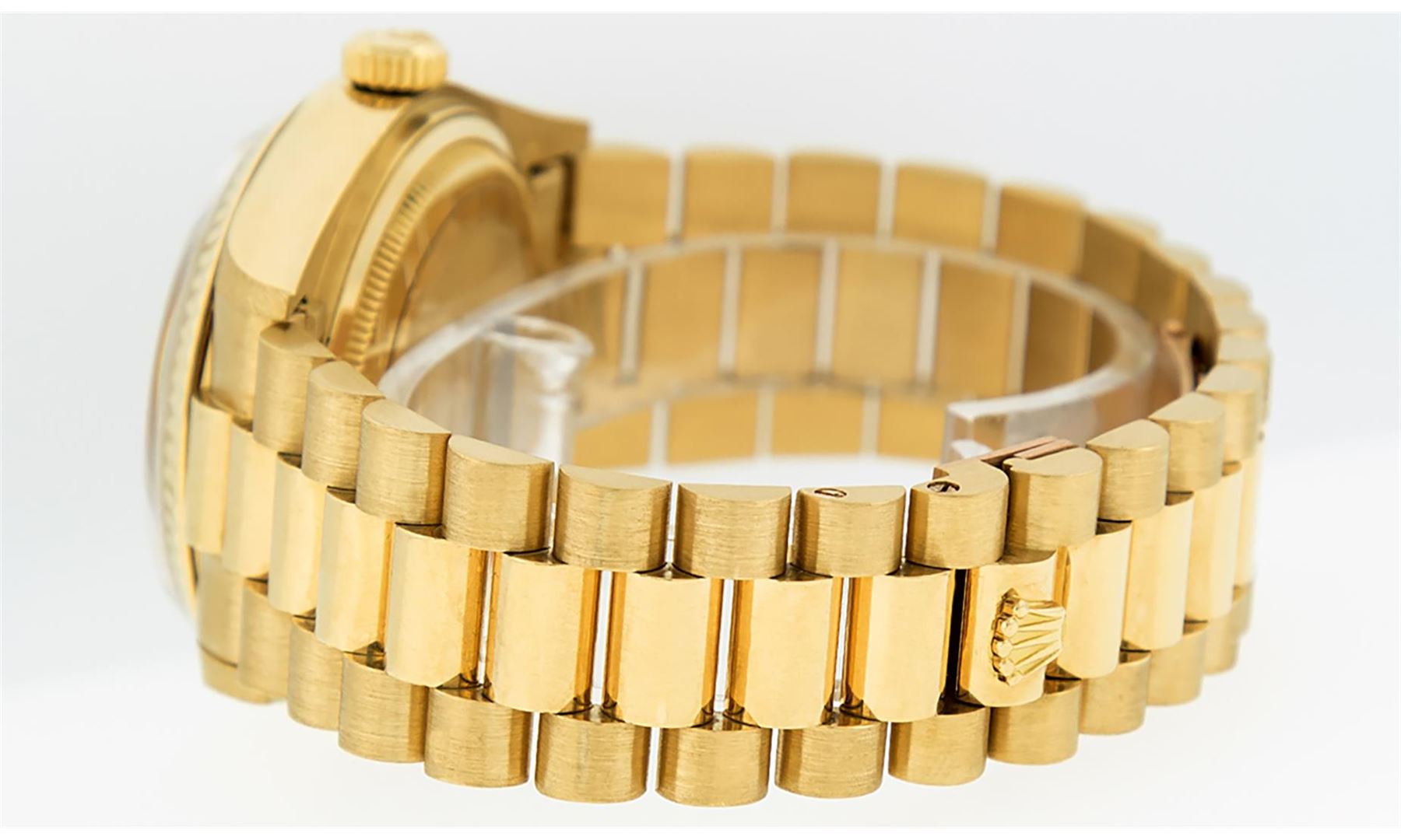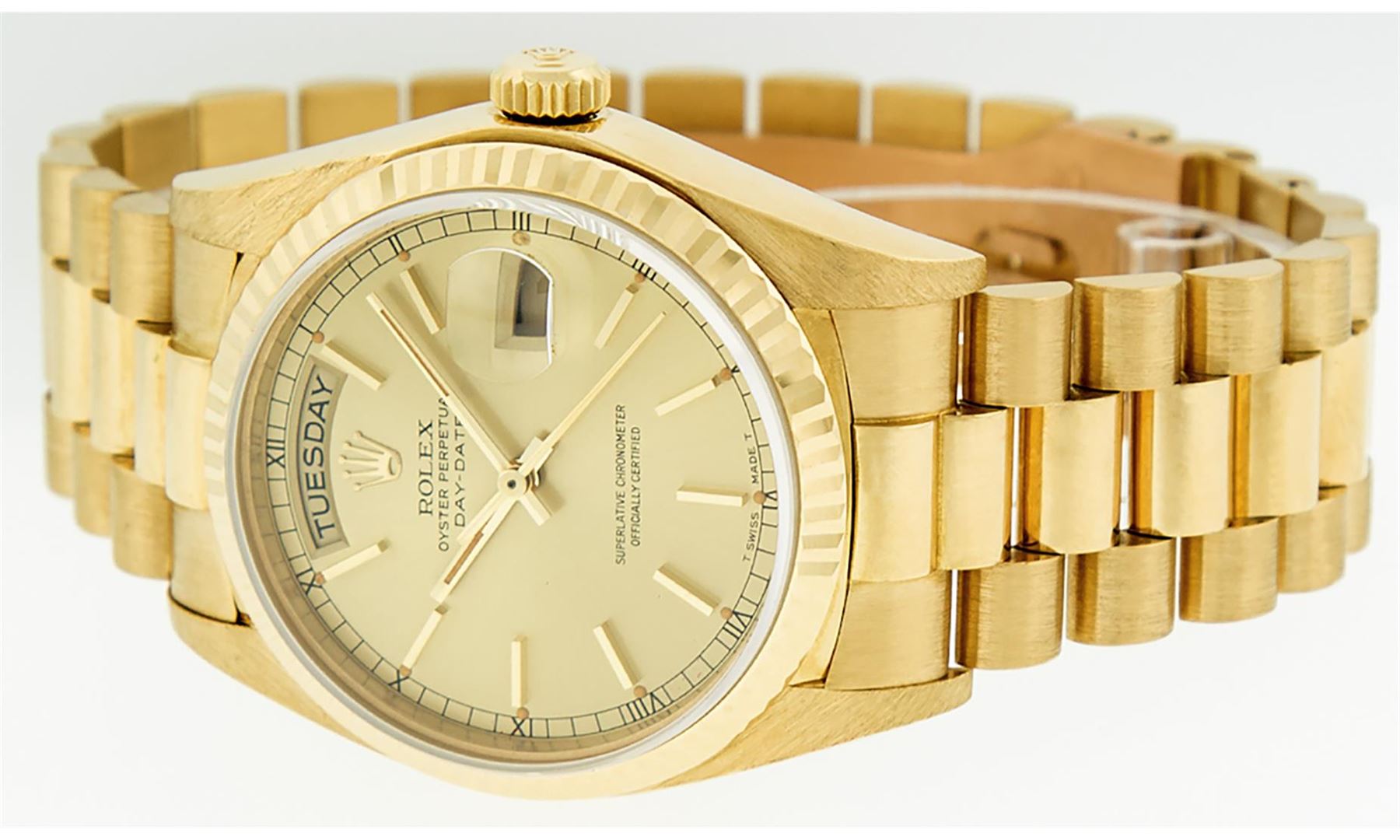 One Mens Quickset Rolex Day Date 18K Yellow Gold President Polished, Serviced & Electronically Tested, Rolex 18K Yellow Gold Case: 36mm, Rolex 18K Yellow Gold Crown, Rolex Bezel: 18K Yellow Gold Fluted Bezel. Crystal: Sapphire With Magnified Date Window. Hands: Luminescent Hands. Rolex Movement: Automatic Quickset Winding Movement Caliber 3055. Rolex Dial: Champagne Index With Roman Track & Lumi Dots. Date Window: 3 O'Clock Position, Day Display: 12 O'Clock Position, Single Quickset, Model: Day Date Quickset President. Condition: G-6 Extra Fine. Rolex Bracelet: 18K Yellow Gold President Band With Hidden Clasp, Bright & Satin Polish. 7.0 Inch Length, Standard Hidden President Clasp, With Rolex Logo. This Pre Owned Watch Has Been Serviced Time Tested And Is In Excellent Condition It Is Free Of All Scratches And Dents.