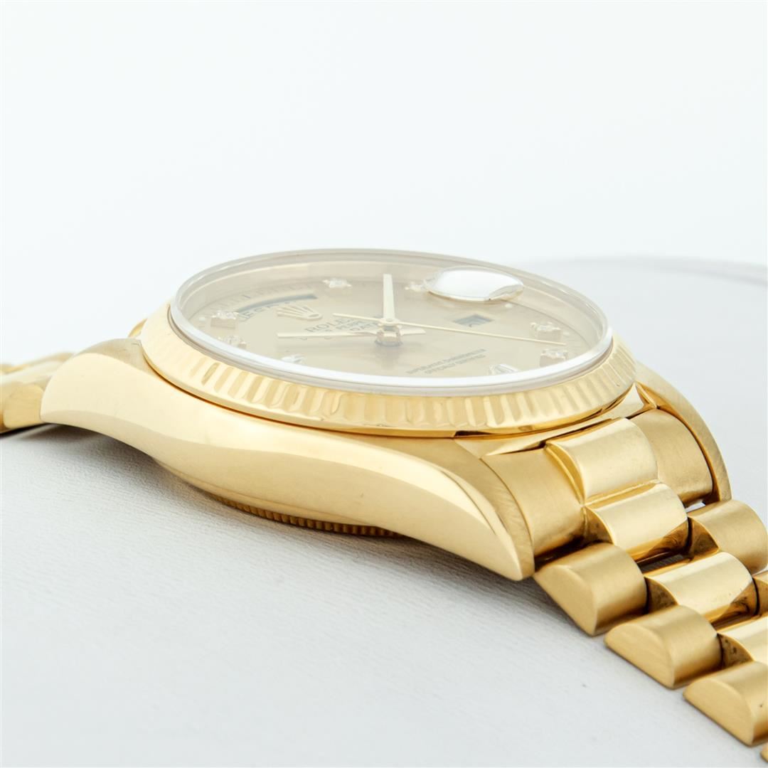 One Mens Quickset Rolex Day Date 18K Yellow Gold President Polished, Serviced & Electronically Tested, Rolex 18K Yellow Gold Case: 36mm, Rolex 18K Yellow Gold Crown, Rolex Bezel: 18K Yellow Gold Fluted Bezel. Crystal: Sapphire With Magnified Date Window. Rolex Movement: Automatic Quickset Winding Movement Caliber 3055. Rolex Dial: Factory Champagne Diamond Dial With Dash Track And Lumi Dots, Stone Count: 8 Diamonds + 2 Baguette Diamonds, Clarity: VS. Date Window: 3 O'Clock Position, Day Display: 12 O'Clock Position, Single Quickset, Model: Day Date Quickset President. Condition: G-6 Extra Fine. Rolex Bracelet: 18K Yellow Gold President Band With Hidden Clasp, Bright & Satin Polish. 7.0 Inch Length, Standard Hidden President Clasp, With Rolex Logo. This Pre Owned Watch Has Been Serviced Time Tested And Is In Excellent Condition It Is Free Of All Scratches And Dents.