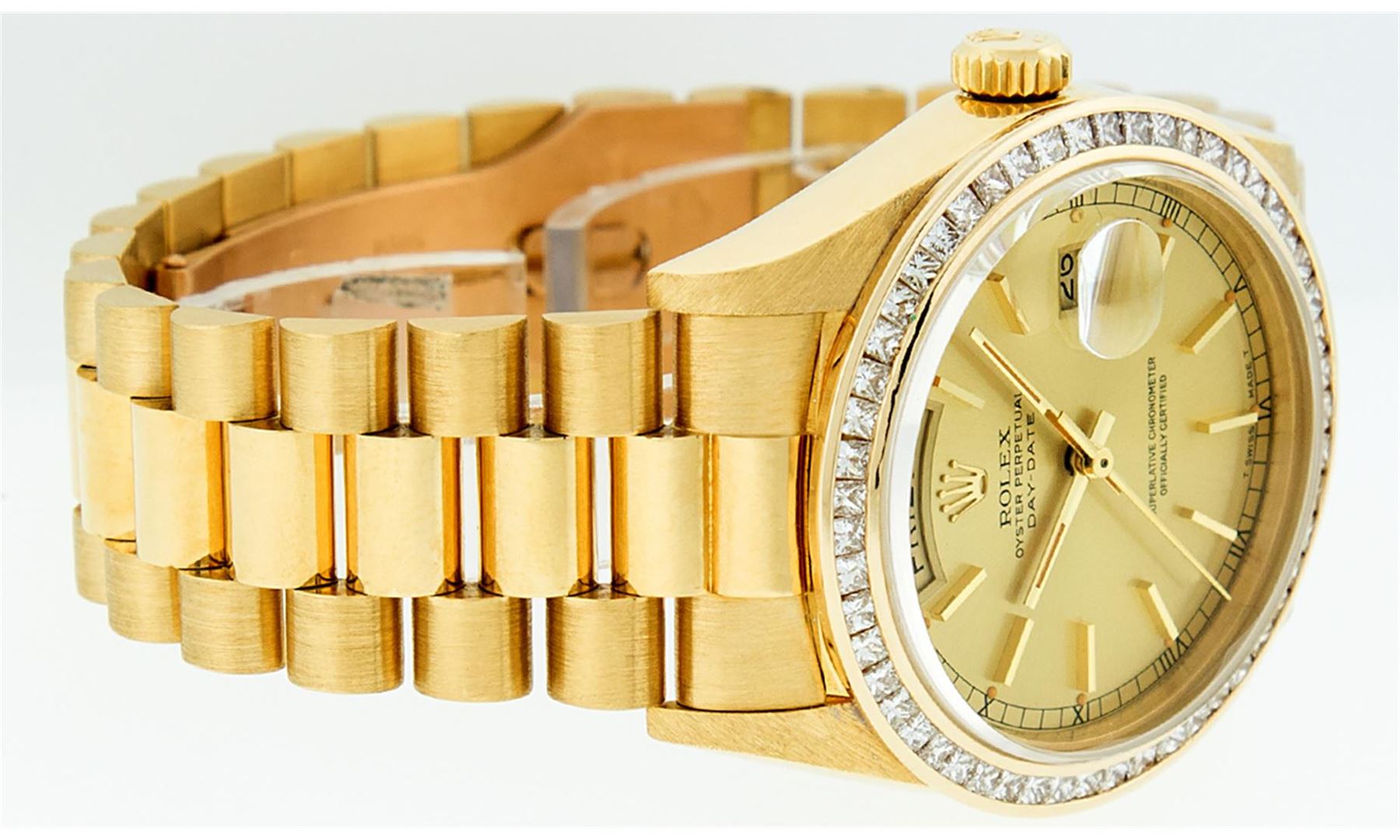 One Mens Rolex Day Date 18K Yellow Gold President Polished, Serviced & Electronically Tested, Rolex 18K Yellow Gold Case: 36mm, Rolex 18K Yellow Gold Crown, Custom Bezel: New 14K Yellow Gold Princess Cut Diamond Bezel, Diamond Count: 53 Diamonds On Bezel. Total Weight 2.75 Carat, Clarity: SI-VS, Color: G to H. Custom Crystal: New Sapphire With Magnified Date Window. Hands: Luminescent Hands. Rolex Movement: Automatic Winding Movement Caliber 3055. Rolex Dial: Champagne Index Dial With Square Roman Track And Lumi Dots. Date Window: 3 O'Clock Position Date Display, Day Window: 12 O'Clock Position Date Display. Quickset, Model: Day Date Quickset President. Condition: G-6 Extra. Rolex Bracelet: 18K Yellow Gold President Band. Bright Polish. 7.0 Inch Length, Standard Hidden President Clasp President Band, With Rolex Logo. This Pre Owned Watch Has Been Serviced Time Tested And Is In Excellent Condition It Is Free Of All Scratches And Dents.