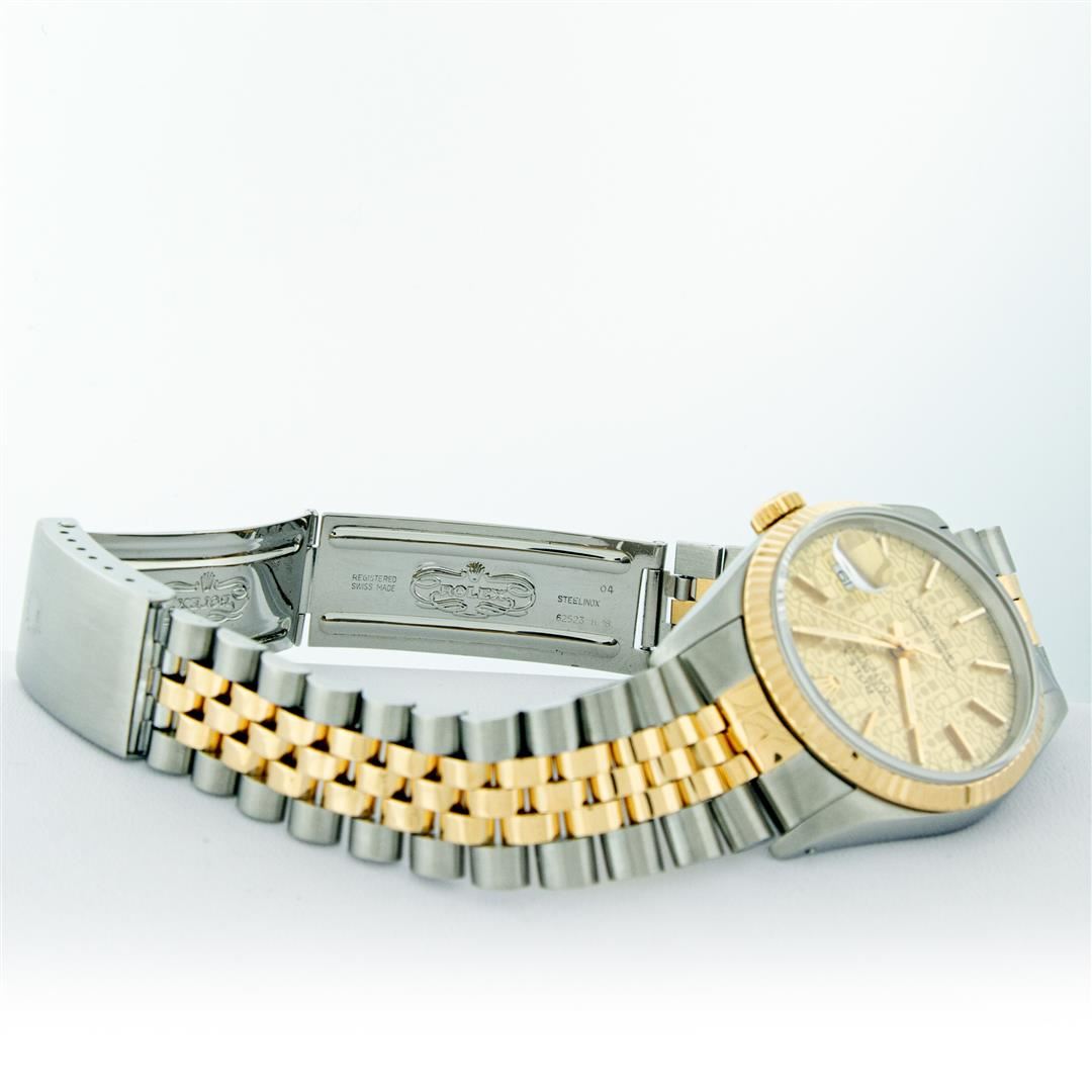 One Mens Rolex Pre Owned Two Tone 14K Yellow Gold And Stainless Steel Datejust Polished, Serviced & Electronically Tested, Yellow Gold & Stainless Steel Case: 36mm, 14K Yellow Gold Crown, Rolex Bezel: 14K Yellow Gold Fluted Bezel. Custom Crystal: New Acrylic With Magnified Date Window. Custom Hands: New Luminescent Hands. Rolex Movement: Automatic Winding Movement 3035. Rolex Dial: Champagne Jubilee Dial With Index Hour Markers and Small Track With Lumi Dots. Date Window: 3 O'Clock Position Date Display, Quickset, Model: Datejust. Condition: G-6 Extra Fine. Rolex Bracelet: Two Tone 14K Yellow Gold & Stainless Steel Jubilee Band. Bright Polish. 7.0 Inch Length, Adjustable. Standard Clasp, With Rolex Logo. This Watch Has Been Serviced Time Tested And Is In Excellent Condition It Is Free Of All Scratches And Dents.