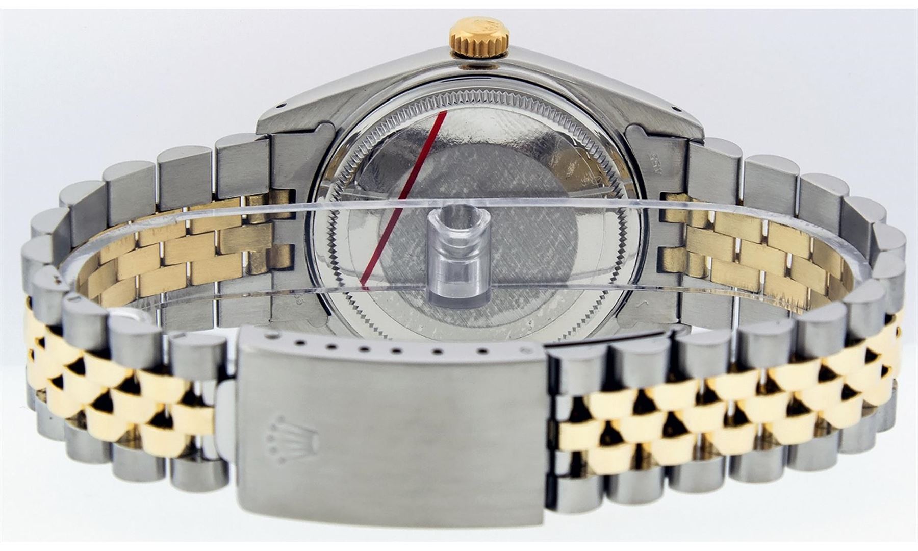 One Mens Pre Owned Quickset Two Tone 14K Yellow Gold And Stainless Steel Datejust Polished, Serviced & Electronically Tested, Yellow Gold & Stainless Steel Case: 36mm, Yellow Gold Crown, Rolex Bezel: 14K Yellow Gold Fluted Bezel. Custom Crystal: New Acrylic With Magnified Date Window. Hands: Luminescent Hands. Rolex Movement: Automatic Winding Movement 3035. Rolex Dial: Champagne Linen Dial With Index Hour Markers and Small Track With Lumi Dots. Date Window: 3 O'Clock Position Date Display, Quickset, Model: Datejust. Condition: G-6 Extra Fine. Rolex Bracelet: Two Tone 14K Yellow Gold & Stainless Steel Jubilee Band. Bright Polish. 7.0 Inch Length, Adjustable. Standard Clasp, With Rolex Logo. This Watch Has Been Serviced Time Tested And Is In Excellent Condition It Is Free Of All Scratches And Dents.