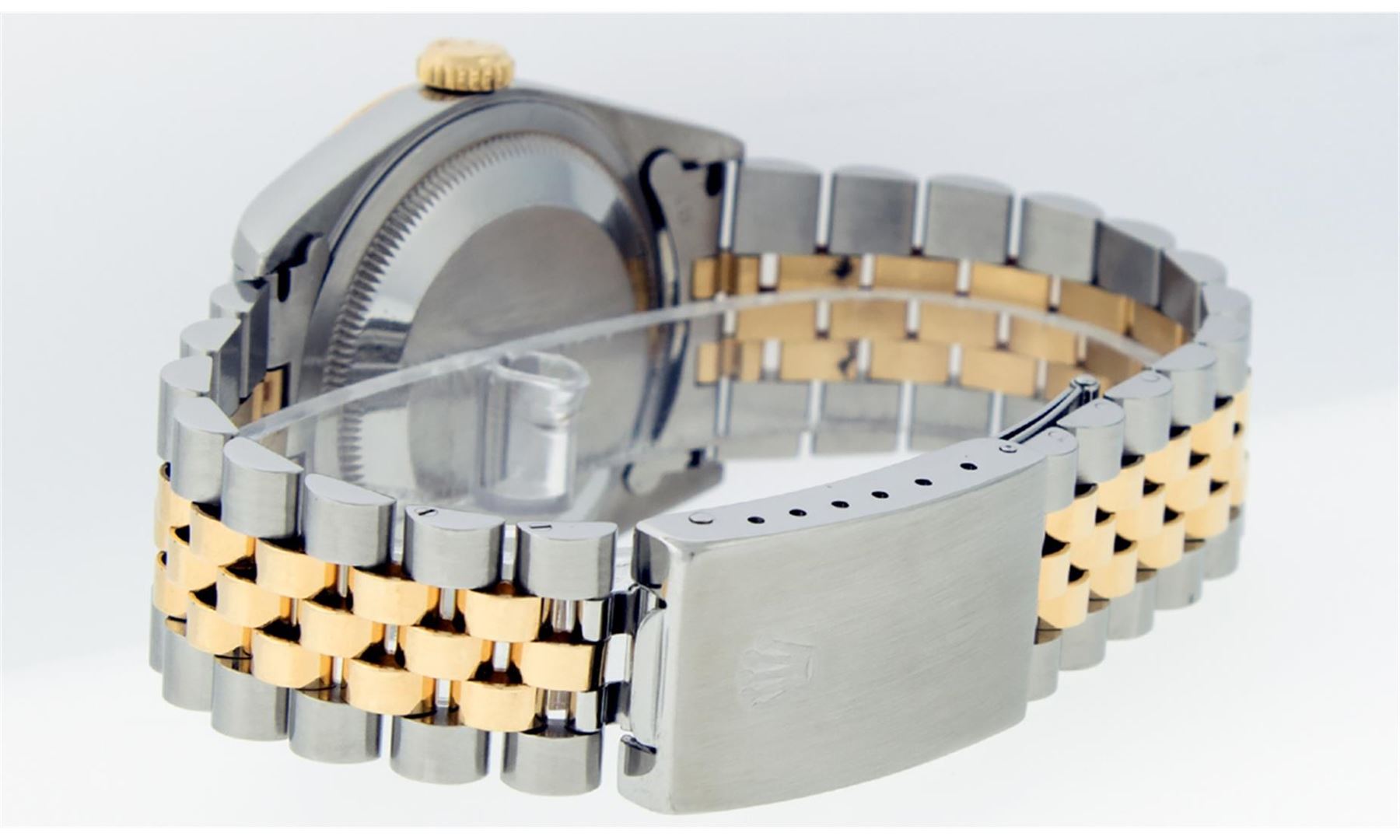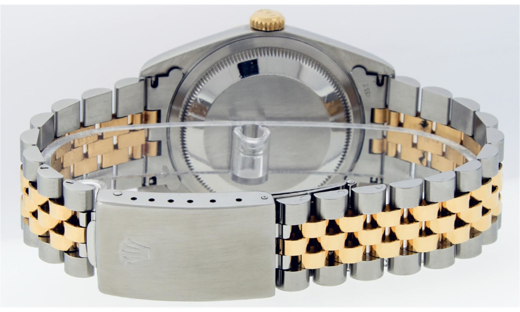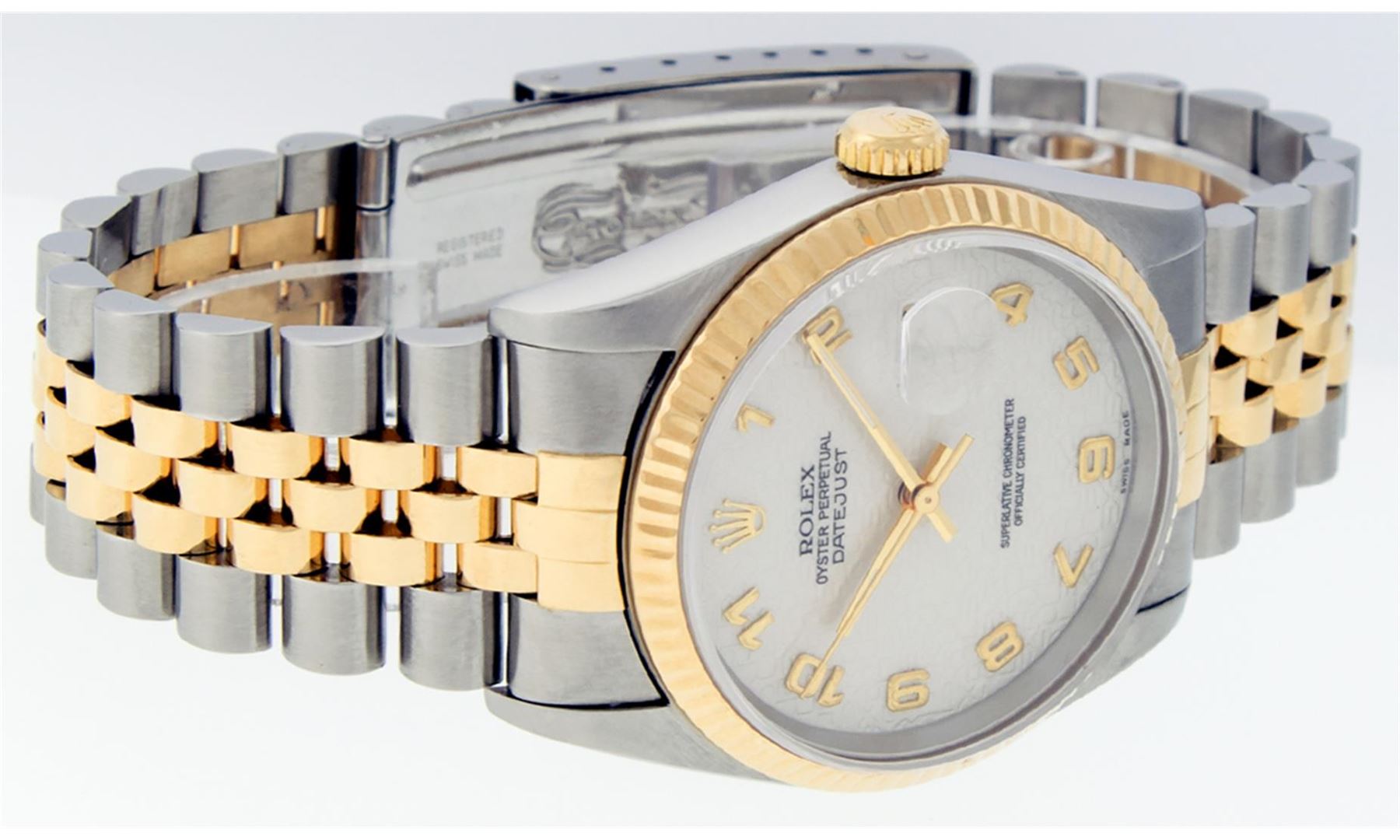 One Mens Pre Owned Rolex Two-Tone 18K Yellow Gold And Stainless Steel Datejust, Polished Bright with Satin Finish, Serviced & Electronically Tested, Stainless Steel Case: 36mm, Yellow Gold Crown, Rolex Bezel: Rolex 18K Yellow Gold Fluted Bezel. Crystal: Sapphire With Cyclops Lens. Rolex Movement: Automatic Winding Movement Caliber 3135. Rolex Dial: Cream Jubilee With Arabic Hour Markers. Date Window: 3 O'Clock Position Date Display, Quickset, Model: Sapphire Quickset Datejust. Condition: G-6 Extra Fine. Rolex Bracelet: 18K Yellow Gold And Stainless Steel Jubilee Band. Bright Polish & Satin Finish. 7.0 Inch Length, Adjustable. Standard Clasp, With Rolex Logo.