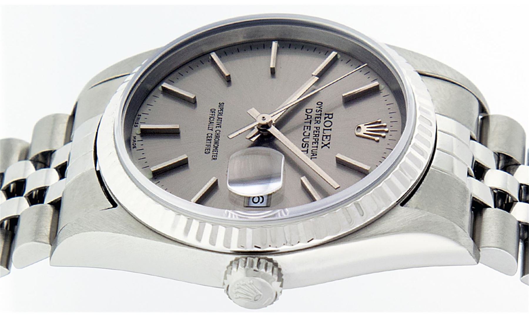 One Mens Rolex Quickset Stainless Steel Datejust Polished Bright with Satin Finish, Serviced & Electronically Tested, Rolex Stainless Steel Case: 36mm, Rolex Stainless Steel Crown, Rolex Bezel: 14K White Gold Fluted Bezel. Crystal: Sapphire With Magnified Date Window. Hands: Solid Hands. Rolex Movement: Automatic Winding Movement Caliber 3135. Custom Dial: Refinished To Gray With Index Hour Markers Dash Track And Lumi Dots. Date Window: 3 O'Clock Position Date Display, Quickset, Model: Quickset Datejust. Condition: G-6 Extra Fine. Rolex Bracelet: Stainless Steel Jubilee Band. Bright Polish & Satin Finish. 7.0 Inch Length, Adjustable. Standard Clasp, With Rolex Logo. This Pre Owned Watch Has Been Serviced Time Tested And Is In Excellent Condition It Is Free Of All Scratches And Dents.