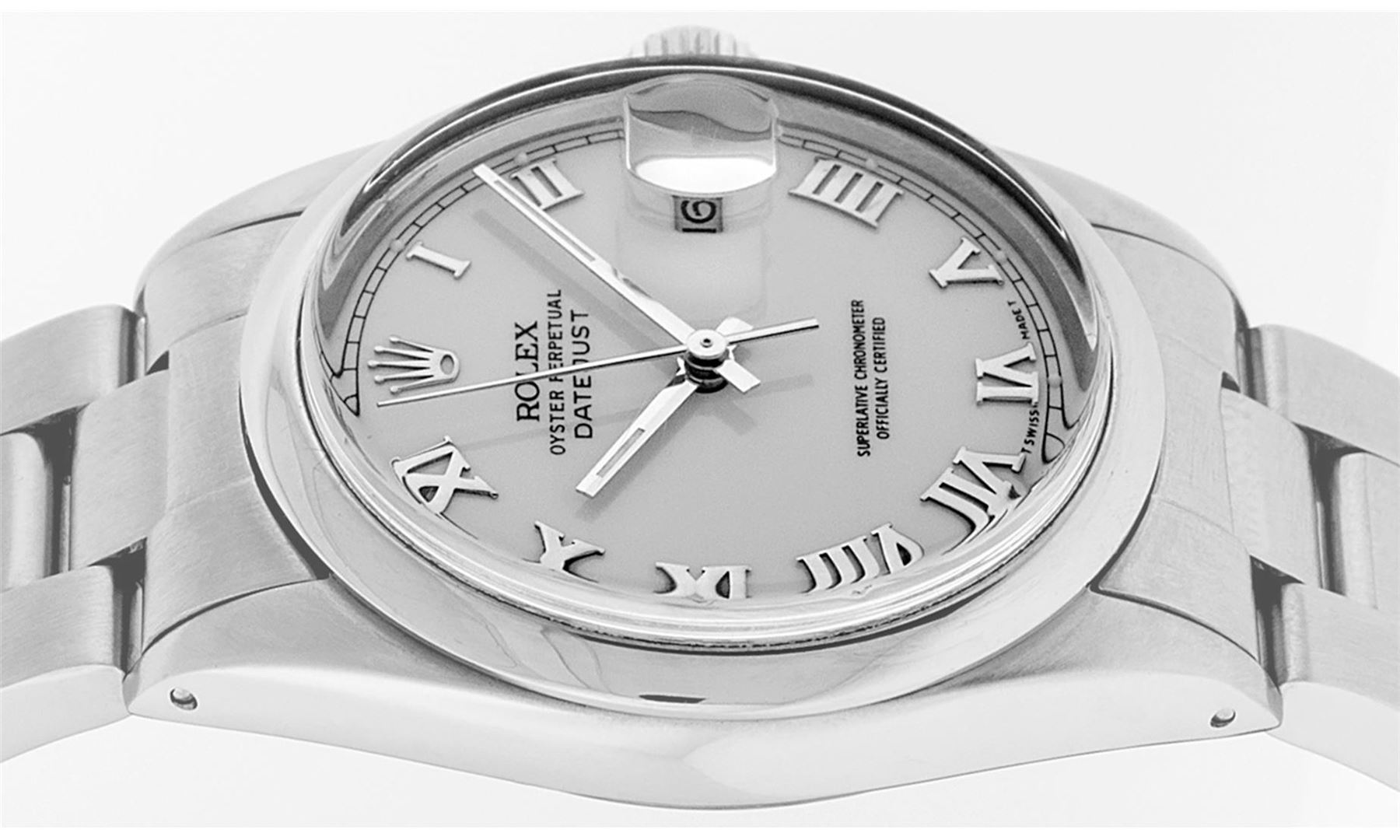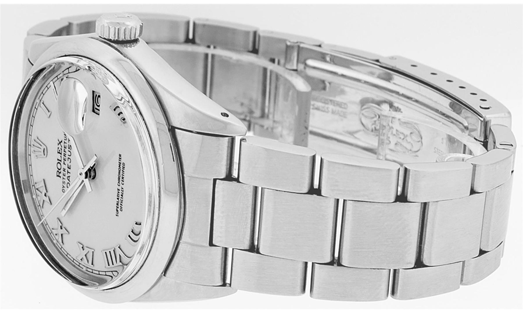 One Mens Rolex Quickset Stainless Steel Datejust Polished Bright with Satin Finish, Serviced & Electronically Tested, Rolex Stainless Steel Case: 36mm, Rolex Stainless Steel Crown, Rolex Bezel: Stainless Steel Smooth Bezel. Crystal: Sapphire With Magnified Date Window. Custom Hands: New Luminescent Hands. Rolex Movement: Automatic Winding Movement Caliber 3135. Custom Dial: Silver Roman With Square Track and Lumi Dot. Date Window: 3 O'Clock Position Date Display, Quickset, Model: Quickset Datejust. Condition: G-6 Extra Fine. Rolex Bracelet: Stainless Steel Oyster Band. Bright Polish & Satin Finish. 7.0 Inch Length, Adjustable. Standard Clasp, With Rolex Logo. This Pre Owned Watch Has Been Serviced Time Tested And Is In Excellent Condition It Is Free Of All Scratches And Dents.
