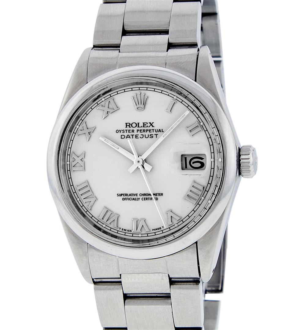 One Mens Rolex Quickset Stainless Steel Datejust Polished Bright with Satin Finish, Serviced & Electronically Tested, Rolex Stainless Steel Case: 36mm, Rolex Stainless Steel Crown, Rolex Bezel: Stainless Steel Smooth Bezel. Crystal: Sapphire With Magnified Date Window. Custom Hands: New Luminescent Hands. Rolex Movement: Automatic Winding Movement Caliber 3135. Custom Dial: Silver Roman With Square Track and Lumi Dot. Date Window: 3 O'Clock Position Date Display, Quickset, Model: Quickset Datejust. Condition: G-6 Extra Fine. Rolex Bracelet: Stainless Steel Oyster Band. Bright Polish & Satin Finish. 7.0 Inch Length, Adjustable. Standard Clasp, With Rolex Logo. This Pre Owned Watch Has Been Serviced Time Tested And Is In Excellent Condition It Is Free Of All Scratches And Dents.