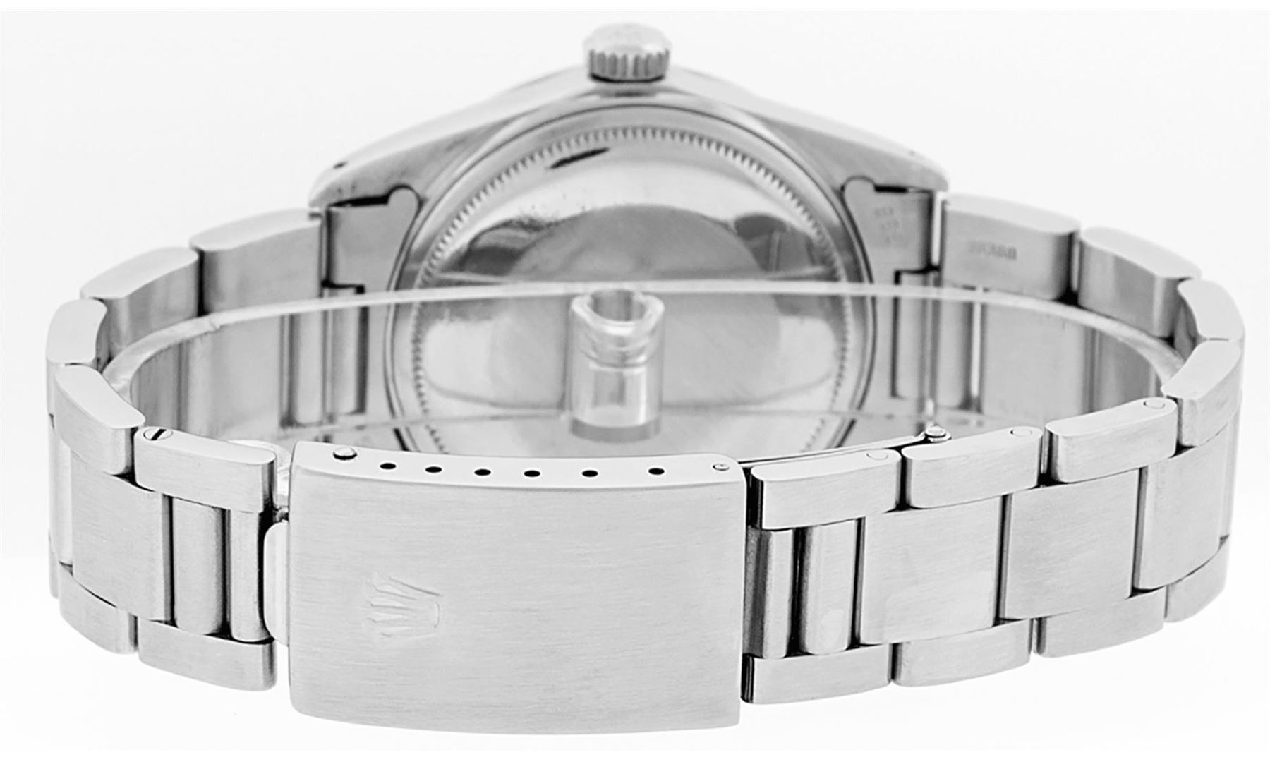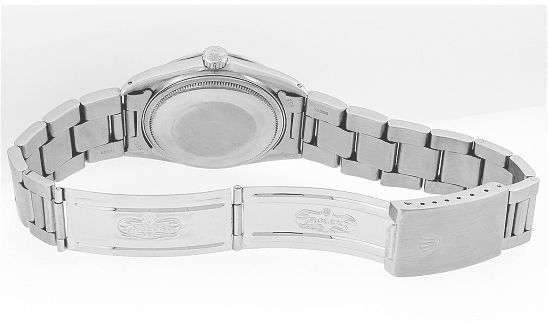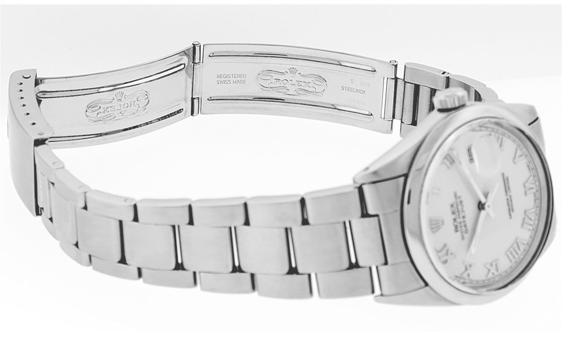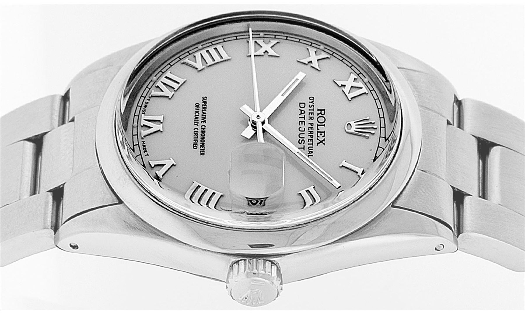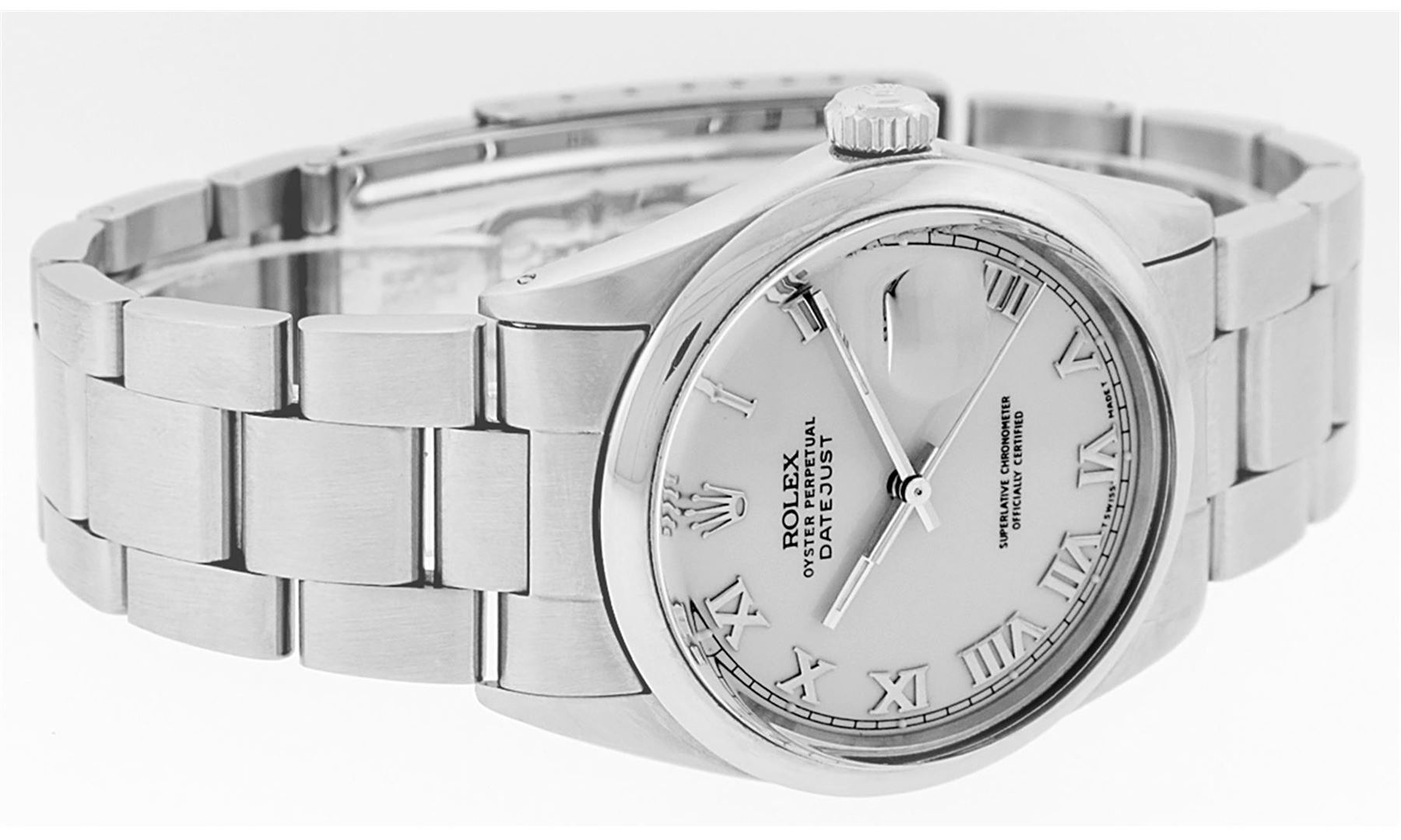 One Mens Rolex Quickset Stainless Steel Datejust Polished Bright with Satin Finish, Serviced & Electronically Tested, Rolex Stainless Steel Case: 36mm, Rolex Stainless Steel Crown, Rolex Bezel: Stainless Steel Smooth Bezel. Crystal: Sapphire With Magnified Date Window. Custom Hands: New Luminescent Hands. Rolex Movement: Automatic Winding Movement Caliber 3135. Custom Dial: Silver Roman With Square Track and Lumi Dot. Date Window: 3 O'Clock Position Date Display, Quickset, Model: Quickset Datejust. Condition: G-6 Extra Fine. Rolex Bracelet: Stainless Steel Oyster Band. Bright Polish & Satin Finish. 7.0 Inch Length, Adjustable. Standard Clasp, With Rolex Logo. This Pre Owned Watch Has Been Serviced Time Tested And Is In Excellent Condition It Is Free Of All Scratches And Dents.
