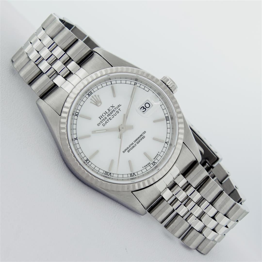 One Mens Rolex Quickset Stainless Steel Datejust Polished Bright with Satin Finish, Serviced & Electronically Tested, Rolex Stainless Steel Case: 36mm, Rolex Stainless Steel Crown, Rolex Bezel: 14K White Gold Fluted Bezel. Crystal: Sapphire With Magnified Date Window. Custom Hands: New Lumi Hands. Rolex Movement: Automatic Winding Movement Caliber 3135. Custom Dial: Refinished To White With Index Hour Markers And Square Roman Track. Date Window: 3 O'Clock Position Date Display, Quickset, Model: Quickset Datejust. Condition: G-6 Extra Fine. Rolex Bracelet: Stainless Steel Jubilee Band. Bright Polish & Satin Finish. 7.0 Inch Length, Adjustable. Standard Clasp, With Rolex Logo. This Pre Owned Watch Has Been Serviced Time Tested And Is In Excellent Condition It Is Free Of All Scratches And Dents.