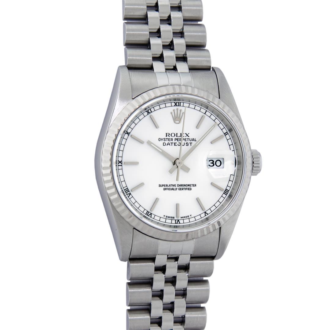 One Mens Rolex Quickset Stainless Steel Datejust Polished Bright with Satin Finish, Serviced & Electronically Tested, Rolex Stainless Steel Case: 36mm, Rolex Stainless Steel Crown, Rolex Bezel: 14K White Gold Fluted Bezel. Crystal: Sapphire With Magnified Date Window. Custom Hands: New Lumi Hands. Rolex Movement: Automatic Winding Movement Caliber 3135. Custom Dial: Refinished To White With Index Hour Markers And Square Roman Track. Date Window: 3 O'Clock Position Date Display, Quickset, Model: Quickset Datejust. Condition: G-6 Extra Fine. Rolex Bracelet: Stainless Steel Jubilee Band. Bright Polish & Satin Finish. 7.0 Inch Length, Adjustable. Standard Clasp, With Rolex Logo. This Pre Owned Watch Has Been Serviced Time Tested And Is In Excellent Condition It Is Free Of All Scratches And Dents.