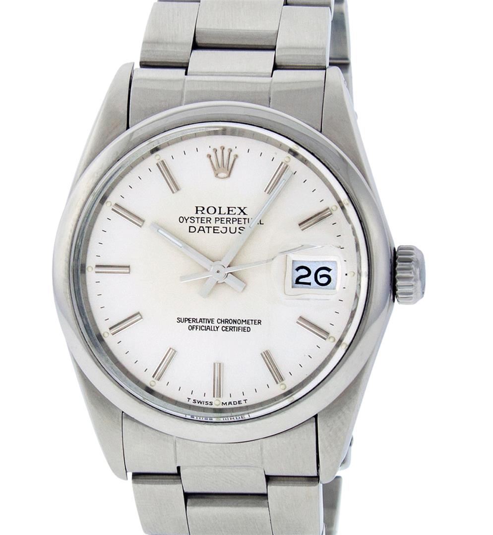 One Mens Rolex Quickset Stainless Steel Datejust Polished Bright with Satin Finish, Serviced & Electronically Tested, Rolex Stainless Steel Case: 36mm, Rolex Stainless Steel Crown, Rolex Bezel: Stainless Steel Smooth Bezel. Crystal: Sapphire With Magnified Date Window. Custom Hands: New Luminescent Hands. Rolex Movement: Automatic Winding Movement Caliber 3135. Rolex Dial: Silver Dial With Index Hour Markers Dash Track And Lumi Dots. Date Window: 3 O'Clock Position Date Display, Quickset, Model: Quickset Datejust. Condition: G-6 Extra Fine. Rolex Bracelet: Stainless Steel Oyster Band. Bright Polish & Satin Finish. 7.0 Inch Length, Adjustable. Standard Clasp, With Rolex Logo. This Pre Owned Watch Has Been Serviced Time Tested And Is In Excellent Condition It Is Free Of All Scratches And Dents.