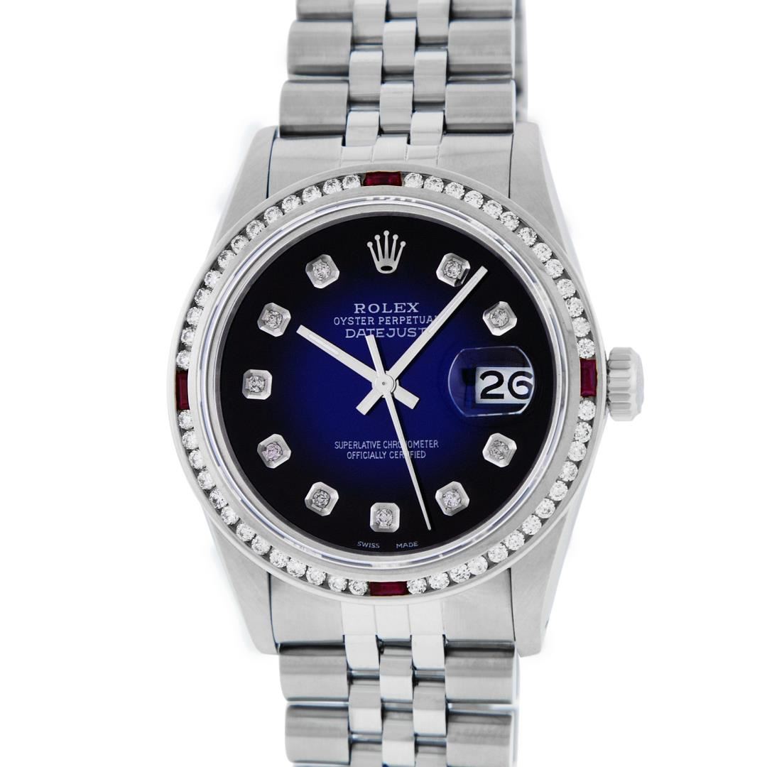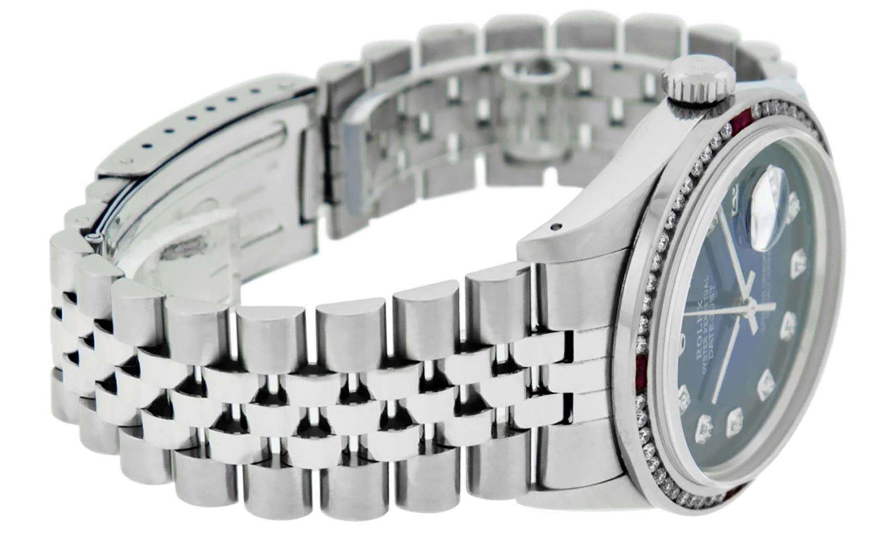 One Mens Pre Owned Stainless Steel Rolex Datejust Polished Bright with Satin Finish, Rolex Stainless Steel Case: 36mm, Rolex Stainless Steel Crown, Custom Bezel: New 18K White Gold Ruby Channel Set Diamond Bezel, Diamond + Gem Count: 52 Diamonds + 4 Rubies. Custom Crystal: New Sapphire With Magnified Date. Custom Hands: New Luminescent Hands. Rolex Movement: Automatic Winding Movement 3035. Custom Dial: Custom Blue Vignette Dial With Added Diamonds, Diamond Count: 10 Diamonds On Dial. Date Window: 3 O'Clock Position Date Display, Quickset, Model: Datejust, Condition: G-6 Extra Fine. Rolex Bracelet: Stainless Steel Jubilee Band. Bracelet: 7.0 Inch Length, Adjustable. Standard Clasp, With Rolex Logo. This Watch Has Been Serviced Time Tested And Is In Excellent Condition It Is Free Of All Scratches And Dents.