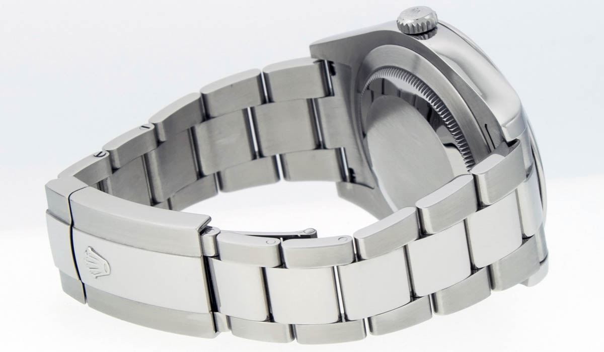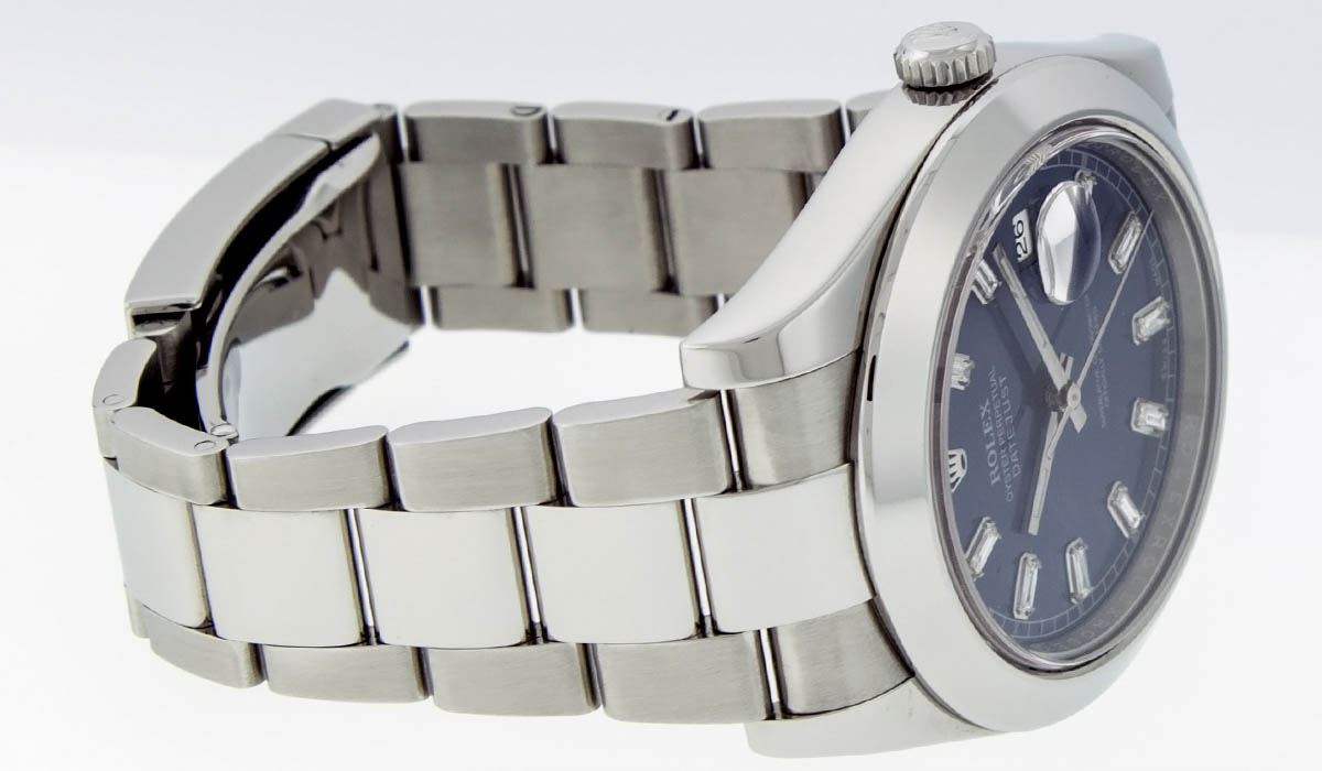 One Mens Rolex Datejust 2 High Polished, Serviced & Electronically Tested, Stainless Steel Case:41mm, Stainless Steel Crown, Bezel: Stainless Steel Smooth Bezel, Crystal: Synthetic Sapphire Cyclops Lens. Movement: Automatic Winding Movement Caliber 3136. Custom Dial: Blue Baguette Diamond Dial, Diamond Count:10 Diamond Baguettes In Dial, Diamond Color: G To H, Clarity: SI-VS. Date Window: 3 O'Clock Position, Date Display, Quickset, Model: 116300 Datejust 2. Condition: G-6 Extra Fine The Watch Is In Very Good Condition Free Of All Scratches And Dents. Bracelet:Stainless Steel Oyster Band. Bright Polish & Satin Finish. 7.5 Inch Length, Adjustable. Standard Clasp, With Rolex Logo.