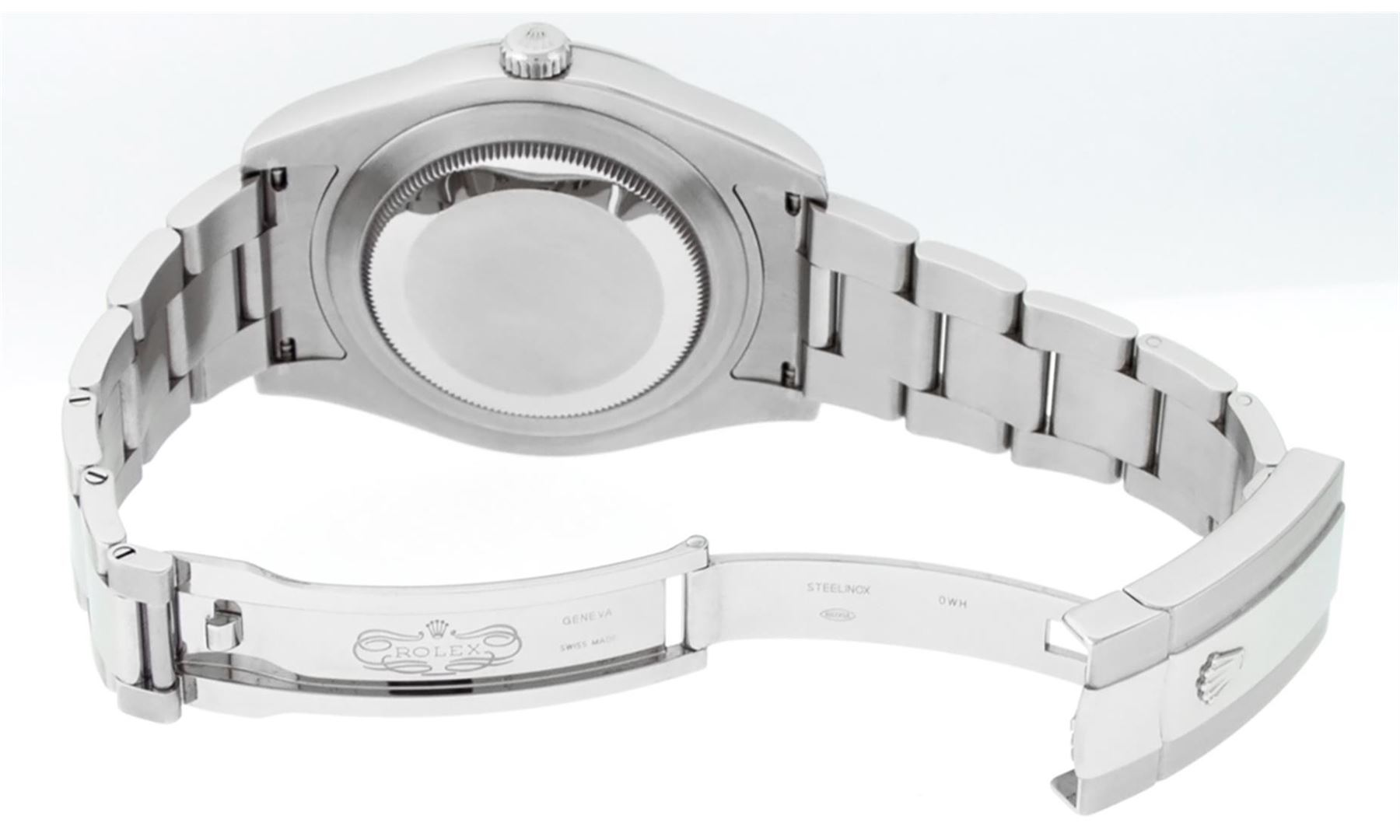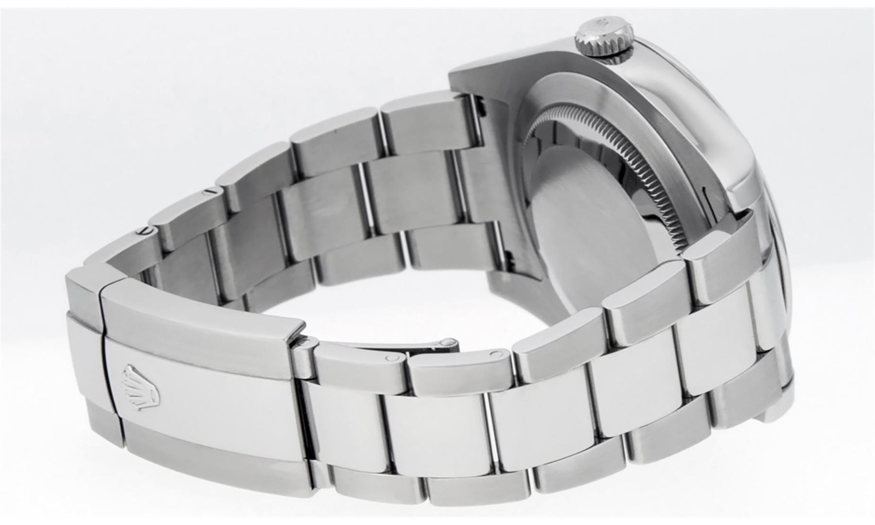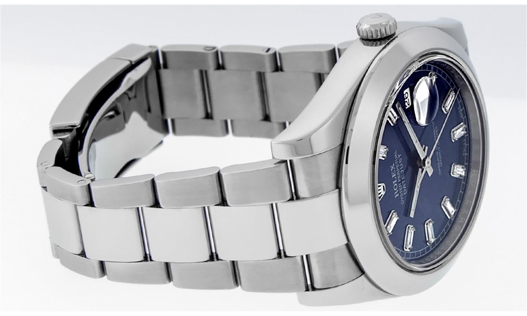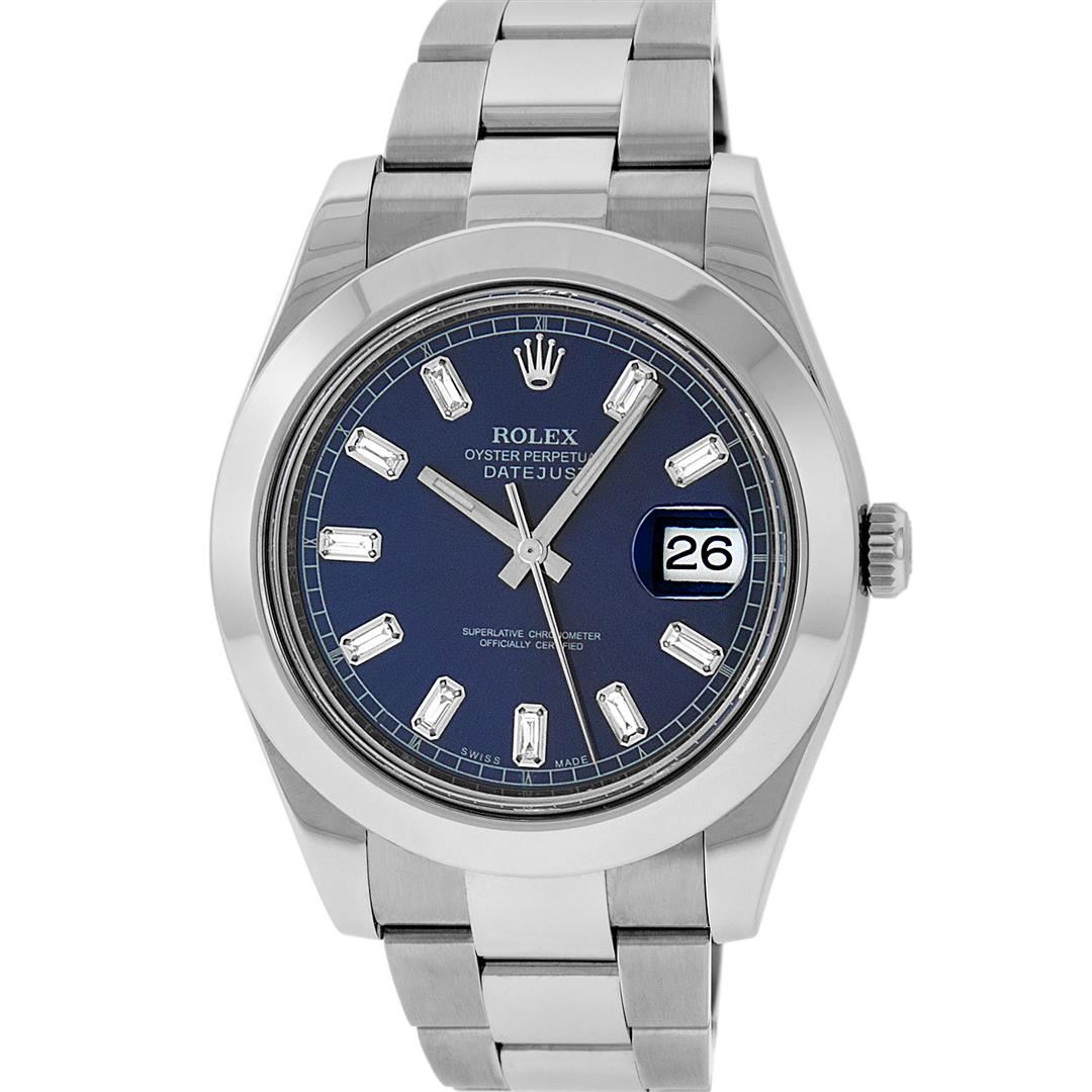 One Mens Pre Owned Rolex Datejust 2 Polished With Shiny Finish, Serviced & Electronically Tested, Stainless Steel Case: 41mm, Stainless Steel Crown, Bezel: Stainless Steel Smooth Bezel, Crystal: Scratch Resistant Synthetic Sapphire Cyclops Lens. Rolex Movement: Automatic Winding Movement. Custom Dial: Blue With Custom Added Diamond Baguette Hour Markers. Date Window: 3 O'Clock Position Date Display, Quickset, Model: Datejust 2. Condition: G-6 Extra Fine The Watch Is In Very Good Condition Free Of All Scratches And Dents. Rolex Bracelet: Stainless Steel Oyster Band. Bright Polish & Satin Finish. 7.5 Inch Length, Adjustable. Standard Clasp, With Rolex Logo. This Watch Has Been Serviced Time Tested And Is In Excellent Condition It Is Free Of All Scratches And Dents.