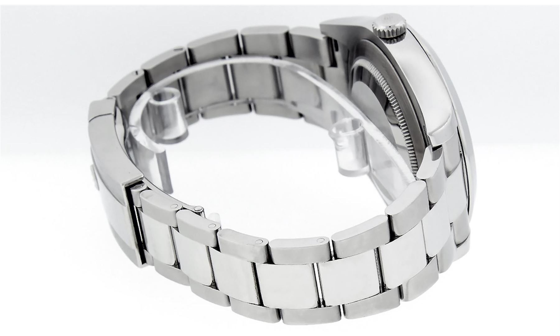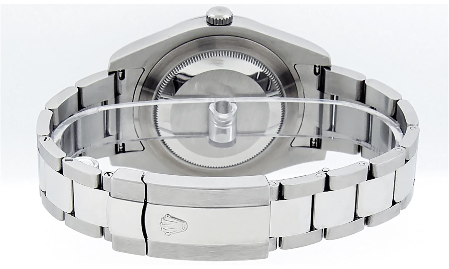 One Mens Pre Owned Rolex Datejust 2 Polished With Shiny Finish, Serviced & Electronically Tested, Stainless Steel Case: 41mm, Stainless Steel Crown, Bezel: Stainless Steel Smooth Bezel, Crystal: Scratch Resistant Synthetic Sapphire Cyclops Lens. Rolex Movement: Automatic Winding Movement. Custom Dial: Blue With Custom Added Roman Diamond Hour Markers. Date Window: 3 O'Clock Position Date Display, Quickset, Model: Datejust 2. Condition: G-6 Extra Fine The Watch Is In Very Good Condition Free Of All Scratches And Dents. Rolex Bracelet: Stainless Steel Oyster Band. Bright Polish & Satin Finish. 7.5 Inch Length, Adjustable. Standard Clasp, With Rolex Logo. This Watch Has Been Serviced Time Tested And Is In Excellent Condition It Is Free Of All Scratches And Dents.