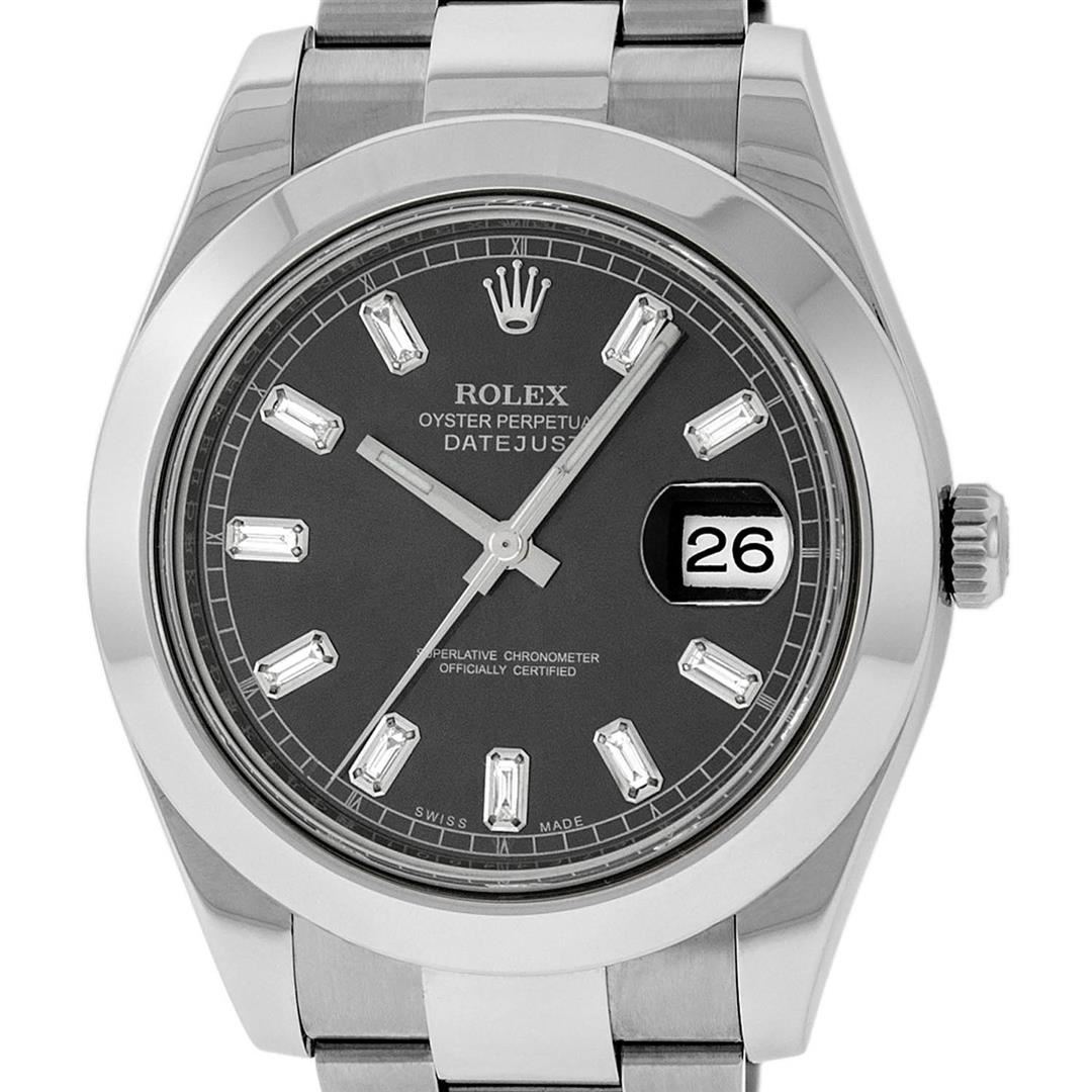 One Mens Rolex Datejust 2 Polished With High Polish, Serviced & Electronically Tested, Stainless Steel Case:41mm, Stainless Steel Crown, Bezel: Stainless Steel Smooth Bezel, . Crystal: Synthetic Sapphire Cyclops Lens. Movement: Automatic Winding Movement Caliber 3136. Custom Dial: Dark Rhodium Baguette Diamond Dial, Diamond Count: 10 Diamond Baguettes In Dial, Diamond Color: G To H, Clarity: SI-VS. Date Window: 3 O'Clock Position Date Display, Quickset, Model: 116300 Datejust 2. Condition: G-6 Extra Fine The Watch Is In Very Good Condition Free Of All Scratches And Dents. Bracelet:Stainless Steel Oyster Band. Bright Polish & Satin Finish. 7.5 Inch Length, Adjustable. Standard Clasp, With Rolex Logo. Watch Has Been Serviced And Polished It Is Free Of All Scratches And Dents.