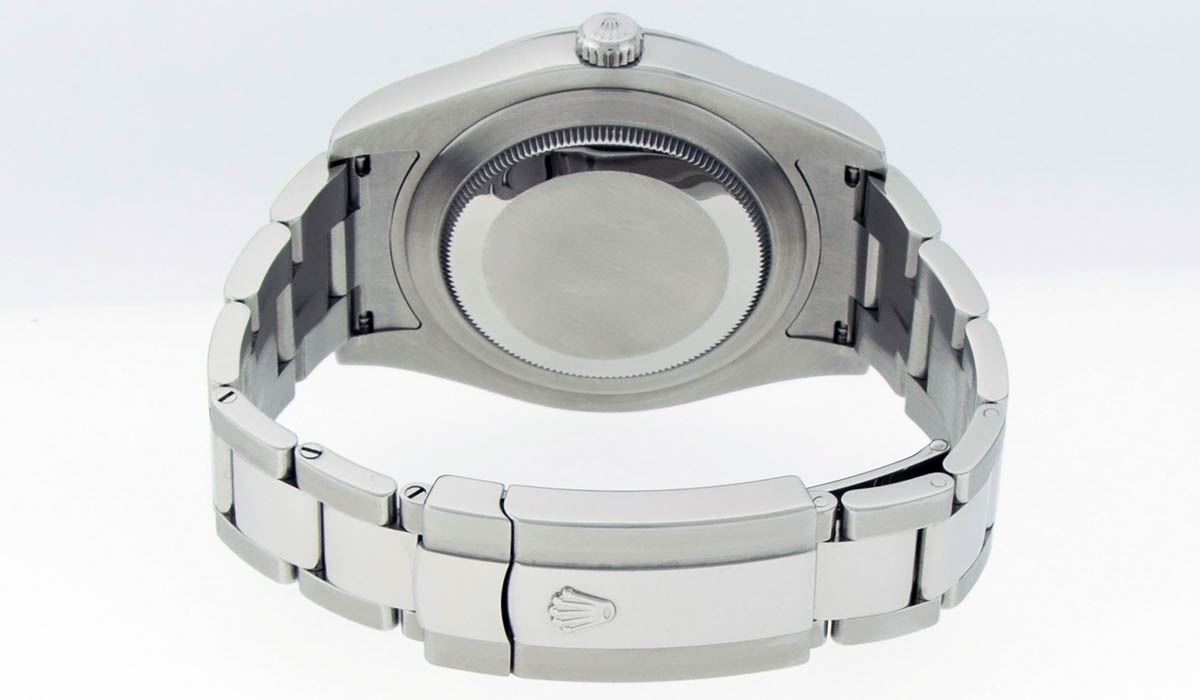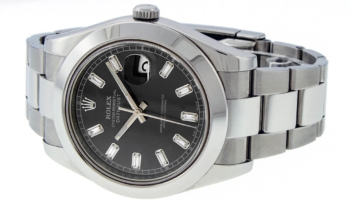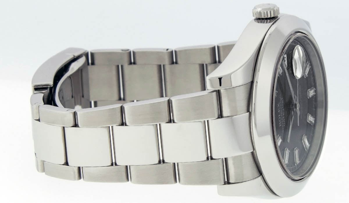 One Mens Rolex Datejust 2 Polished With High Polish, Serviced & Electronically Tested, Stainless Steel Case:41mm, Stainless Steel Crown, Bezel: Stainless Steel Smooth Bezel, . Crystal: Synthetic Sapphire Cyclops Lens. Movement: Automatic Winding Movement Caliber 3136. Custom Dial: Dark Rhodium Baguette Diamond Dial, Diamond Count: 10 Diamond Baguettes In Dial, Diamond Color: G To H, Clarity: SI-VS. Date Window: 3 O'Clock Position Date Display, Quickset, Model: 116300 Datejust 2. Condition: G-6 Extra Fine The Watch Is In Very Good Condition Free Of All Scratches And Dents. Bracelet:Stainless Steel Oyster Band. Bright Polish & Satin Finish. 7.5 Inch Length, Adjustable. Standard Clasp, With Rolex Logo. Watch Has Been Serviced And Polished It Is Free Of All Scratches And Dents.