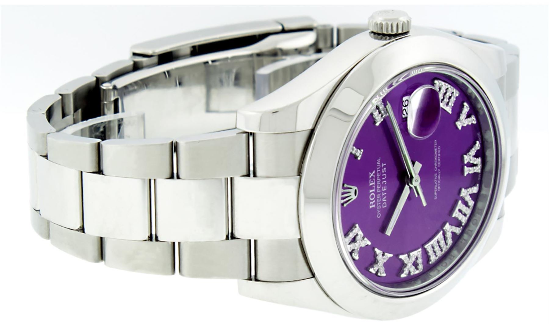 One Mens Pre Owned Rolex Datejust 2 Polished With Shiny Finish, Serviced & Electronically Tested, Stainless Steel Case: 41mm, Stainless Steel Crown, Bezel: Stainless Steel Smooth Bezel, Crystal: Scratch Resistant Synthetic Sapphire Cyclops Lens. Rolex Movement: Automatic Winding Movement. Custom Dial: Purple With Custom Added Roman Diamond Hour Markers. Date Window: 3 O'Clock Position Date Display, Quickset, Model: Datejust 2. Condition: G-6 Extra Fine The Watch Is In Very Good Condition Free Of All Scratches And Dents. Rolex Bracelet: Stainless Steel Oyster Band. Bright Polish & Satin Finish. 7.5 Inch Length, Adjustable. Standard Clasp, With Rolex Logo. This Watch Has Been Serviced Time Tested And Is In Excellent Condition It Is Free Of All Scratches And Dents.