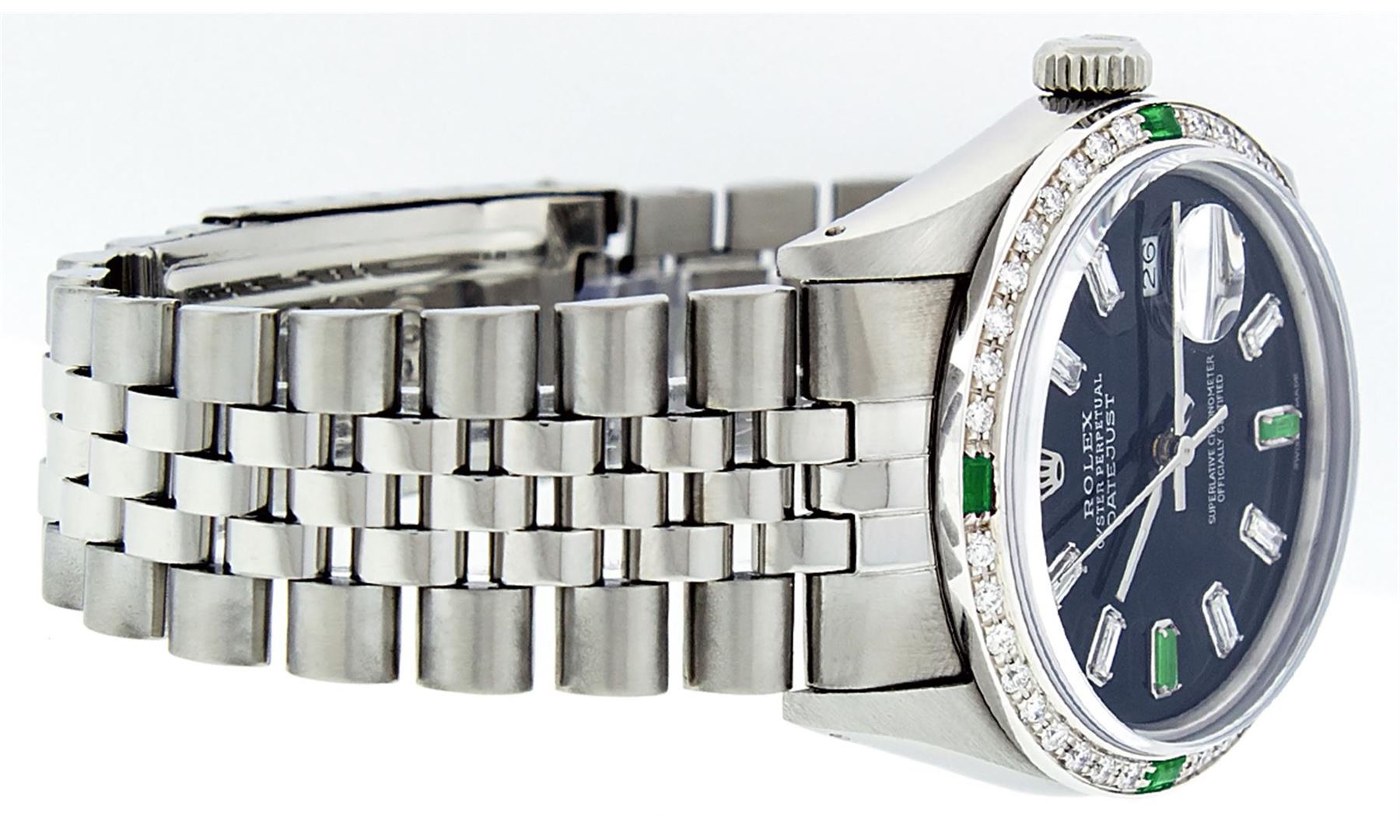 One Gents Rolex Datejust Polished, Serviced & Electronically Tested, Stainless Steel Case:36mm, Stainless Steel Crown, Custom Bezel: 18K White Gold Emerald Beadset Diamond Bezel, Diamond + Gem Count: 36 Diamonds + 4 Emeralds, Total Weight 1.00 Carat, Clarity: SI-VS, Color: G to H. Custom Crystal: Synthetic Sapphire Cyclops Lens. Movement: Automatic Winding Movement Caliber 3035. Custom Dial: Black Baguette + 2 Emerald Baguette Diamond Hour Markers, Stone Count: 8 Diamonds + 2 Emerald Baguette. G To H In Color, Clarity: SI-VS. Date Window: 3 O'Clock Position Date Display, Quickset, Model: Datejust. Condition: G-6 Extra Fine. Bracelet: Stainless Steel Jubilee Band. Bright Polish & Satin Finish. 6.5 Inch Length, Adjustable. Standard Clasp, With Rolex Logo