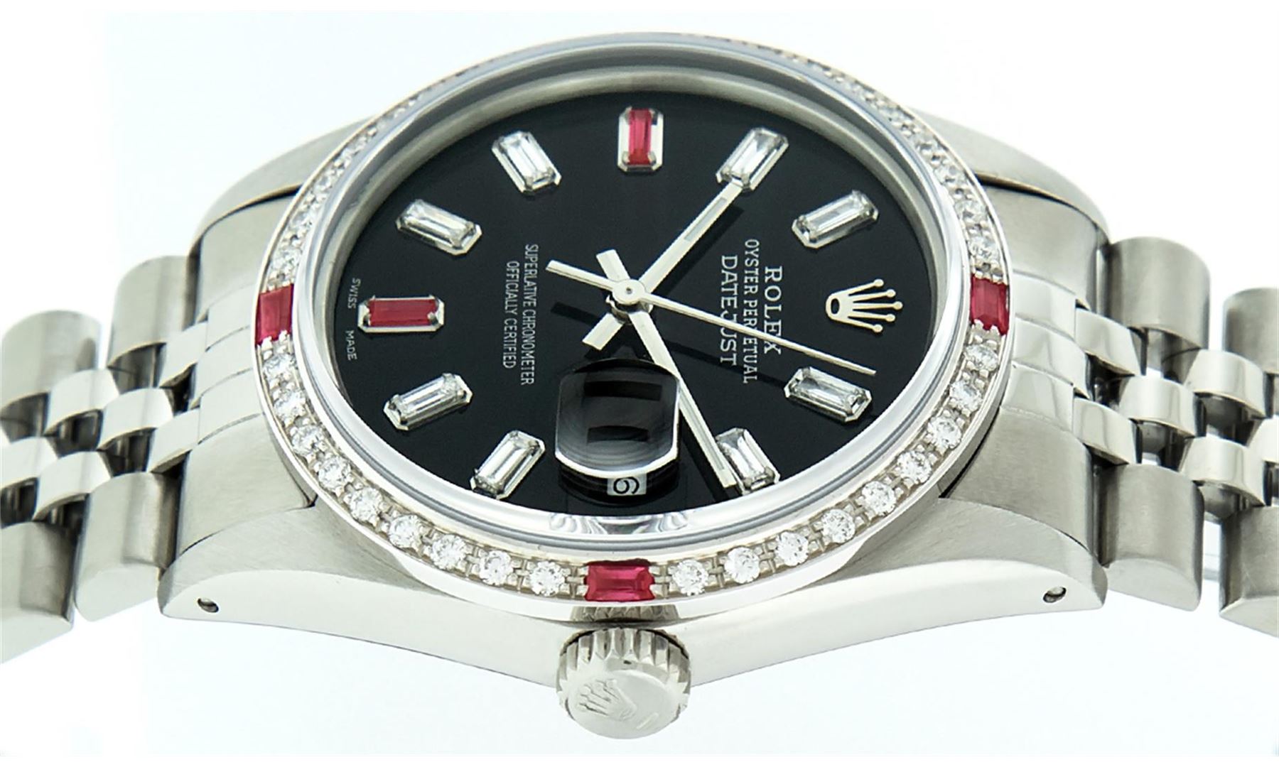 One Gents Rolex Datejust Polished, Serviced & Electronically Tested, Stainless Steel Case:36mm, Stainless Steel Crown, Custom Bezel: 18K White Gold Ruby Beadset Diamond Bezel, Diamond + Gem Count: 36 Diamonds + 4 Rubies, Total Weight 1.00 Carat, Clarity: SI-VS, Color: G to H. Custom Crystal: Synthetic Sapphire Cyclops Lens. Movement: Automatic Winding Movement Caliber 3035. Custom Dial: Black Baguette + 2 Ruby Baguette Diamond Hour Markers,Diamond Count: 8 Diamond + 2 Ruby Baguette. G To H In Color, Clarity: SI-VS. Date Window: 3 O'Clock Position Date Display, Quickset, Model: Datejust. Condition: G-6 Extra Fine. Bracelet: Stainless Steel Jubilee Band. Bright Polish & Satin Finish. 6.5 Inch Length, Adjustable. Standard Clasp, With Rolex Logo