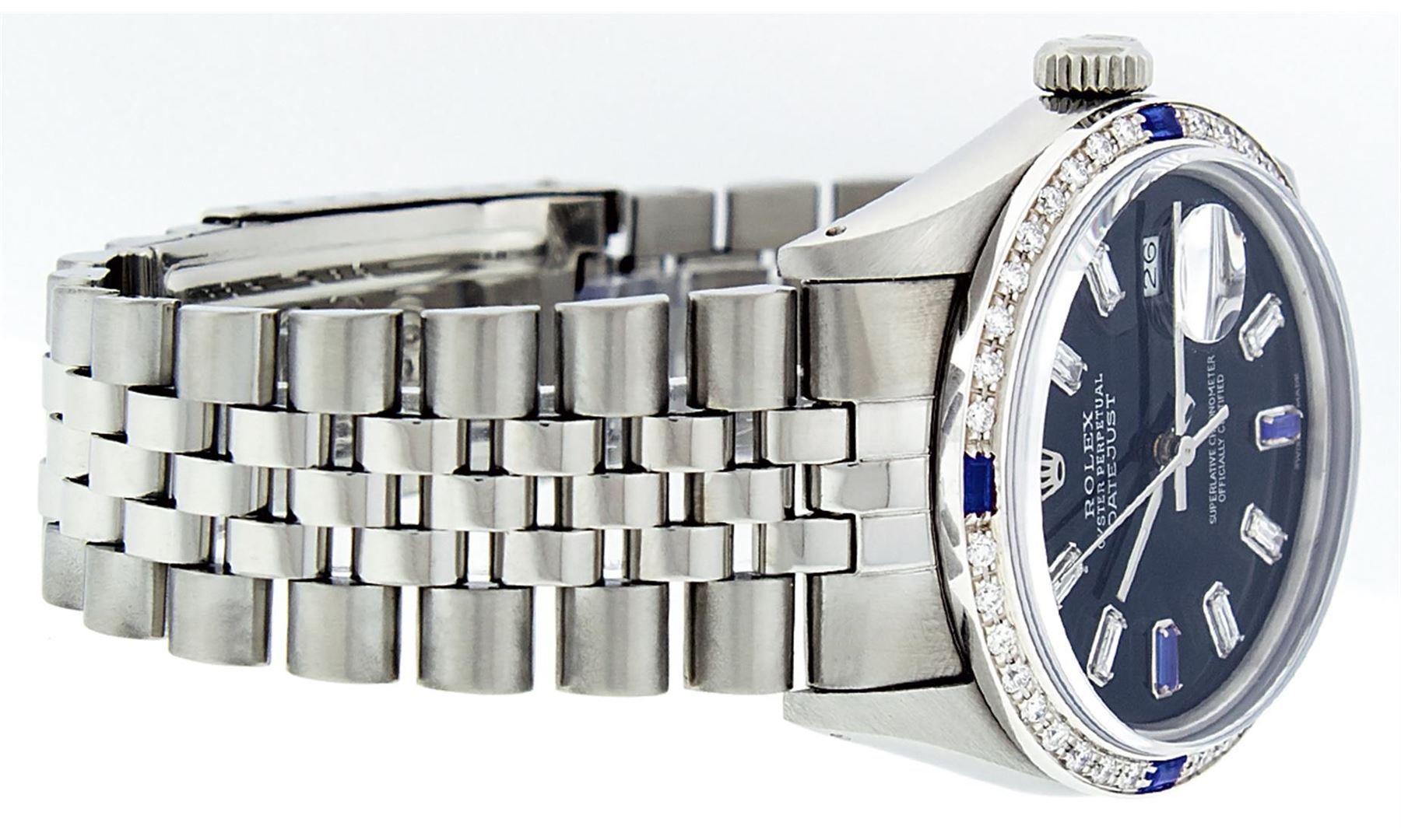 One Gents Rolex Datejust Polished, Serviced & Electronically Tested, Stainless Steel Case:36mm, Stainless Steel Crown, Custom Bezel: 18K White Gold Sapphire Beadset Diamond Bezel, Diamond + Gem Count: 36 Diamonds + 4 Sapphires. Total Weight 1.00 Carat, Clarity: SI-VS, Color: G to H. Custom Crystal: Synthetic Sapphire Cyclops Lens. Movement: Automatic Winding Movement Caliber 3035. Custom Dial: Black Baguette + 2 Sapphire Baguette Diamond Hour Markers, Stone Count: 8 Diamonds + 2 Sapphire Baguette. G To H In Color, Clarity: SI-VS. Date Window: 3 O'Clock Position Date Display, Quickset, Model: Datejust. Condition: G-6 Extra Fine. Bracelet: Stainless Steel Jubilee. Bright Polish & Satin Finish. 6.5 Inch Length, Adjustable. Standard Clasp, With Rolex Logo