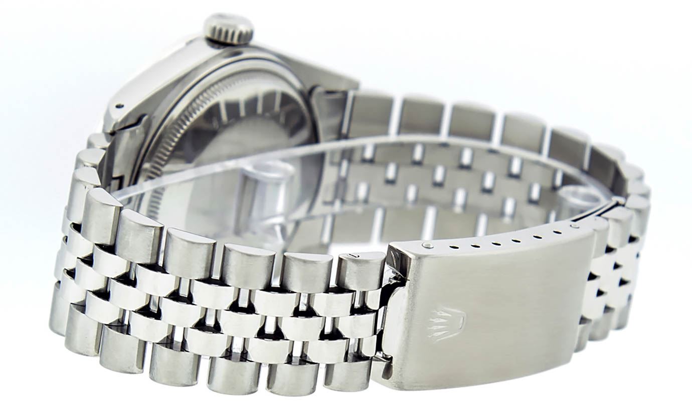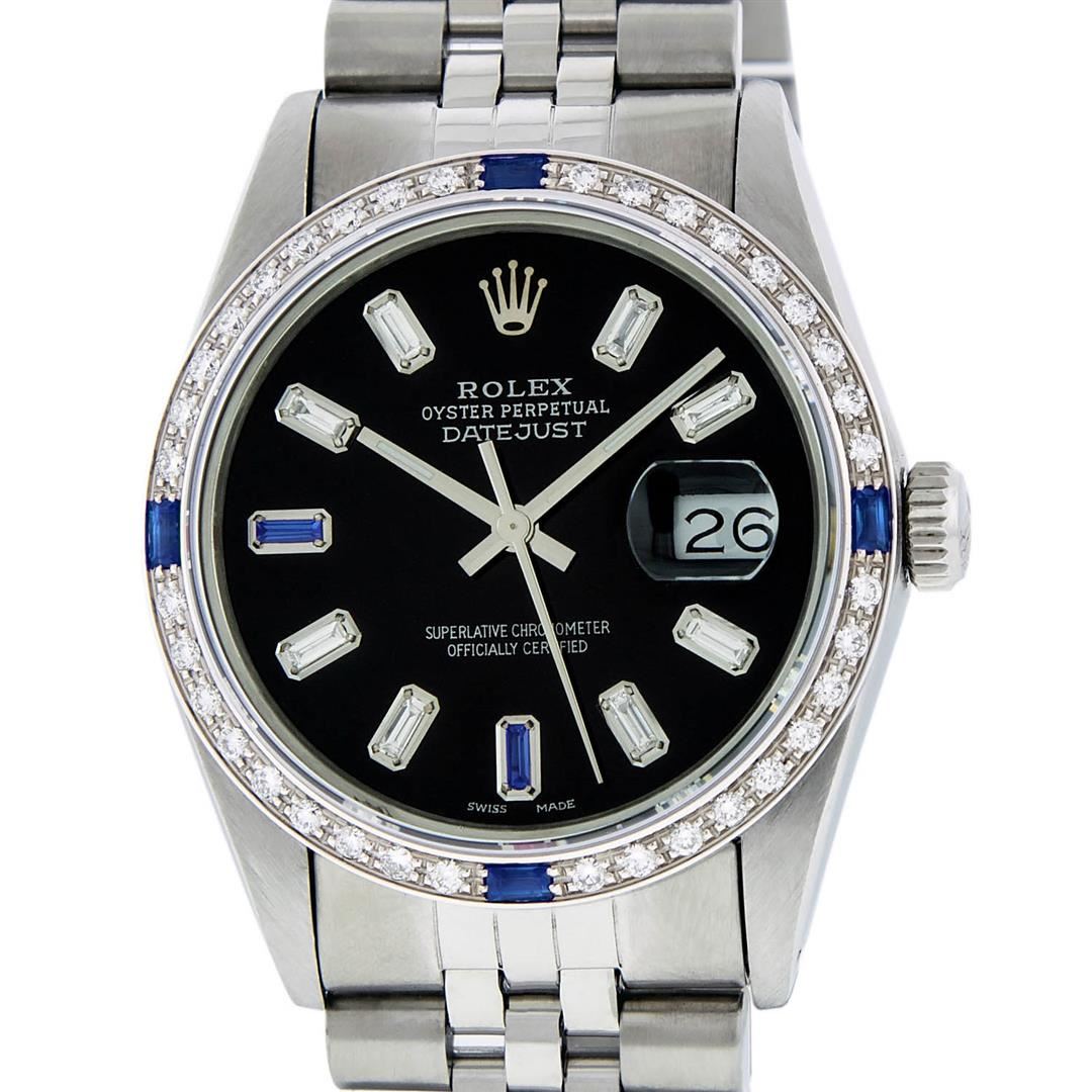 One Gents Rolex Datejust Polished, Serviced & Electronically Tested, Stainless Steel Case:36mm, Stainless Steel Crown, Custom Bezel: 18K White Gold Sapphire Beadset Diamond Bezel, Diamond + Gem Count: 36 Diamonds + 4 Sapphires. Total Weight 1.00 Carat, Clarity: SI-VS, Color: G to H. Custom Crystal: Synthetic Sapphire Cyclops Lens. Movement: Automatic Winding Movement Caliber 3035. Custom Dial: Black Baguette + 2 Sapphire Baguette Diamond Hour Markers, Stone Count: 8 Diamonds + 2 Sapphire Baguette. G To H In Color, Clarity: SI-VS. Date Window: 3 O'Clock Position Date Display, Quickset, Model: Datejust. Condition: G-6 Extra Fine. Bracelet: Stainless Steel Jubilee. Bright Polish & Satin Finish. 6.5 Inch Length, Adjustable. Standard Clasp, With Rolex Logo
