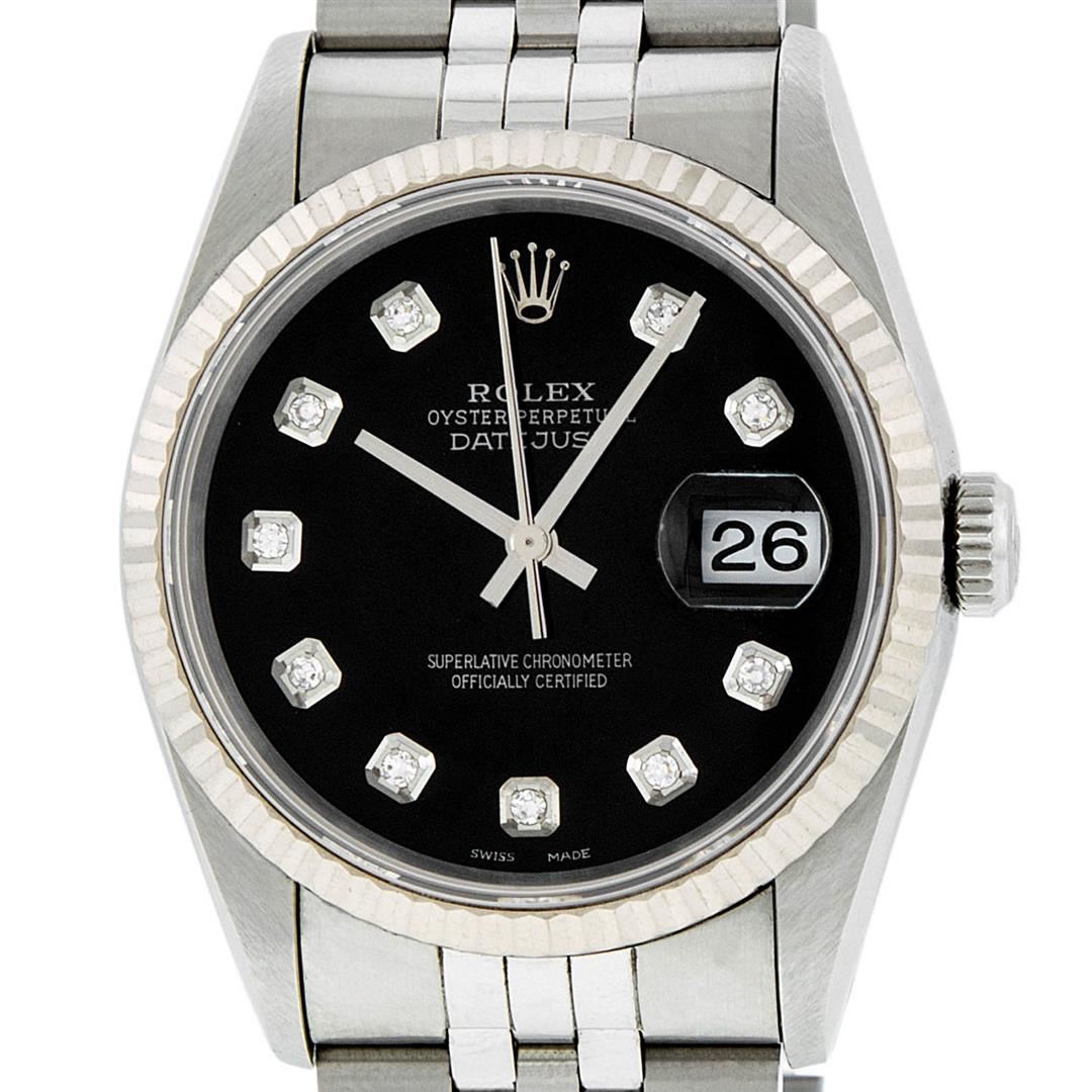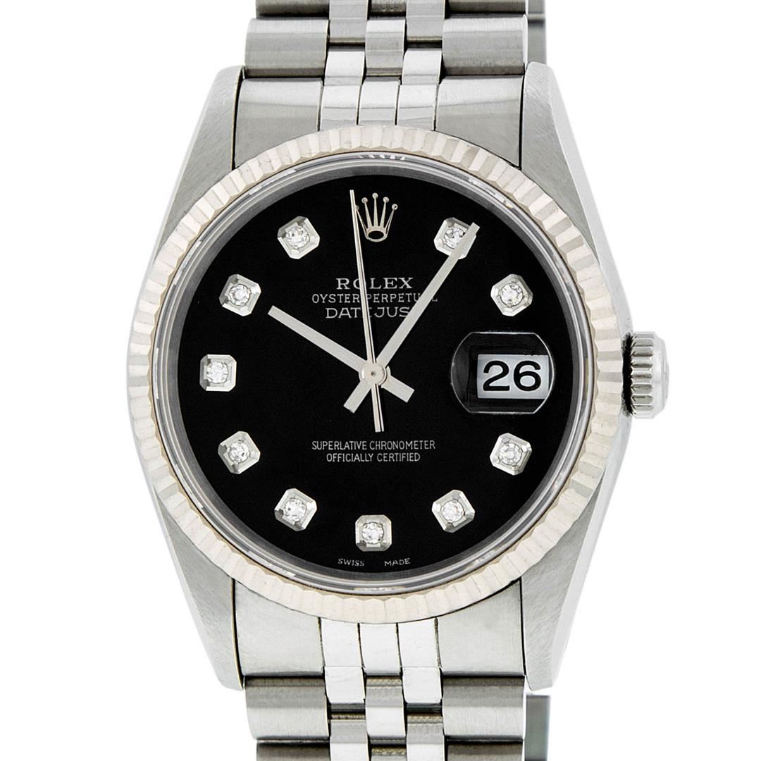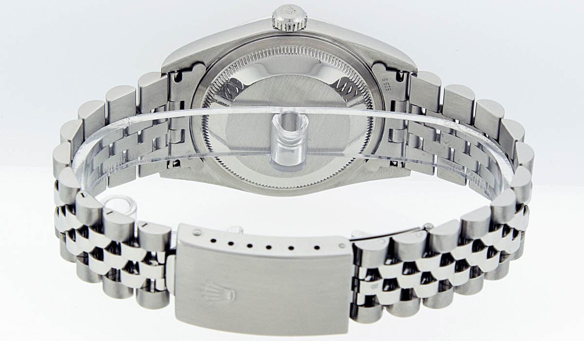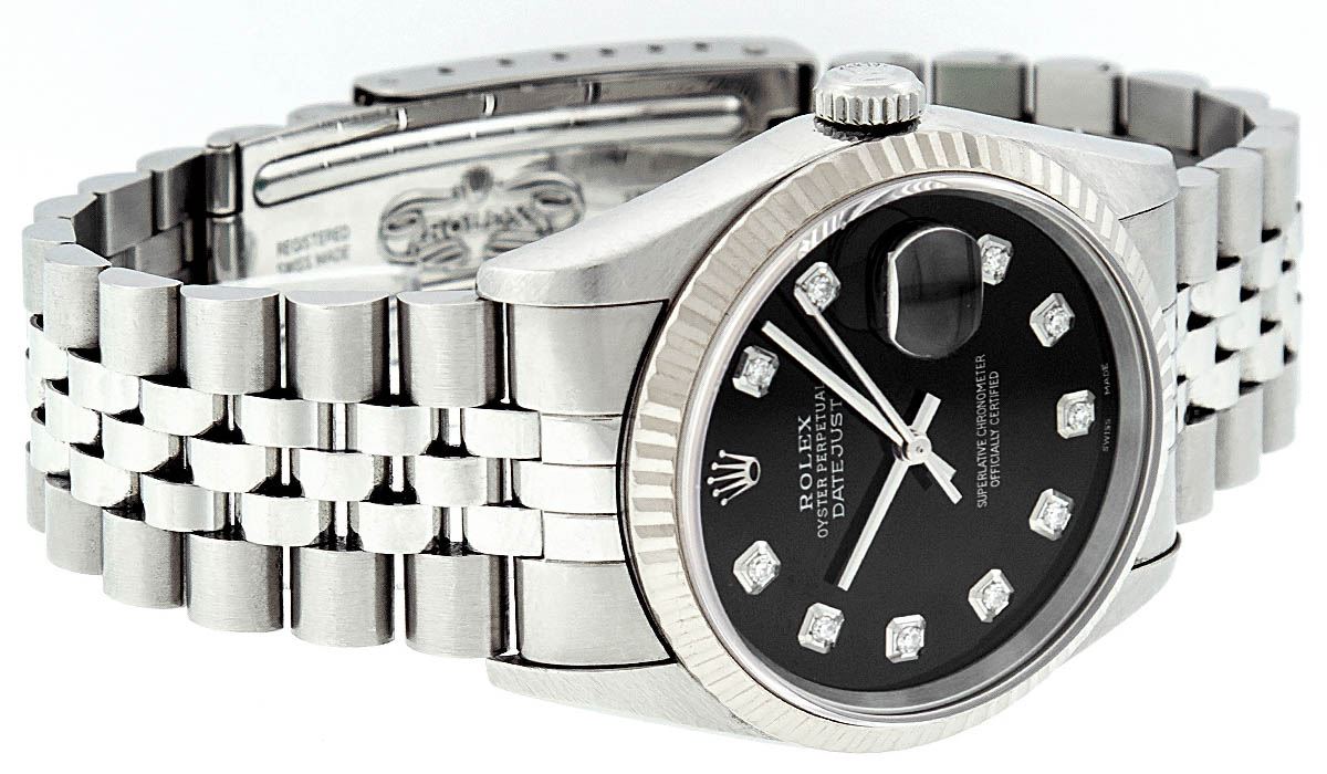 One Mens Rolex Stainless Steel Datejust Polished Bright with Satin Finish, Serviced & Electronically Tested, Stainless Steel Case: 36mm, Stainless Steel Crown, Bezel: 18K White Gold Fluted Bezel. Crystal: Synthetic Sapphire Cyclops Lens. Movement: Automatic Winding Movement Caliber 3135. Custom Dial: Black Diamond Dial, Diamond Count: 10 Diamonds In Dial, Clarity: SI-VS, Color: G to H. Date Window: 3 O'Clock Position Date Display, Quickset, Model: 16234 Quickset Datejust. Condition: G-6 Extra Fine. Bracelet:Stainless Steel Jubilee Band. Bright Polish & Satin Finish. 7.0 Inch Length, Adjustable. Standard Clasp, With Rolex Logo.