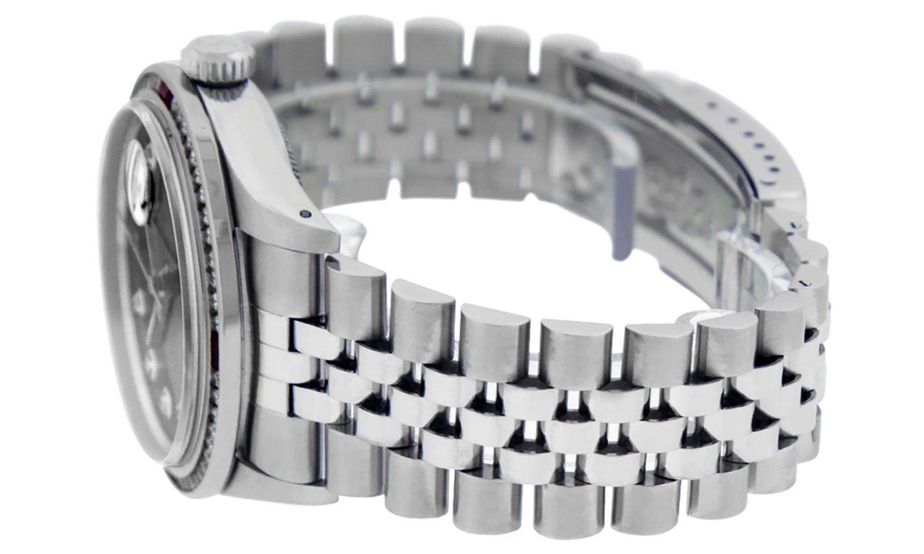 One Mens Pre Owned Stainless Steel Rolex Datejust Polished Bright with Satin Finish, This Watch Has Been Serviced & Electronically Tested, Stainless Steel Case: 36mm, Stainless Steel Crown, Custom Bezel: New 18K White Gold Ruby Channel Set Diamond Bezel, Diamond + Gem Count: 52 Diamonds + 4 Rubies, Clarity: SI-VS, Color: G to H. Custom Crystal: New Sapphire Magnified Date. Custom Hands: New Luminescent Hands. Rolex Movement: Automatic Winding Movement. Custom Dial: Refinished Black Diamond Dial, Diamond Count: 10 Diamonds in Dial, Diamond Color: G To H In Color, Clarity: SI-VS. Date Window: 3 O'Clock Position Date Display, Quickset, Model: Datejust, Condition: G-6 Extra Fine. Rolex Bracelet: Stainless Steel Jubilee. Bracelet: 7.0 Inch Length, Adjustable. Standard Clasp, With Rolex Logo. This Watch Has Been Serviced Time Tested And Is In Excellent Condition It Is Free Of All Scratches And Dents.