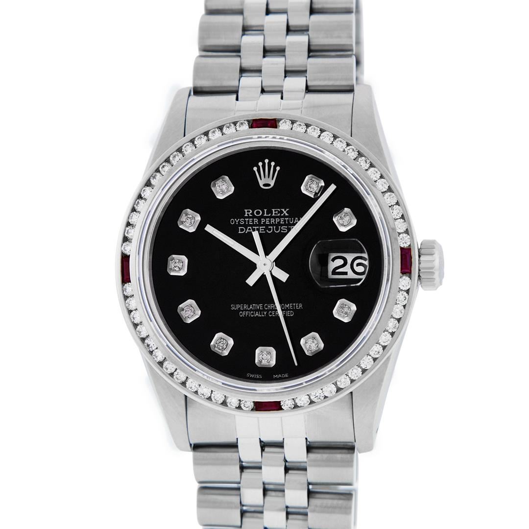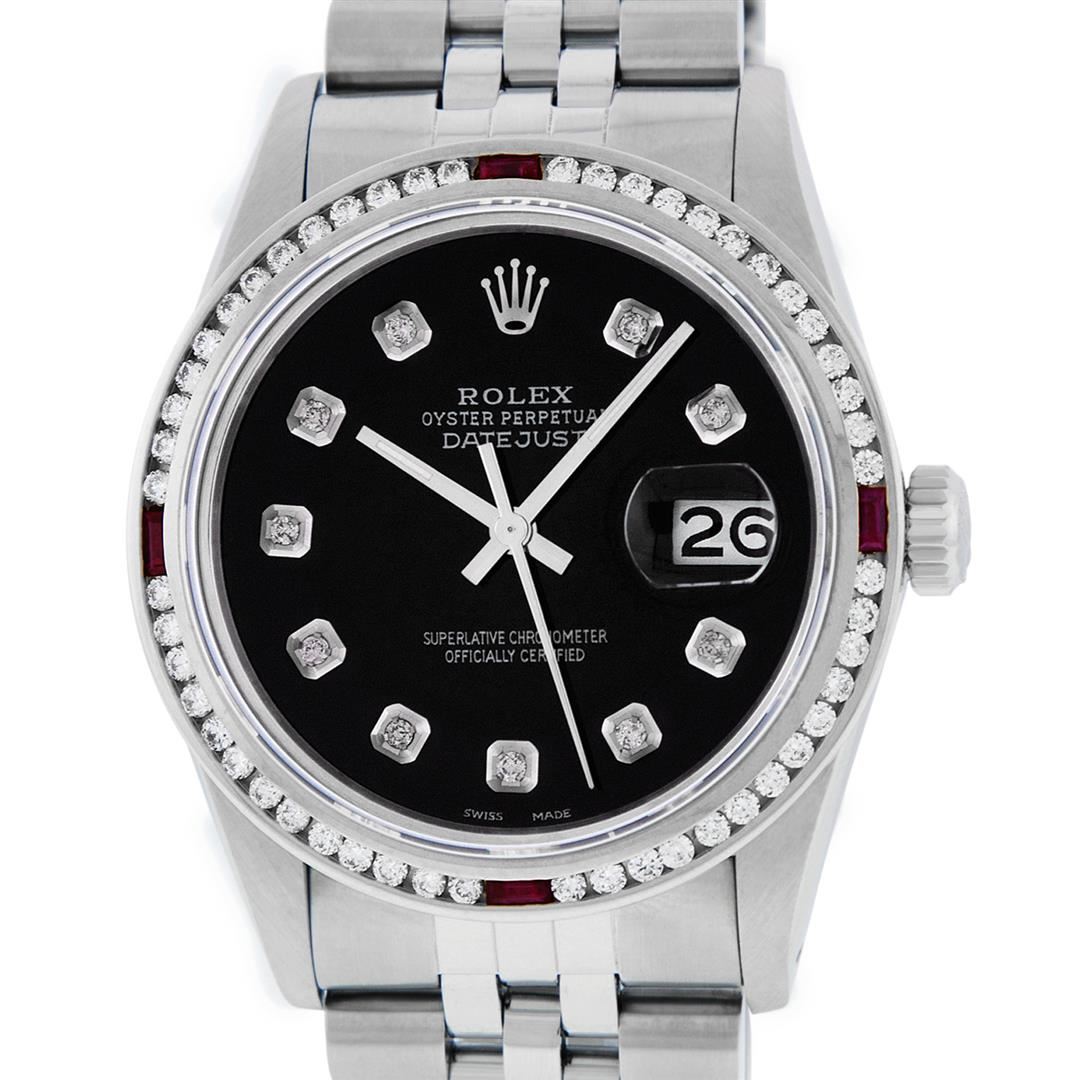 One Mens Pre Owned Stainless Steel Rolex Datejust Polished Bright with Satin Finish, This Watch Has Been Serviced & Electronically Tested, Stainless Steel Case: 36mm, Stainless Steel Crown, Custom Bezel: New 18K White Gold Ruby Channel Set Diamond Bezel, Diamond + Gem Count: 52 Diamonds + 4 Rubies, Clarity: SI-VS, Color: G to H. Custom Crystal: New Sapphire Magnified Date. Custom Hands: New Luminescent Hands. Rolex Movement: Automatic Winding Movement. Custom Dial: Refinished Black Diamond Dial, Diamond Count: 10 Diamonds in Dial, Diamond Color: G To H In Color, Clarity: SI-VS. Date Window: 3 O'Clock Position Date Display, Quickset, Model: Datejust, Condition: G-6 Extra Fine. Rolex Bracelet: Stainless Steel Jubilee. Bracelet: 7.0 Inch Length, Adjustable. Standard Clasp, With Rolex Logo. This Watch Has Been Serviced Time Tested And Is In Excellent Condition It Is Free Of All Scratches And Dents.