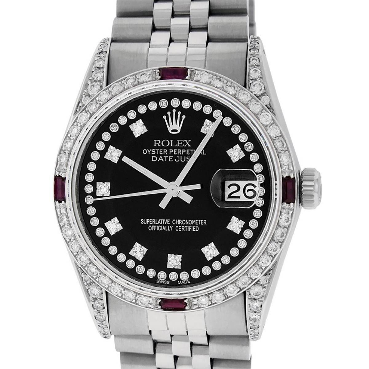 One Mens Rolex Datejust Polished Bright with Satin Finish, Serviced & Electronically Tested, Stainless Steel Case: 36mm, Custom Diamond Lugs: 28 Diamonds In Lugs, Color: G to H, Clarity: SI-VS. Stainless Steel Crown, Custom Bezel: 18K White Gold Diamond + Ruby Beadset, Diamond Count: 36 Diamonds + 4 Rubies, Total Weight 1.00 Carat, Clarity: SI-VS, Color: G to H. Custom Crystal: New Scratch Resistant Synthetic Sapphire Cyclops Lens. Custom Hands: New Luminescent Hands. Movement: Automatic Winding Movement. Custom Dial: Black String Diamond Dial, Stone Count: 58 Diamonds In Dial, Diamond Color: G To H In Color, Clarity: VS. Date Window: 3 O'Clock Position Date Display, Quickset, Model: Datejust Condition: G-6 Extra Fine. Bracelet: Stainless Steel Jubilee Band. Bright Polish & Satin Finish. 7.0 Inch Length, Adjustable. Standard Clasp, With Rolex Logo. This Watch Has Been Serviced And Polished And Its Free Of All Dents And Scratches.