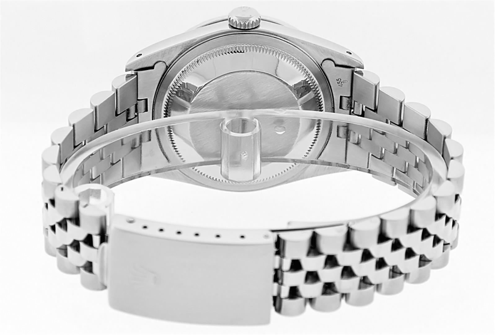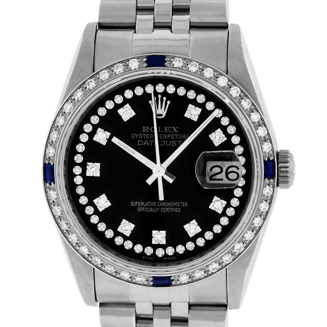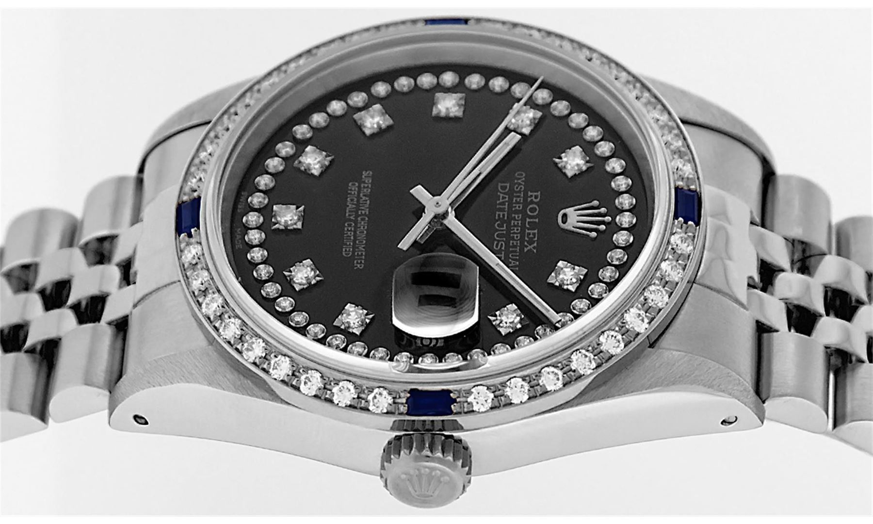 One Gents Rolex Datejust Polished, Serviced & Electronically Tested, Stainless Steel Case:36mm, Stainless Steel Crown, Custom Bezel: 18K White Gold Sapphire Beadset Bezel, Stone Count: 36 Diamonds + 4 Sapphires, Clarity: SI-VS, Color: G to H. Custom Crystal: Synthetic Sapphire Cyclops Lens. Movement: Automatic Winding Movement Caliber 3035. Custom Dial: Black String VVS Diamond Dial, Diamond Count: 58 Diamond In Dial, G To H In Color, Clarity: VS. Date Window: 3 O'Clock Position Date Display, Quickset, Model: Datejust. Condition: G-6 Extra Fine. Bracelet: Stainless Steel Jubilee Band. Bright Polish & Satin Finish. 7.0 Inch Length, Adjustable. Standard Clasp, With Rolex Logo.