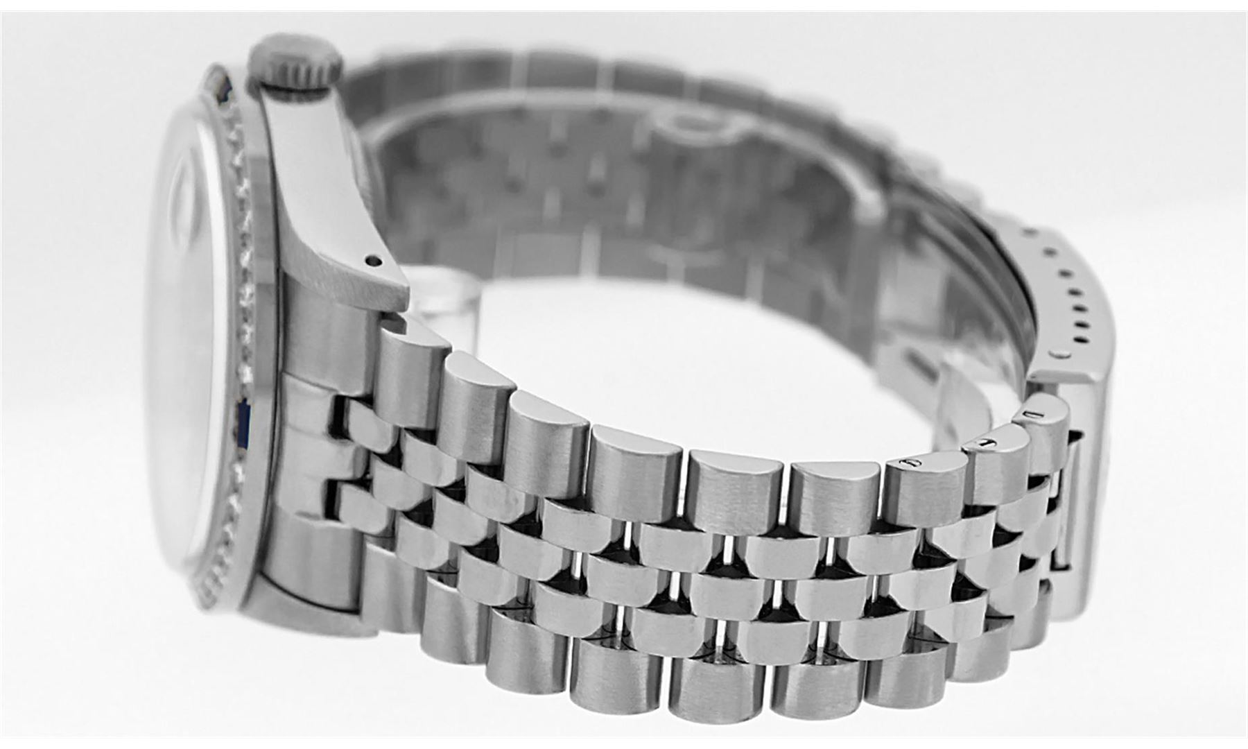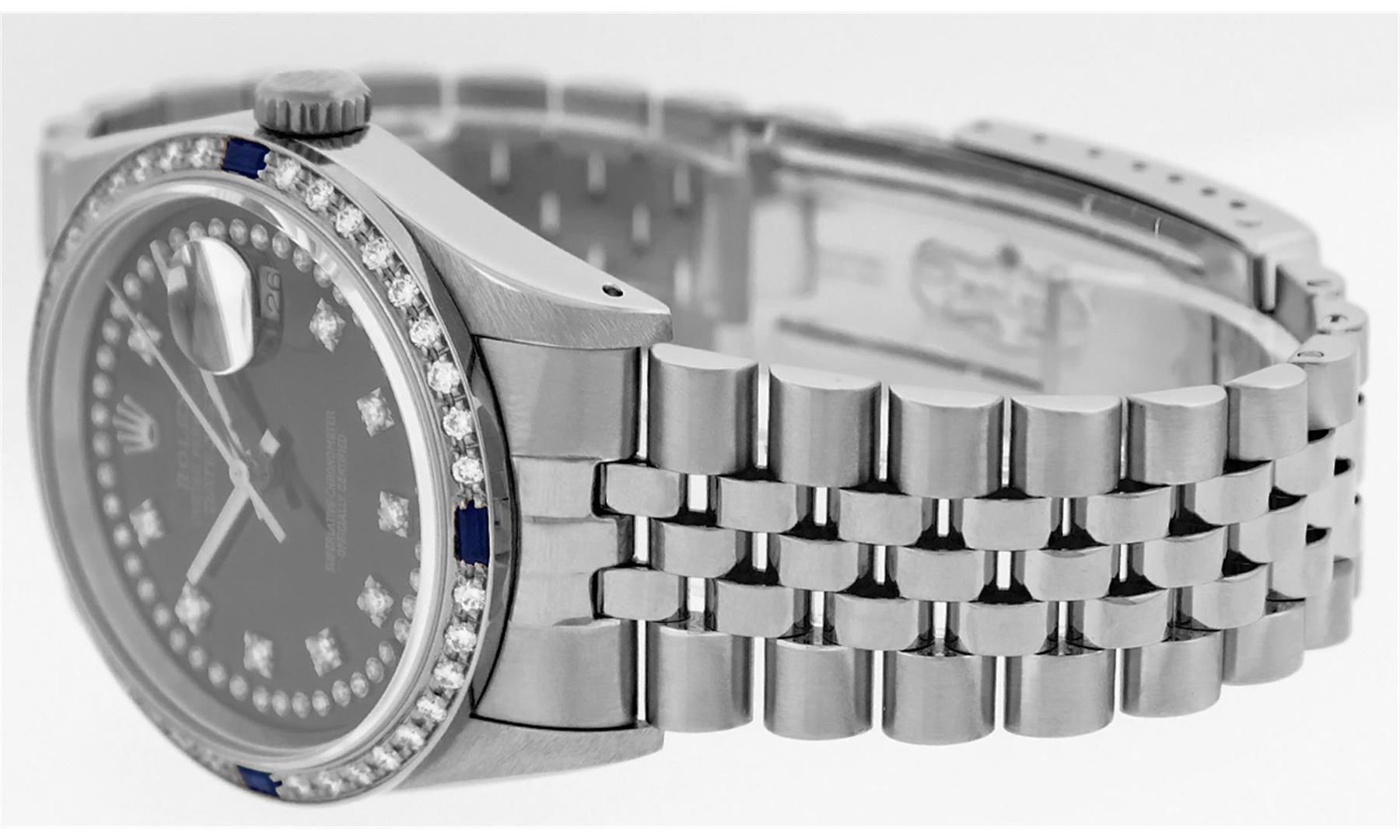 One Gents Rolex Datejust Polished, Serviced & Electronically Tested, Stainless Steel Case:36mm, Stainless Steel Crown, Custom Bezel: 18K White Gold Sapphire Beadset Bezel, Stone Count: 36 Diamonds + 4 Sapphires, Clarity: SI-VS, Color: G to H. Custom Crystal: Synthetic Sapphire Cyclops Lens. Movement: Automatic Winding Movement Caliber 3035. Custom Dial: Black String VVS Diamond Dial, Diamond Count: 58 Diamond In Dial, G To H In Color, Clarity: VS. Date Window: 3 O'Clock Position Date Display, Quickset, Model: Datejust. Condition: G-6 Extra Fine. Bracelet: Stainless Steel Jubilee Band. Bright Polish & Satin Finish. 7.0 Inch Length, Adjustable. Standard Clasp, With Rolex Logo.