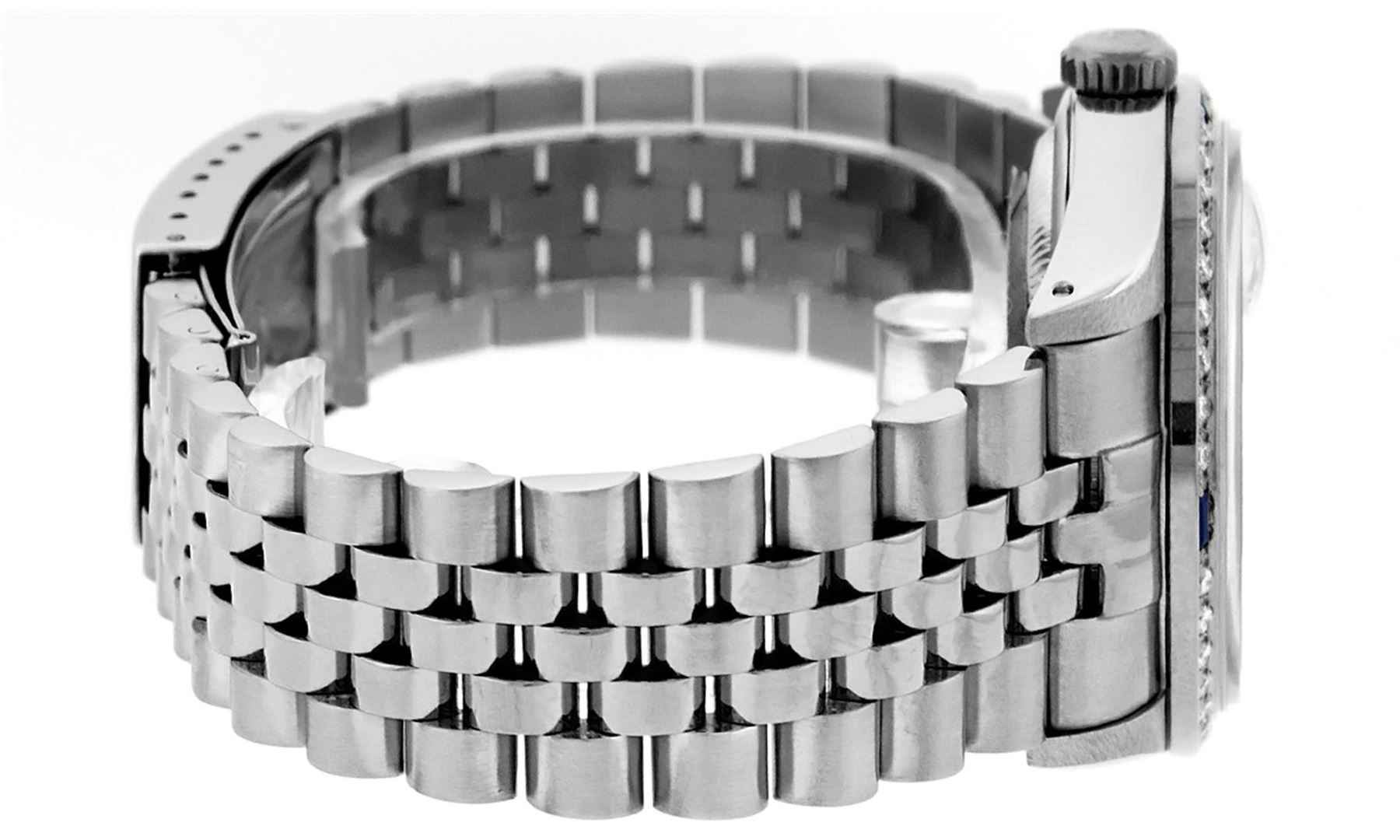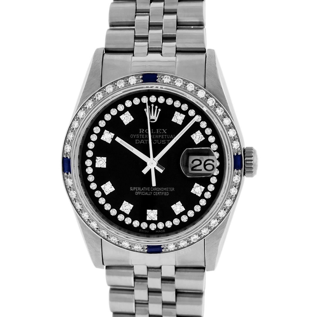 One Gents Rolex Datejust Polished, Serviced & Electronically Tested, Stainless Steel Case:36mm, Stainless Steel Crown, Custom Bezel: 18K White Gold Sapphire Beadset Bezel, Stone Count: 36 Diamonds + 4 Sapphires, Clarity: SI-VS, Color: G to H. Custom Crystal: Synthetic Sapphire Cyclops Lens. Movement: Automatic Winding Movement Caliber 3035. Custom Dial: Black String VVS Diamond Dial, Diamond Count: 58 Diamond In Dial, G To H In Color, Clarity: VS. Date Window: 3 O'Clock Position Date Display, Quickset, Model: Datejust. Condition: G-6 Extra Fine. Bracelet: Stainless Steel Jubilee Band. Bright Polish & Satin Finish. 7.0 Inch Length, Adjustable. Standard Clasp, With Rolex Logo.