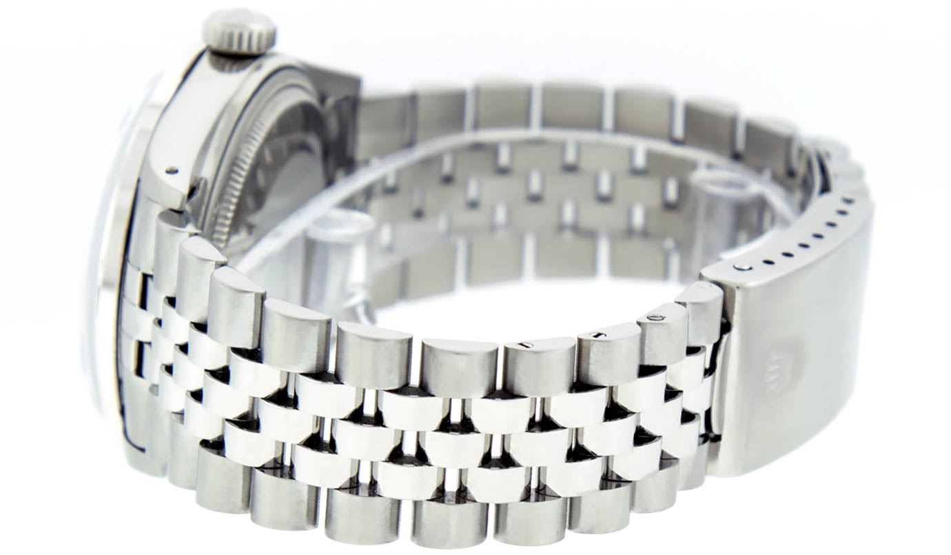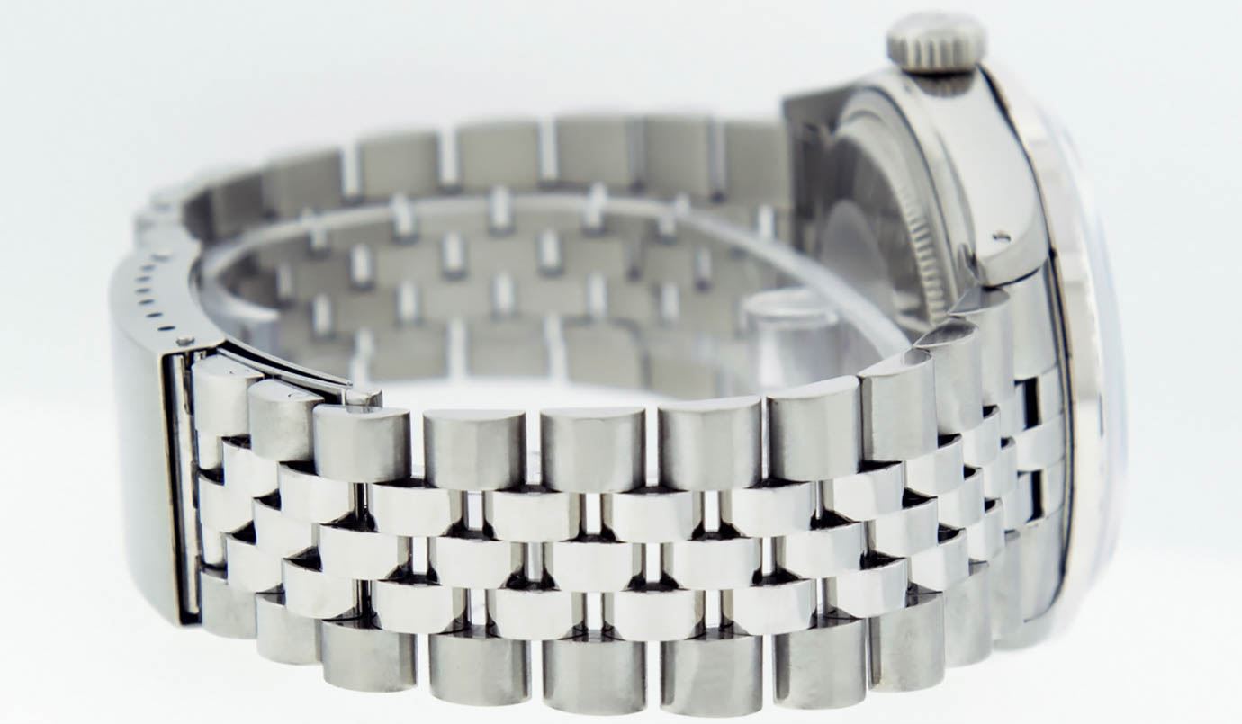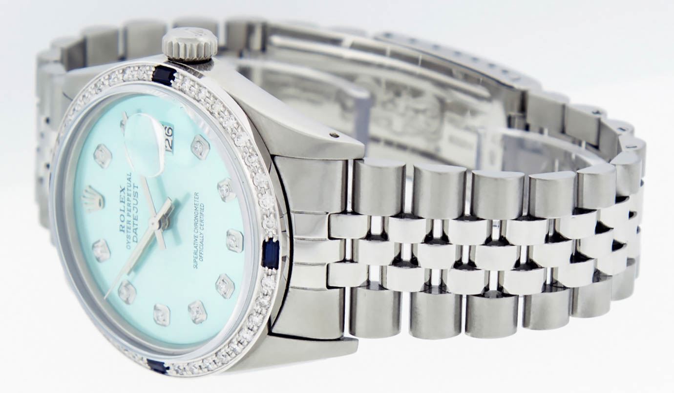 One Gents Stainless Steel Rolex Datejust Polished Bright with Satin Finish, Fully Serviced & Electronically Tested, Stainless Steel Case:36mm, Stainless Steel Crown, Custom Bezel: 18K White Gold Sapphire Beadset Diamond Bezel, Diamond Count: 36 Diamonds + 4 Sapphire, Total Weight 1.00 Carat, Clarity: SI-VS, Color: G to H. Custom Crystal: Synthetic Sapphire Cyclops Lens. Movement: Automatic Winding Movement Caliber 3035. Custom Dial: Ice Blue Diamond Dial, Diamond Count: 10 Diamonds in Dial, G To H In Color, Clarity: SI-VS. Date Window: 3 O'Clock Position Date Display, Quickset, Model: Datejust, Condition: G-6 Extra Fine. Bracelet: Stainless Steel Jubilee. Bright Polish & Satin Finish. 7.0 Inch Length, Adjustable. Standard Clasp, With Rolex Logo.