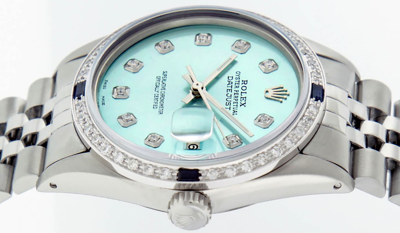 One Gents Stainless Steel Rolex Datejust Polished Bright with Satin Finish, Fully Serviced & Electronically Tested, Stainless Steel Case:36mm, Stainless Steel Crown, Custom Bezel: 18K White Gold Sapphire Beadset Diamond Bezel, Diamond Count: 36 Diamonds + 4 Sapphire, Total Weight 1.00 Carat, Clarity: SI-VS, Color: G to H. Custom Crystal: Synthetic Sapphire Cyclops Lens. Movement: Automatic Winding Movement Caliber 3035. Custom Dial: Ice Blue Diamond Dial, Diamond Count: 10 Diamonds in Dial, G To H In Color, Clarity: SI-VS. Date Window: 3 O'Clock Position Date Display, Quickset, Model: Datejust, Condition: G-6 Extra Fine. Bracelet: Stainless Steel Jubilee. Bright Polish & Satin Finish. 7.0 Inch Length, Adjustable. Standard Clasp, With Rolex Logo.