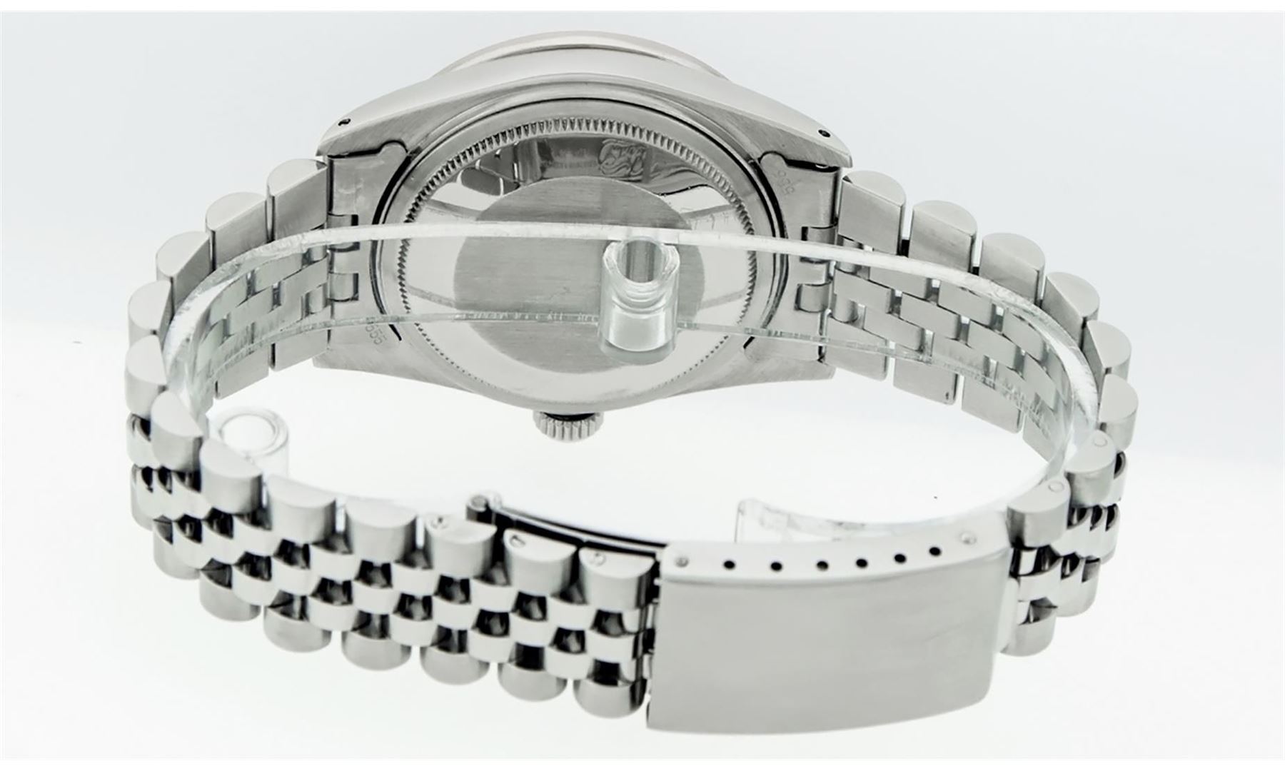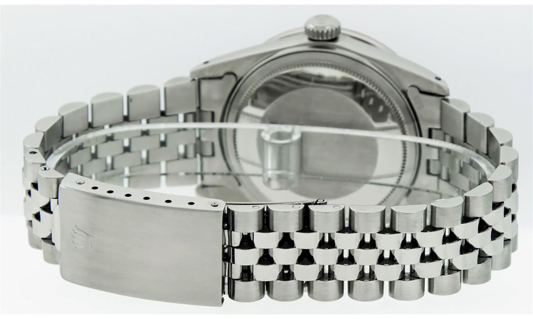 One Mens Pre Owned Rolex Datejust Polished Bright with Satin Finish, Serviced & Electronically Tested, Rolex Stainless Steel Case: 36mm, Custom Diamond Lugs: 28 Diamonds In Lugs, Color: G to H, Clarity: SI-VS. Rolex Stainless Steel Crown, Custom Bezel: New 18K White Gold Diamond + Sapphire Beadset, Diamond Count: 36 Diamonds + 4 Sapphires, Clarity: SI-VS, Color: G to H. Custom Crystal: New Sapphire With Magnified Date Window. Custom Hands: New Luminescent Hands. Rolex Movement: Automatic Winding Movement. Custom Dial: Refinished To Blue With Custom Added Diamonds, Stone Count: 10 Diamonds, Diamond Color: G To H In Color, Clarity: SI-VS. Date Window: 3 O'Clock Position Date Display, Quickset, Model: Datejust Condition: G-6 Extra Fine. Rolex Bracelet: Stainless Steel Jubilee Band. Bright Polish & Satin Finish. 7.0 Inch Length, Adjustable. Standard Clasp, With Rolex Logo. This Watch Has Been Serviced And Polished And Its Free Of All Dents And Scratches.