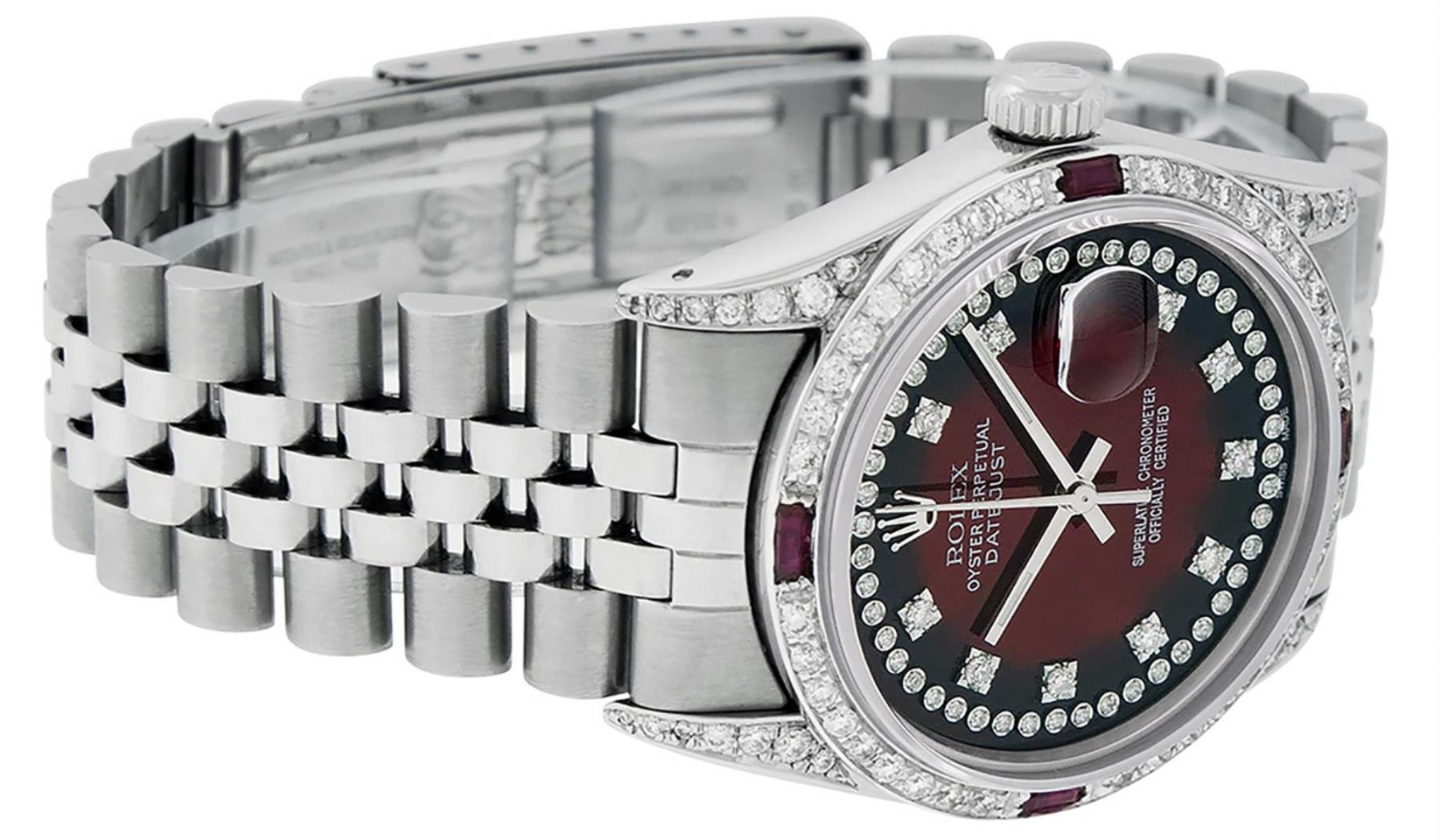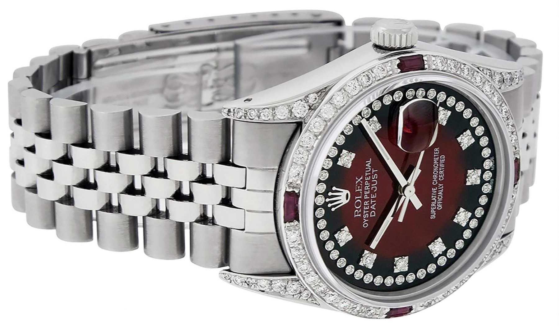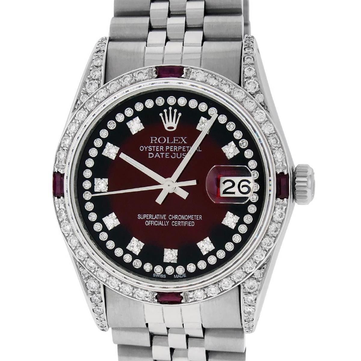 One Mens Rolex Datejust Polished Bright with Satin Finish, Serviced & Electronically Tested, Stainless Steel Case: 36mm, Custom Diamond Lugs: 28 Diamonds In Lugs, Color: G to H, Clarity: SI-VS. Stainless Steel Crown, Custom Bezel: New 14K White Gold 2.75 Carat Princess Cut Diamond Bezel, Diamond Count: 53 Diamonds, Total Weight 2.75 Carat, Clarity: SI-VS, Color: G to H. Custom Crystal: New Scratch Resistant Synthetic Sapphire Cyclops Lens. Custom Hands: New Luminescent Hands. Movement: Automatic Winding Movement. Custom Dial: Mother Of Pearl Diamond Dial, Diamond Count: 10 Diamonds In Dial, Diamond Color: G To H In Color, Clarity: SI-VS. Date Window: 3 O'Clock Position Date Display, Quickset, Model: Datejust Condition: G-6 Extra Fine. Bracelet: Stainless Steel Jubilee Band. Bright Polish & Satin Finish. 7.0 Inch Length, Adjustable. Standard Clasp, With Rolex Logo. This Watch Has Been Serviced And Polished And Its Free Of All Dents And Scratches.
