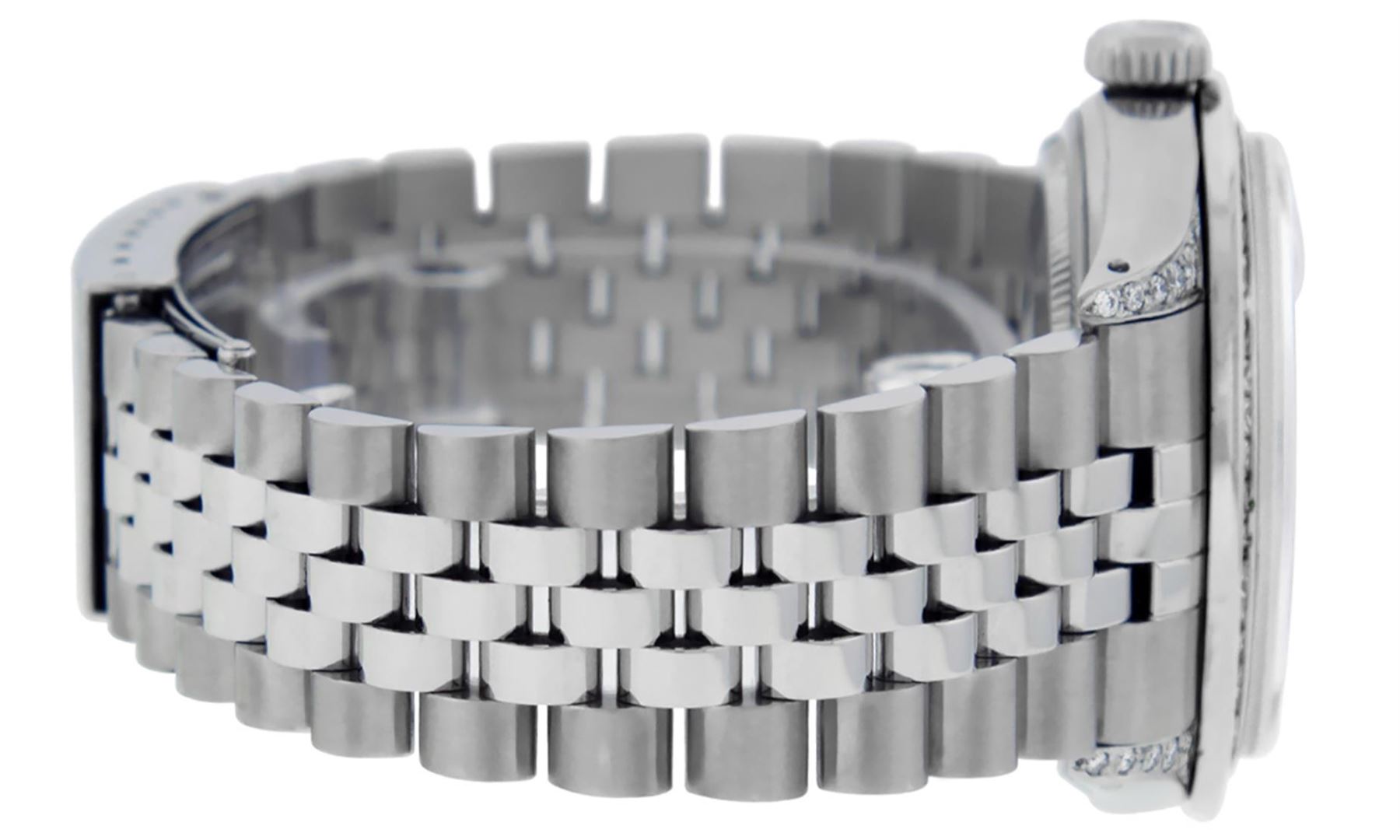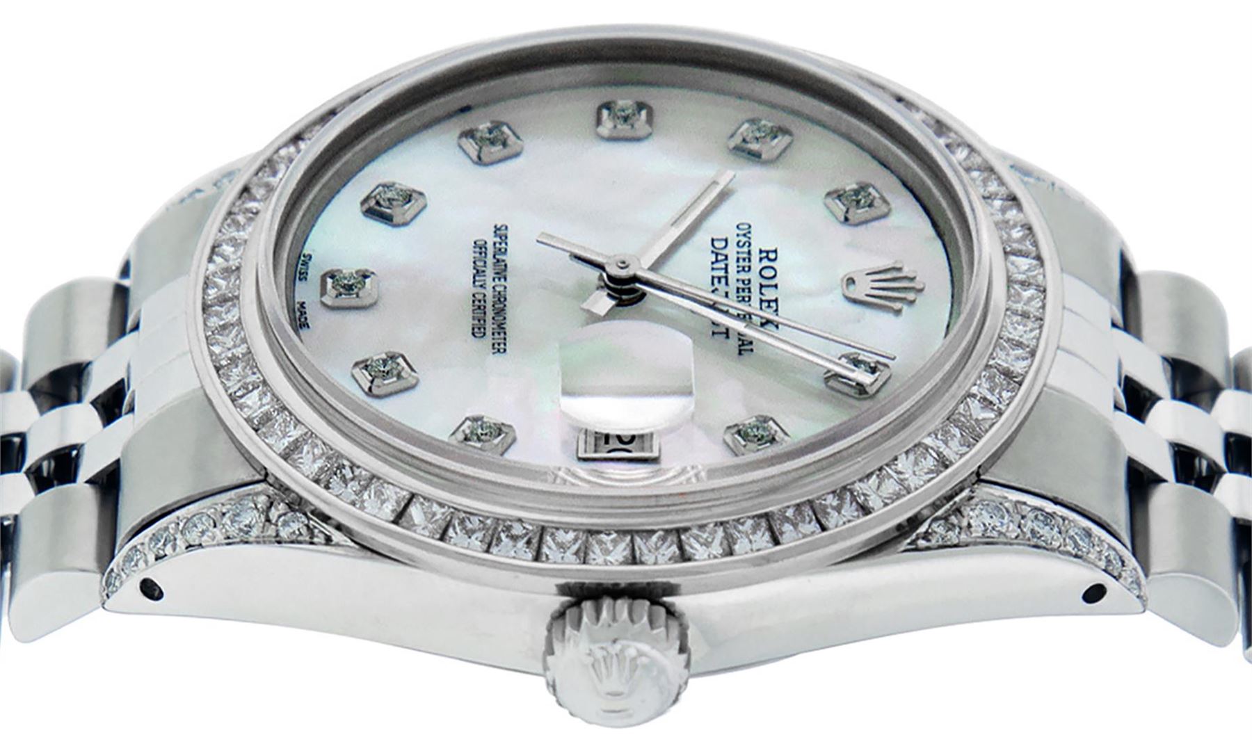 One Mens Pre Owned Rolex Datejust Polished Bright with Satin Finish, Serviced & Electronically Tested, Stainless Steel Case: 36mm, Custom Diamond Lugs: 28 Diamonds In Lugs. Stainless Steel Crown, Custom Bezel: New 14K White Gold 2.75 Carat Princess Cut Diamond Bezel, Diamond Count: 53 Diamonds, Total Weight 2.75 Carat. Custom Crystal: New Sapphire With Date Window. Custom Hands: New Luminescent Hands. Rolex Movement: Automatic Winding Movement. Custom Dial: Mother Of Pearl With Custom Diamond Hour Markers, Diamond Count: 10 Diamonds In Dial. Date Window: 3 O'Clock Position Date Display, Quickset, Model: Datejust Condition: G-6 Extra Fine. Rolex Bracelet: Stainless Steel Jubilee Band. Bright Polish & Satin Finish. 7.0 Inch Length, Adjustable. Standard Clasp, With Rolex Logo. This Watch Has Been Serviced And Polished And Its Free Of All Dents And Scratches.