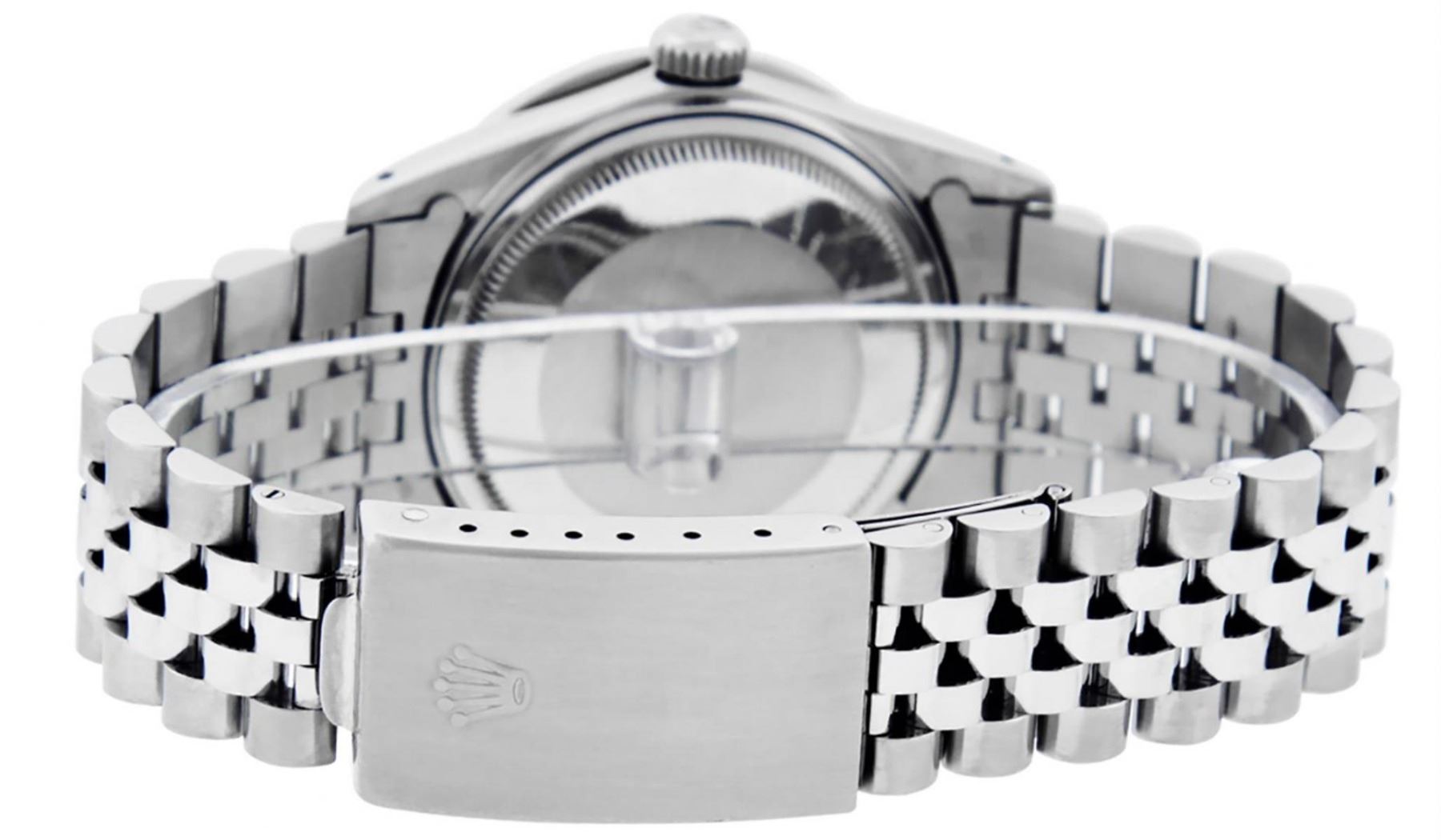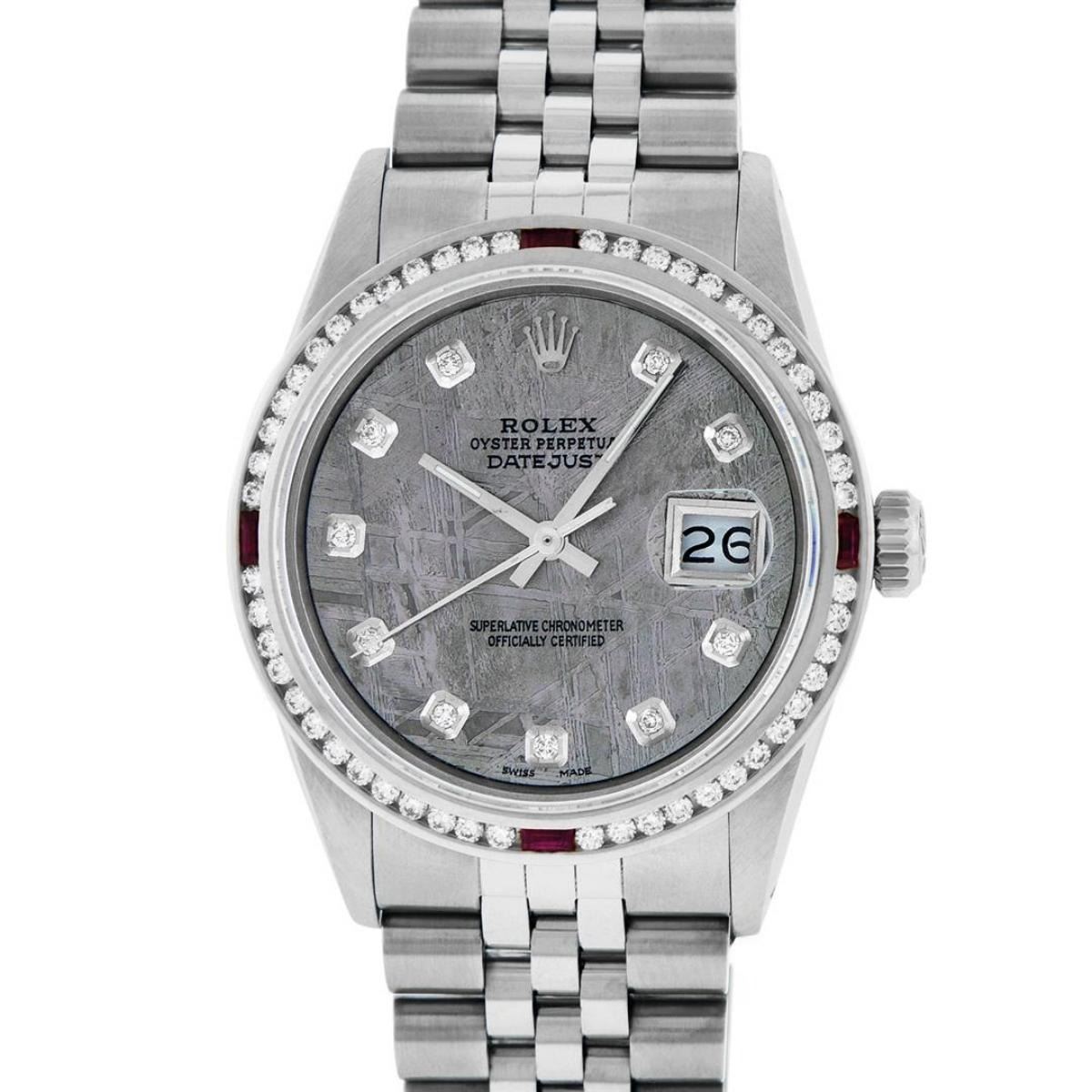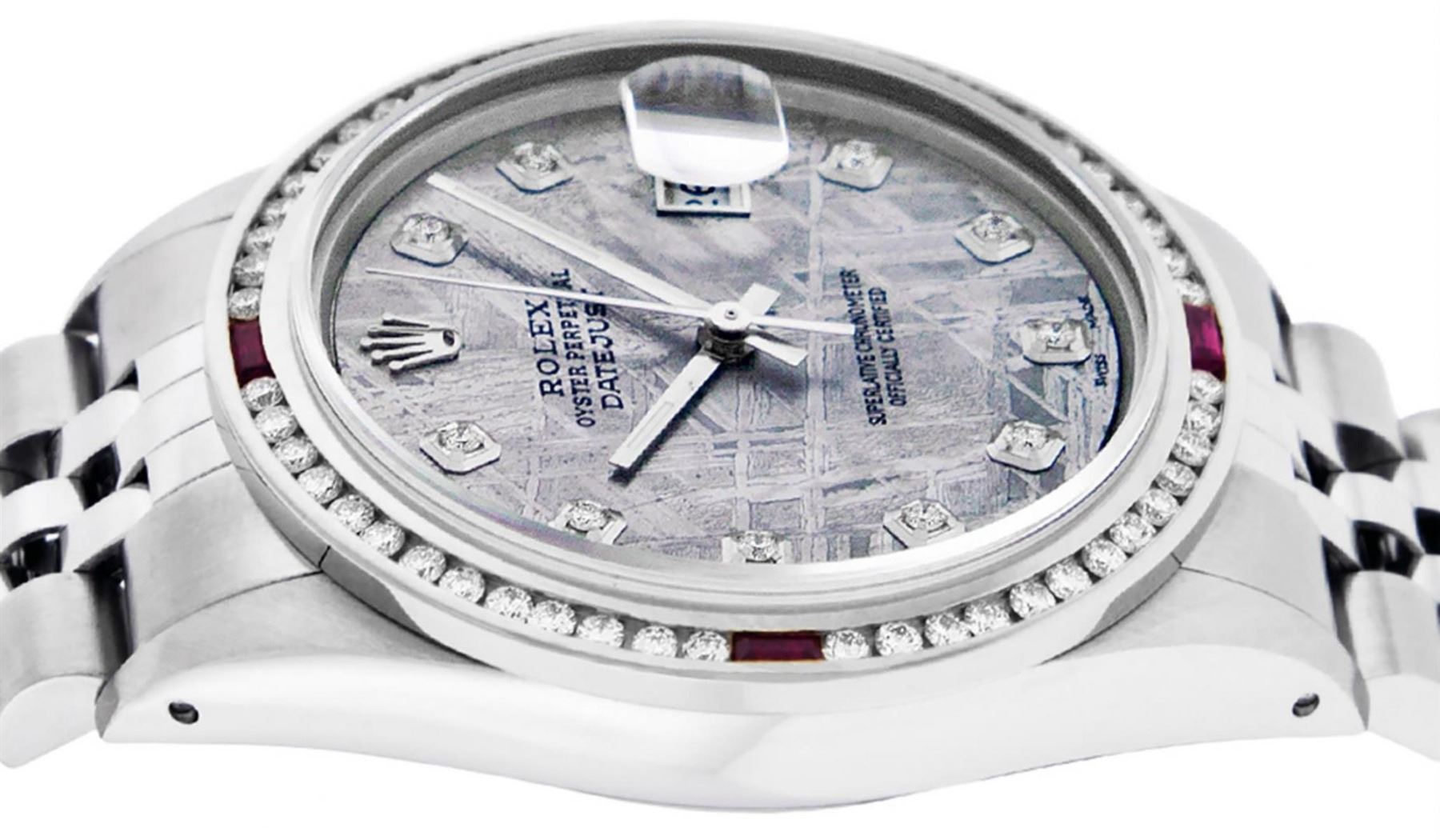 One Mens Stainless Steel Rolex Datejust Polished Bright with Satin Finish, This Watch Has Been Serviced & Electronically Tested, Stainless Steel Case: 36mm, Stainless Steel Crown, Custom Bezel: New 18K White Gold Ruby Channel Set Diamond Bezel, Diamond + Gem Count: 52 Diamonds + 4 Rubies, Total Weight 1.30 Carat, Clarity: SI-VS, Color: G to H. Custom Crystal: New Scratch Resistant Synthetic Sapphire Cyclops Lens. Custom Hands: New Luminescent Hands. Movement: Automatic Winding Movement. Custom Dial: Meteorite Diamond Dial, Diamond Count: 10 Diamonds in Dial, Diamond Color: G To H In Color, Clarity: SI-VS. Date Window: 3 O'Clock Position Date Display, Quickset, Model: Datejust, Condition: G-6 Extra Fine. Bracelet: Stainless Steel Jubilee Band. Bracelet: 7.0 Inch Length, Adjustable. Standard Clasp, With Rolex Logo. This Watch Has Been Serviced Time Tested And Is In Excellent Condition It Is Free Of All Scratches And Dents.