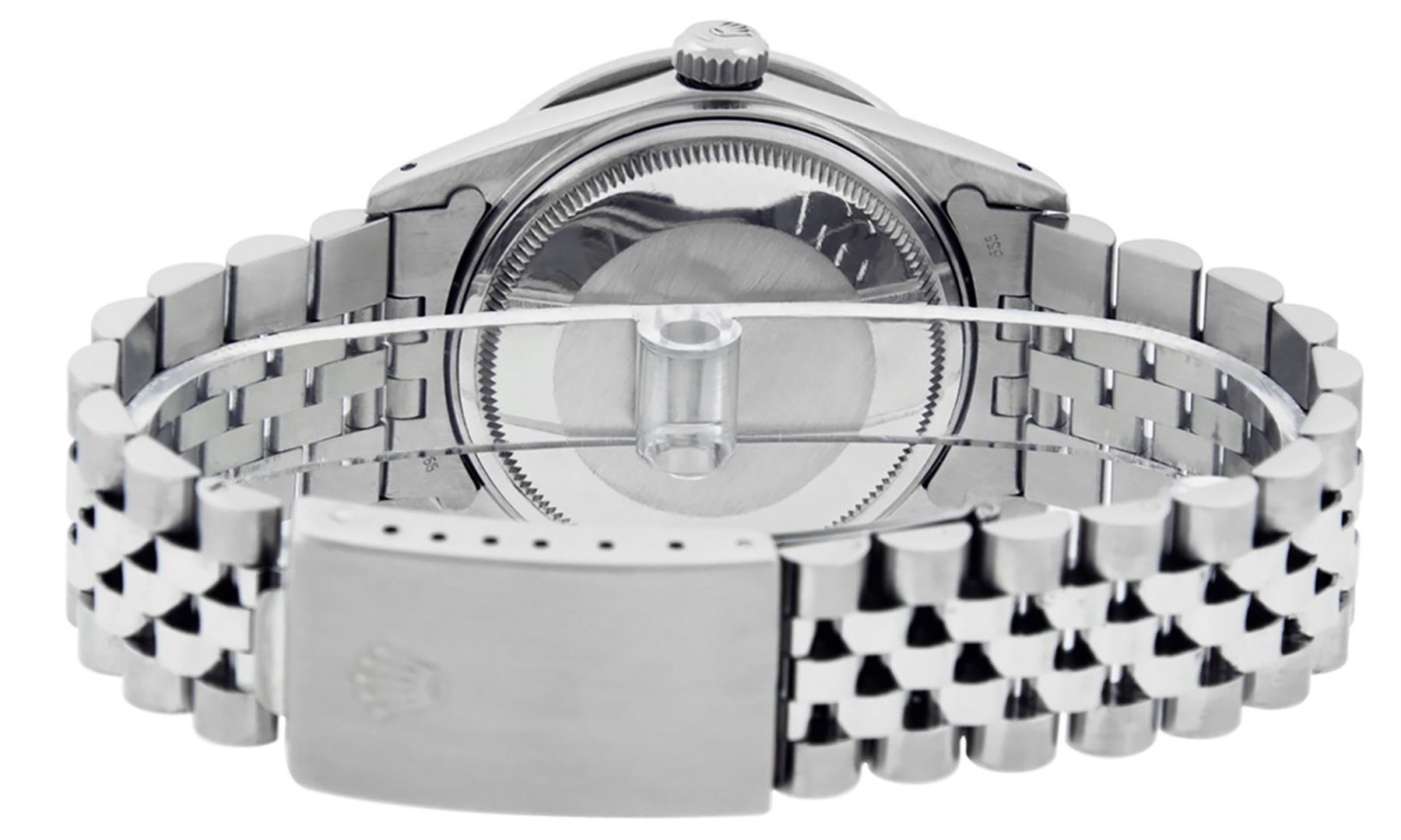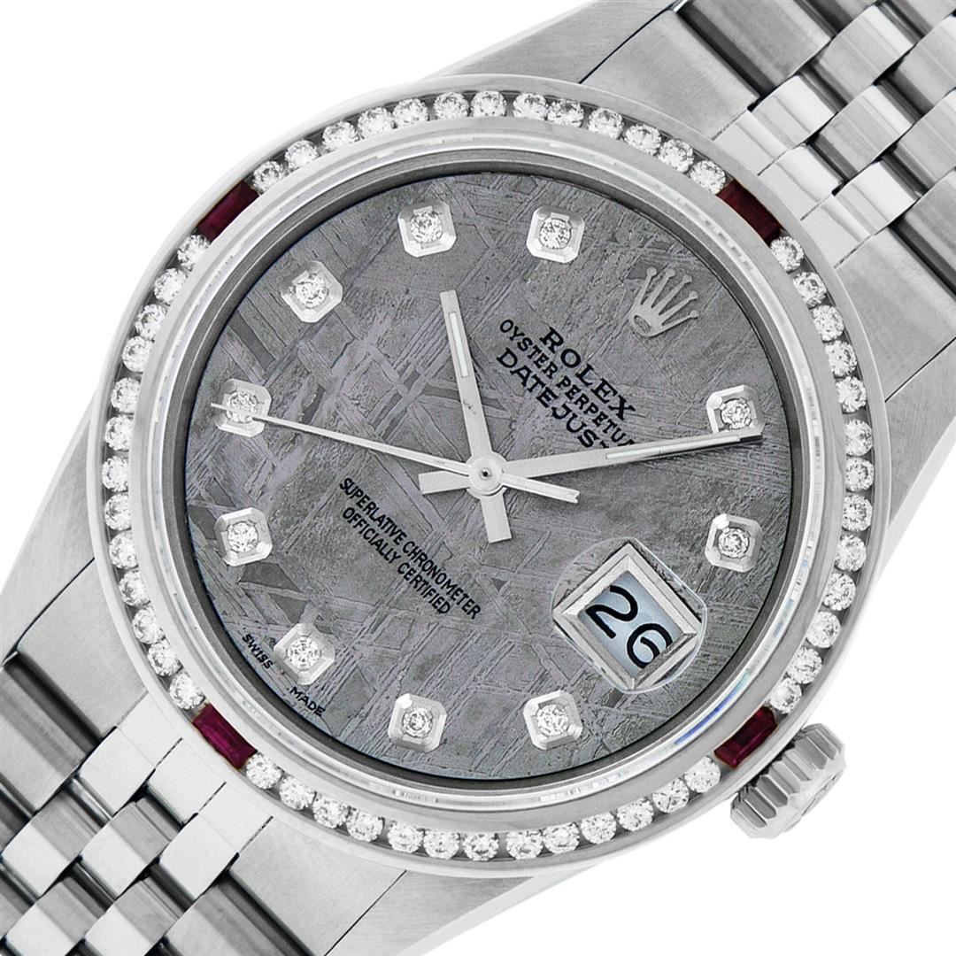 One Mens Stainless Steel Rolex Datejust Polished Bright with Satin Finish, This Watch Has Been Serviced & Electronically Tested, Stainless Steel Case: 36mm, Stainless Steel Crown, Custom Bezel: New 18K White Gold Ruby Channel Set Diamond Bezel, Diamond + Gem Count: 52 Diamonds + 4 Rubies, Total Weight 1.30 Carat, Clarity: SI-VS, Color: G to H. Custom Crystal: New Scratch Resistant Synthetic Sapphire Cyclops Lens. Custom Hands: New Luminescent Hands. Movement: Automatic Winding Movement. Custom Dial: Meteorite Diamond Dial, Diamond Count: 10 Diamonds in Dial, Diamond Color: G To H In Color, Clarity: SI-VS. Date Window: 3 O'Clock Position Date Display, Quickset, Model: Datejust, Condition: G-6 Extra Fine. Bracelet: Stainless Steel Jubilee Band. Bracelet: 7.0 Inch Length, Adjustable. Standard Clasp, With Rolex Logo. This Watch Has Been Serviced Time Tested And Is In Excellent Condition It Is Free Of All Scratches And Dents.