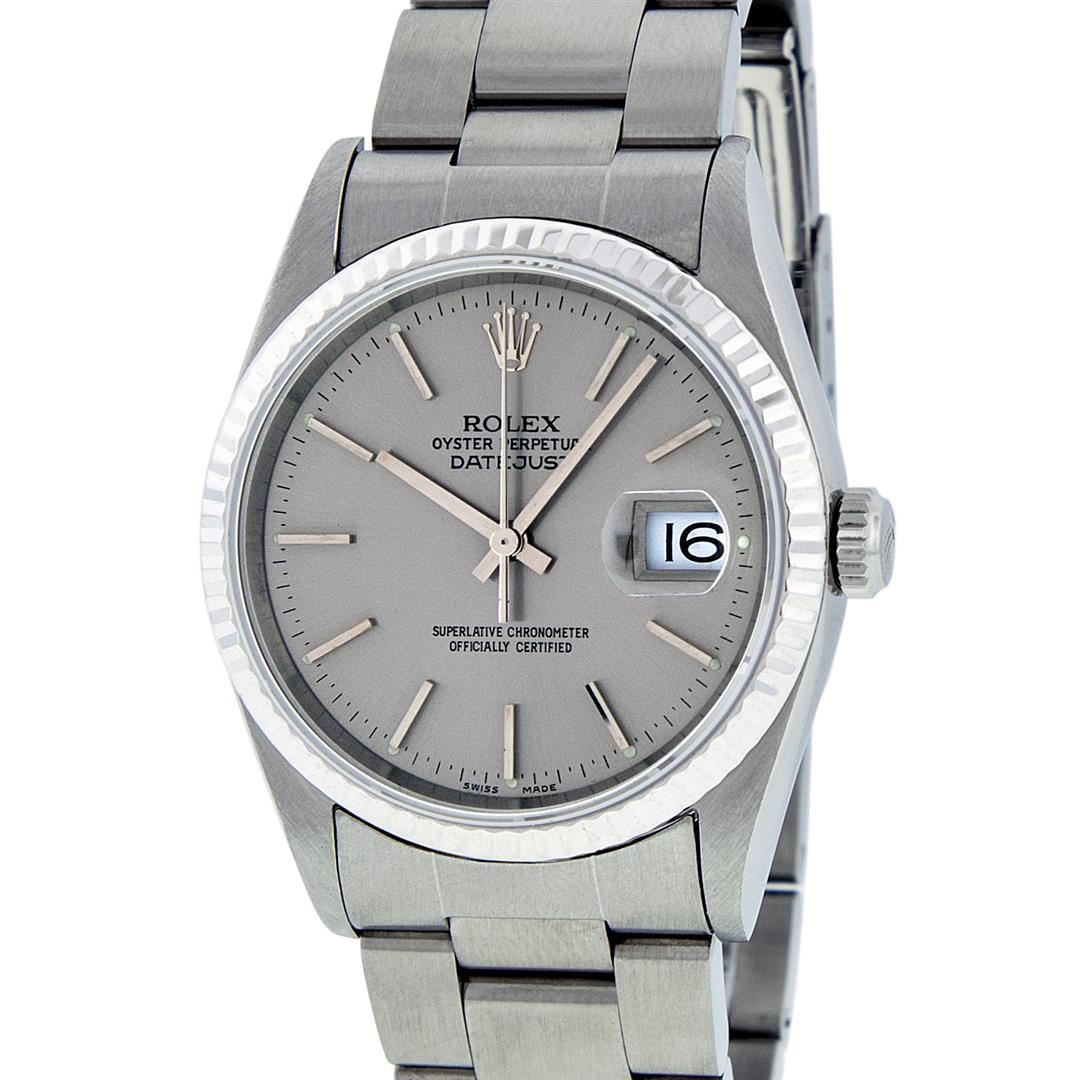 One Gents Rolex Stainless Steel Datejust Polished Bright with Satin Finish, Serviced & Electronically Tested, Stainless Steel Case: 36mm, Stainless Steel Crown, Bezel: 18K White Gold Fluted Bezel. Crystal: Synthetic Sapphire Cyclops Lens. Movement: Automatic Winding Movement Caliber 3135. Custom Dial: Slate Grey Index With Line Track And Lumi Dot. Date Window: 3 O'Clock Position Date Display, Quickset, Model: 16234 Quickset Datejust. Condition: G-6 Extra Fine. Bracelet:Stainless Steel Oyster Band. Bright Polish & Satin Finish. 7.0 Inch Length, Adjustable. Standard Clasp, With Rolex Logo.