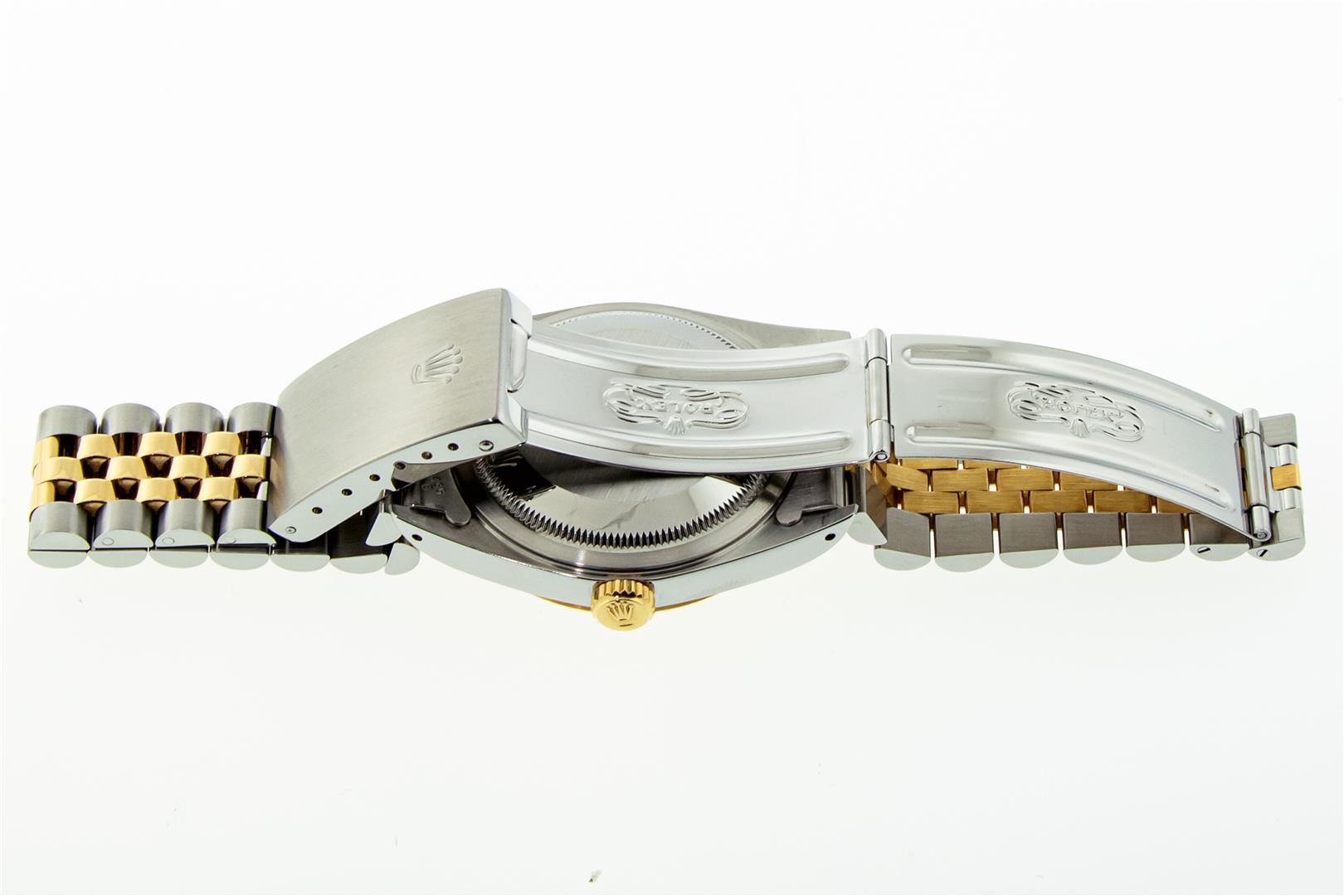 One Mens Pre Owned 18K Yellow Gold And Stainless Steel Rolex Datejust Polished, Serviced & Electronically Tested, Rolex Yellow Gold & Stainless Steel Case: 36mm, Rolex Yellow Gold Crown, Rolex Bezel: 18K Yellow Gold Fluted Bezel. Crystal: Sapphire With Magnified Date Window. Hands: Luminescent Hands. Rolex Movement: Automatic Winding Movement 3135. Rolex Dial: Champagne With VS Factory Diamond Hour Markers & Dash Track, Diamond Count: 10 Diamonds in Dial, VVS Clarity. Date Window: 3 O'Clock Position Date Display, Quickset, Model: Sapphire Datejust. Condition: G-6 Extra Fine. Rolex Bracelet: Two Tone 18K Yellow Gold & Stainless Steel Jubilee Band. Bright Polish. 7.0 Inch Length, Adjustable. Standard Clasp, With Rolex Logo. This Watch Has Been Serviced And Polished It Is Free Of All Scratches And Dents. This Watch Comes With A Rolex Box.