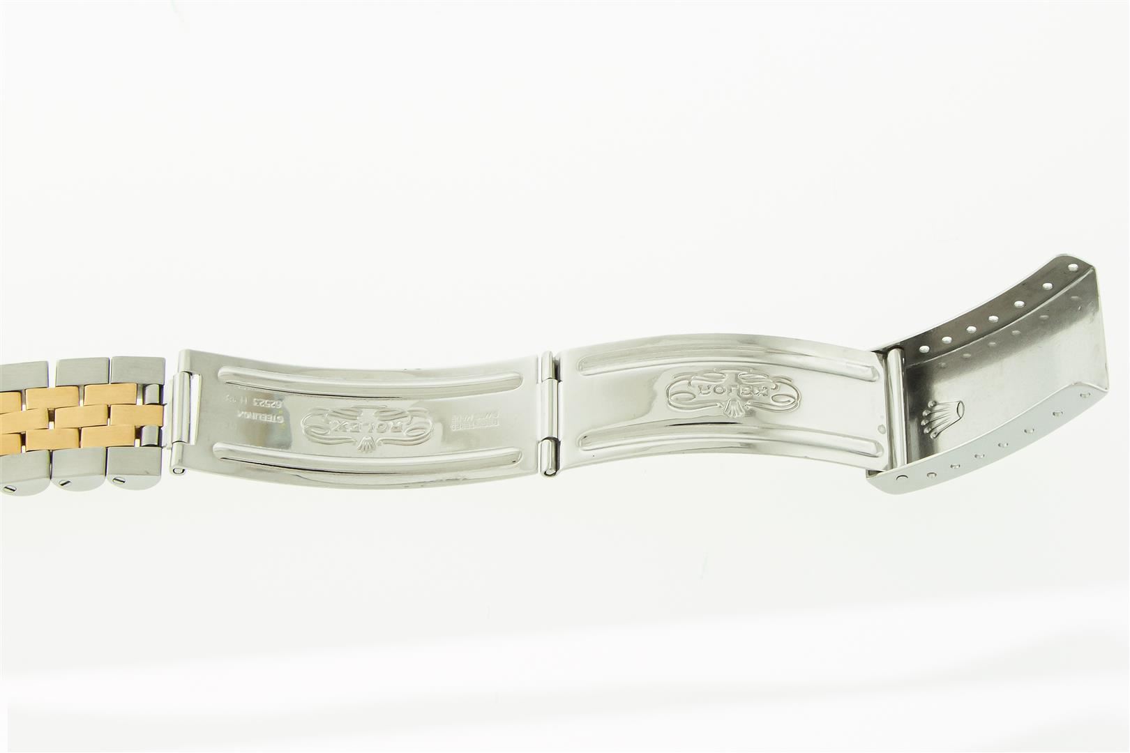 One Mens Pre Owned 18K Yellow Gold And Stainless Steel Rolex Datejust Polished, Serviced & Electronically Tested, Rolex Yellow Gold & Stainless Steel Case: 36mm, Rolex Yellow Gold Crown, Rolex Bezel: 18K Yellow Gold Fluted Bezel. Crystal: Sapphire With Magnified Date Window. Hands: Solid Hands. Rolex Movement: Automatic Winding Movement 3135. Rolex Dial: Champagne With VS Factory Diamond Hour Markers & Dash Track, Diamond Count: 10 Diamonds in Dial, VVS Clarity. Date Window: 3 O'Clock Position Date Display, Quickset, Model: Sapphire Datejust. Condition: G-6 Extra Fine. Rolex Bracelet: Two Tone 18K Yellow Gold & Stainless Steel Jubilee Band. Bright Polish. 7.0 Inch Length, Adjustable. Standard Clasp, With Rolex Logo. This Watch Has Been Serviced And Polished It Is Free Of All Scratches And Dents.