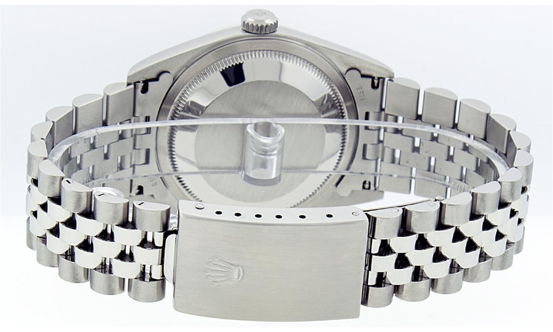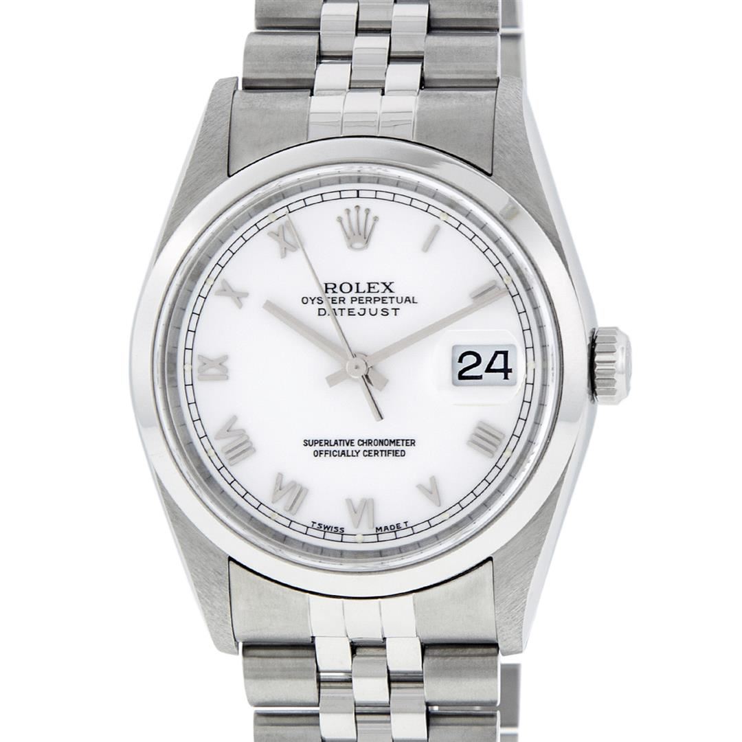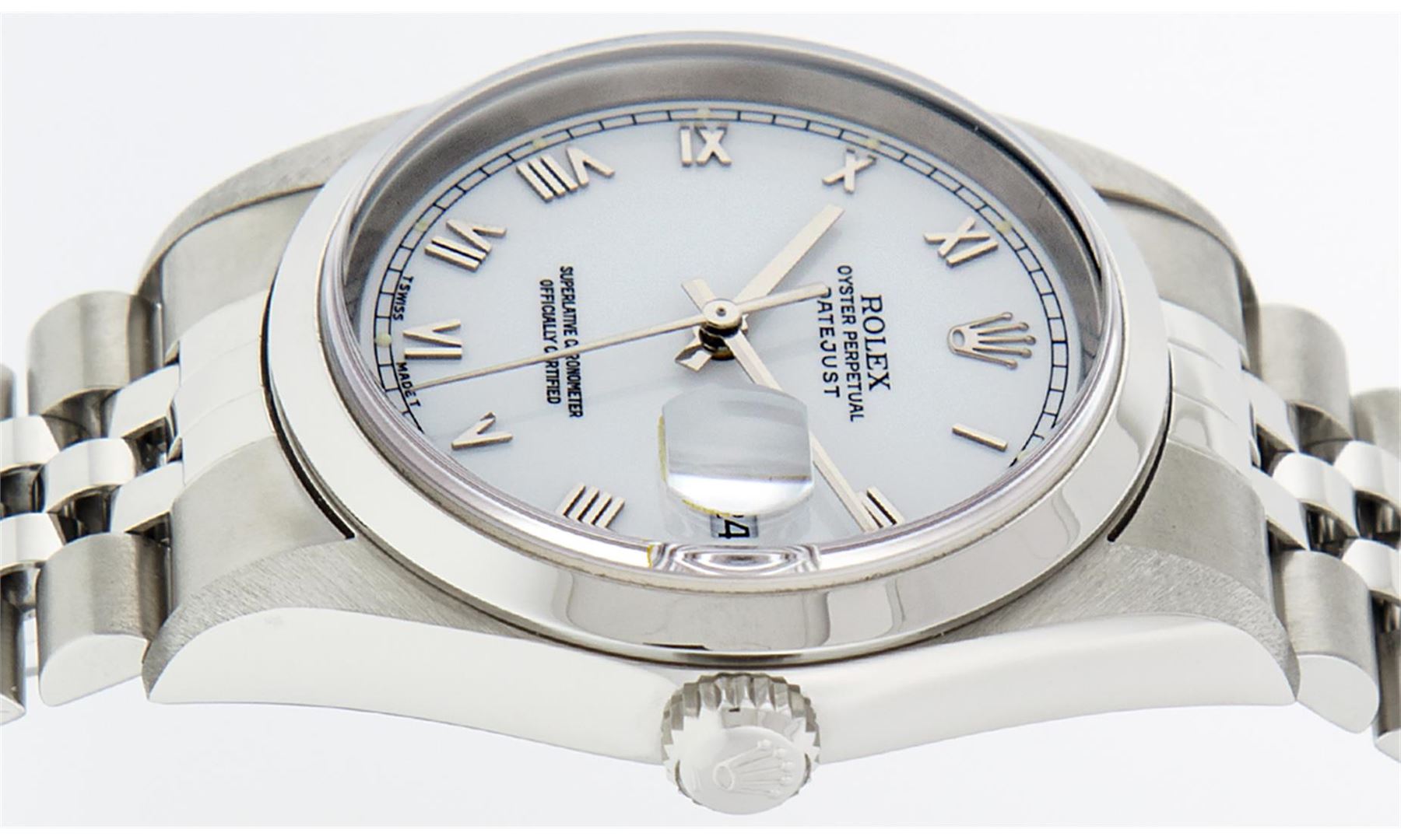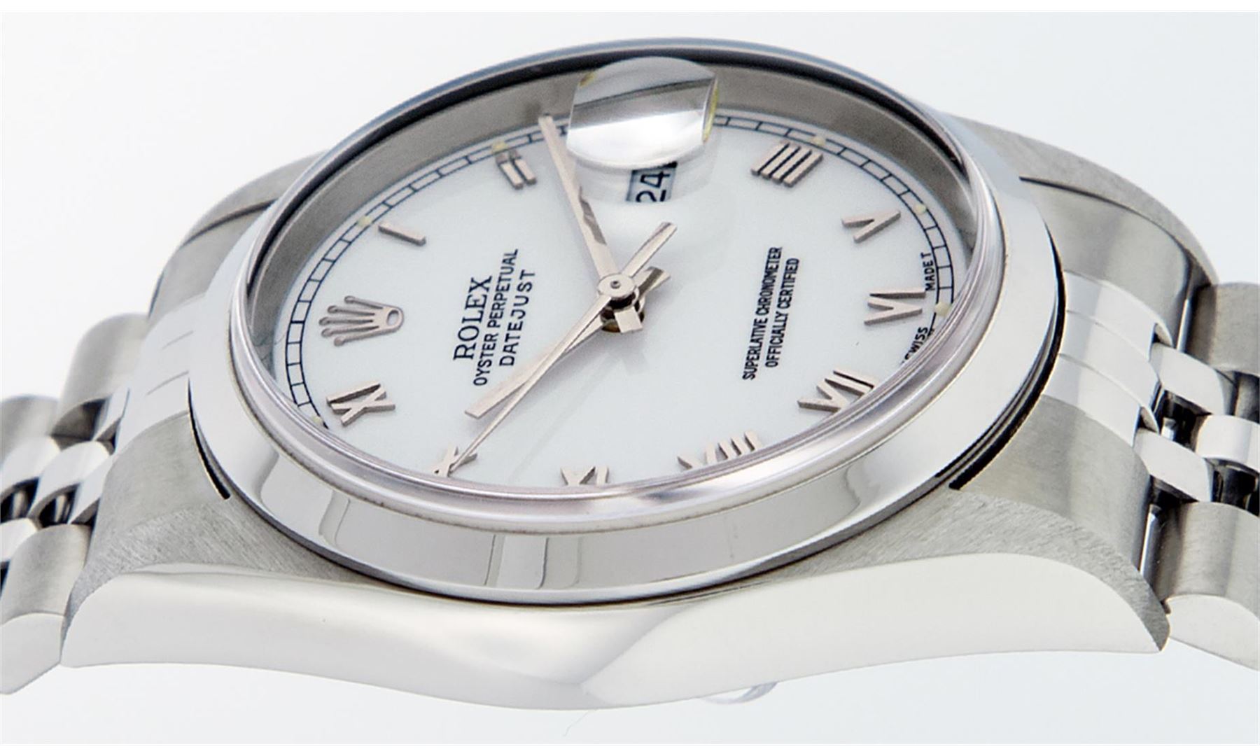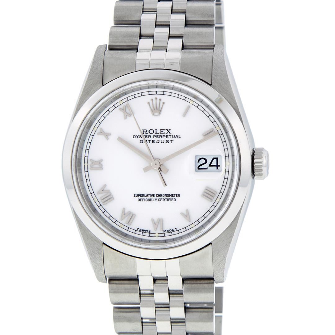 One Mens Pre Owned Rolex Stainless Steel Datejust Polished Bright with Satin Finish, Serviced & Electronically Tested, Rolex Stainless Steel Case: 36mm, Rolex Stainless Steel Crown, Rolex Bezel: Stainless Steel Smooth Bezel. Crystal: Sapphire Cyclops Lens. Rolex Movement: Automatic Winding Movement Caliber 3135. Rolex Dial: White Roman With Square Track and Lumi Dot. Date Window: 3 O'Clock Position Date Display, Quickset, Model: Quickset Datejust. Condition: G-6 Extra Fine. Rolex Bracelet: Stainless Steel Jubilee Band. Bright Polish & Satin Finish. 7.0 Inch Length, Adjustable. Standard Clasp, With Rolex Logo.